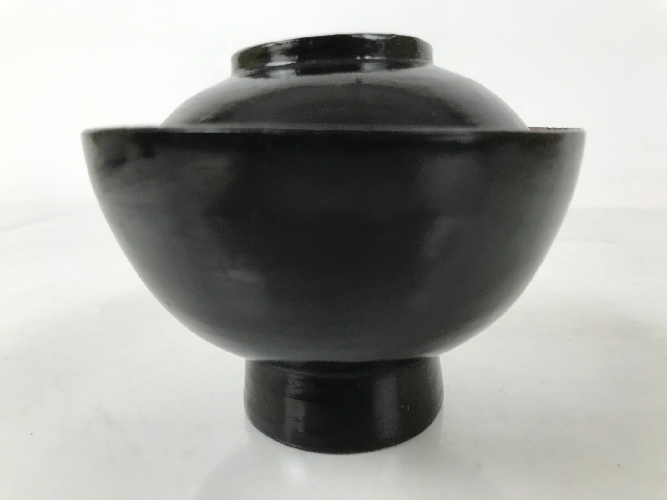 This vintage lacquered wooden bowl with a lid is an iconic black and classic addition to any traditional Japanese dinnerware set. It has a thick bottom and is getting thinner to the rim. This particular bowl is considered an owan, made for soups or rice. It can also be used for other dishes. The bowl is easy to hold while eating, and the lid fits loosely on the top with an overhang.