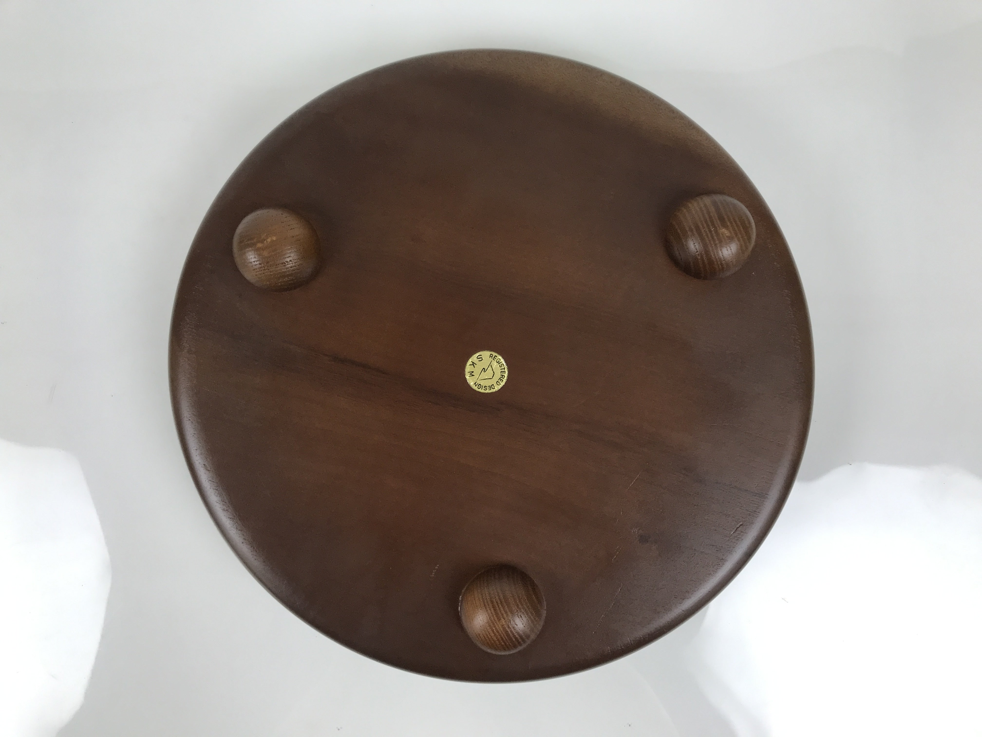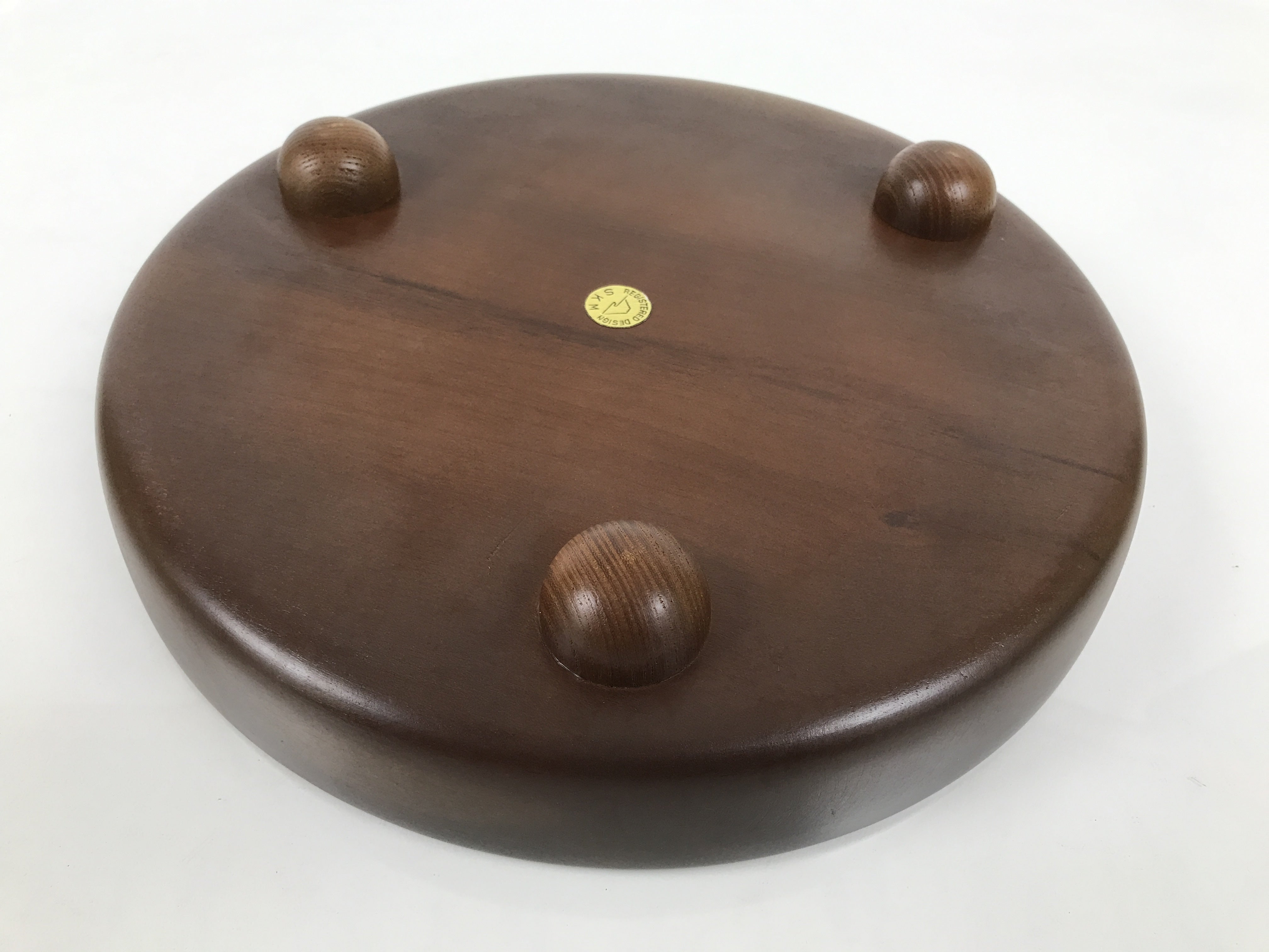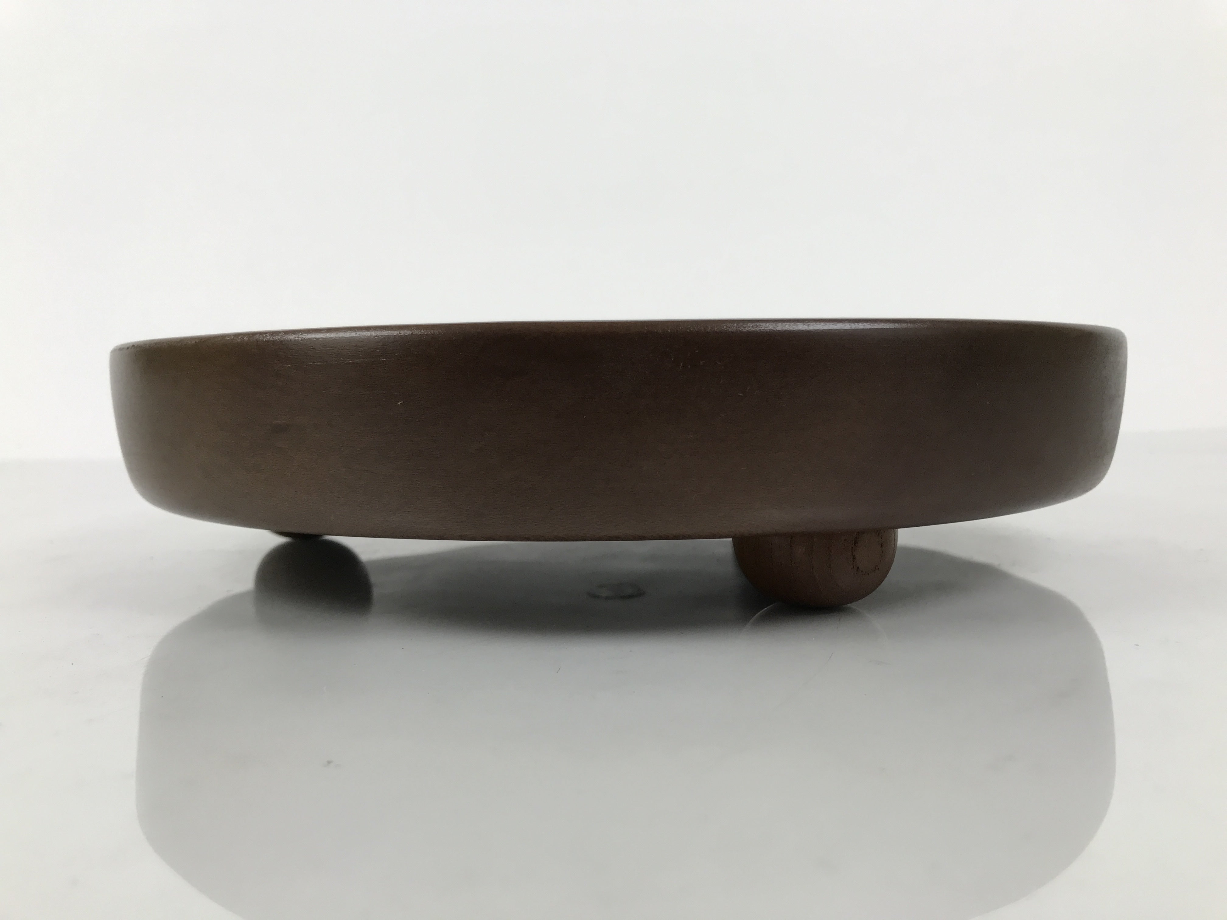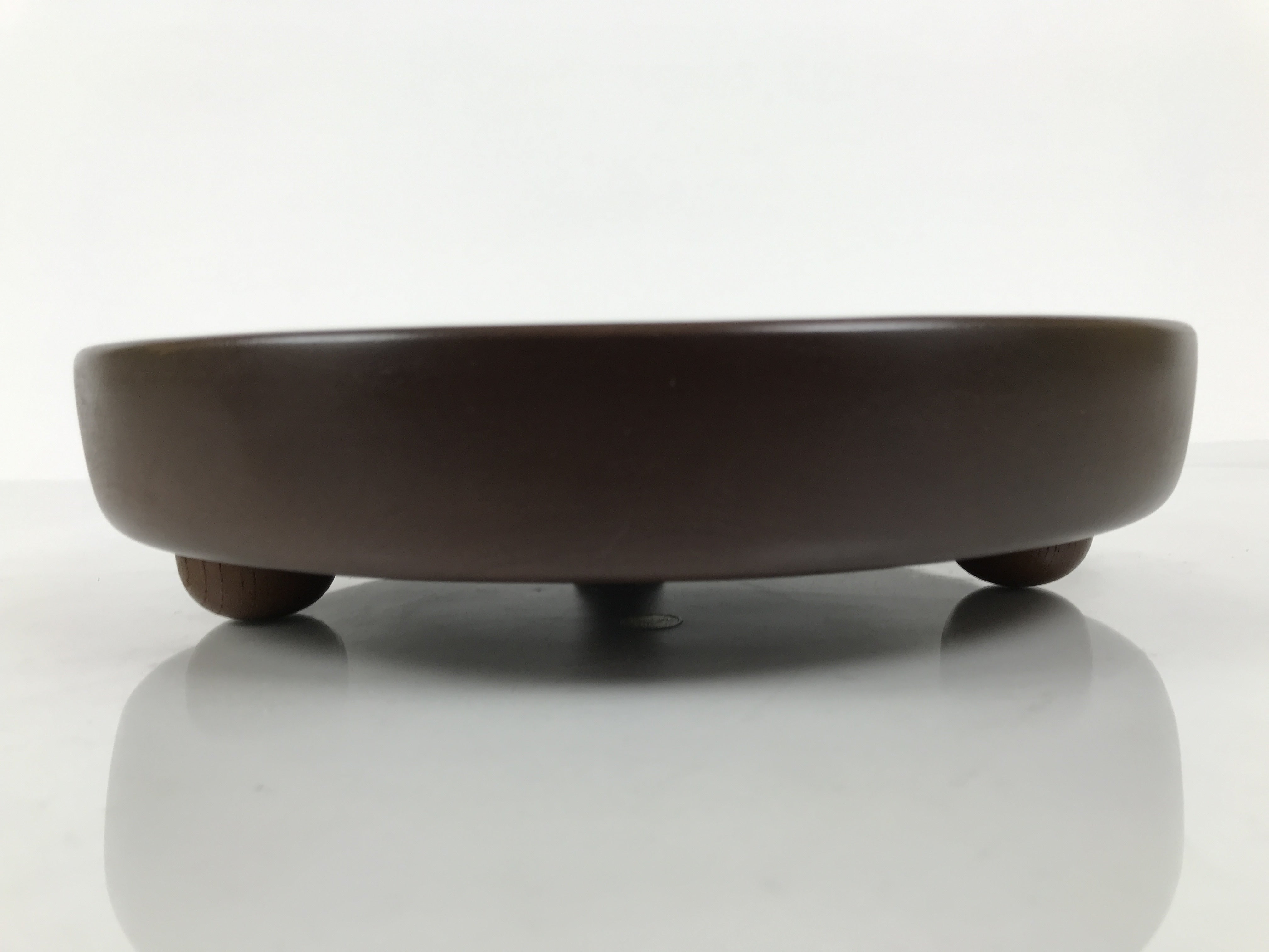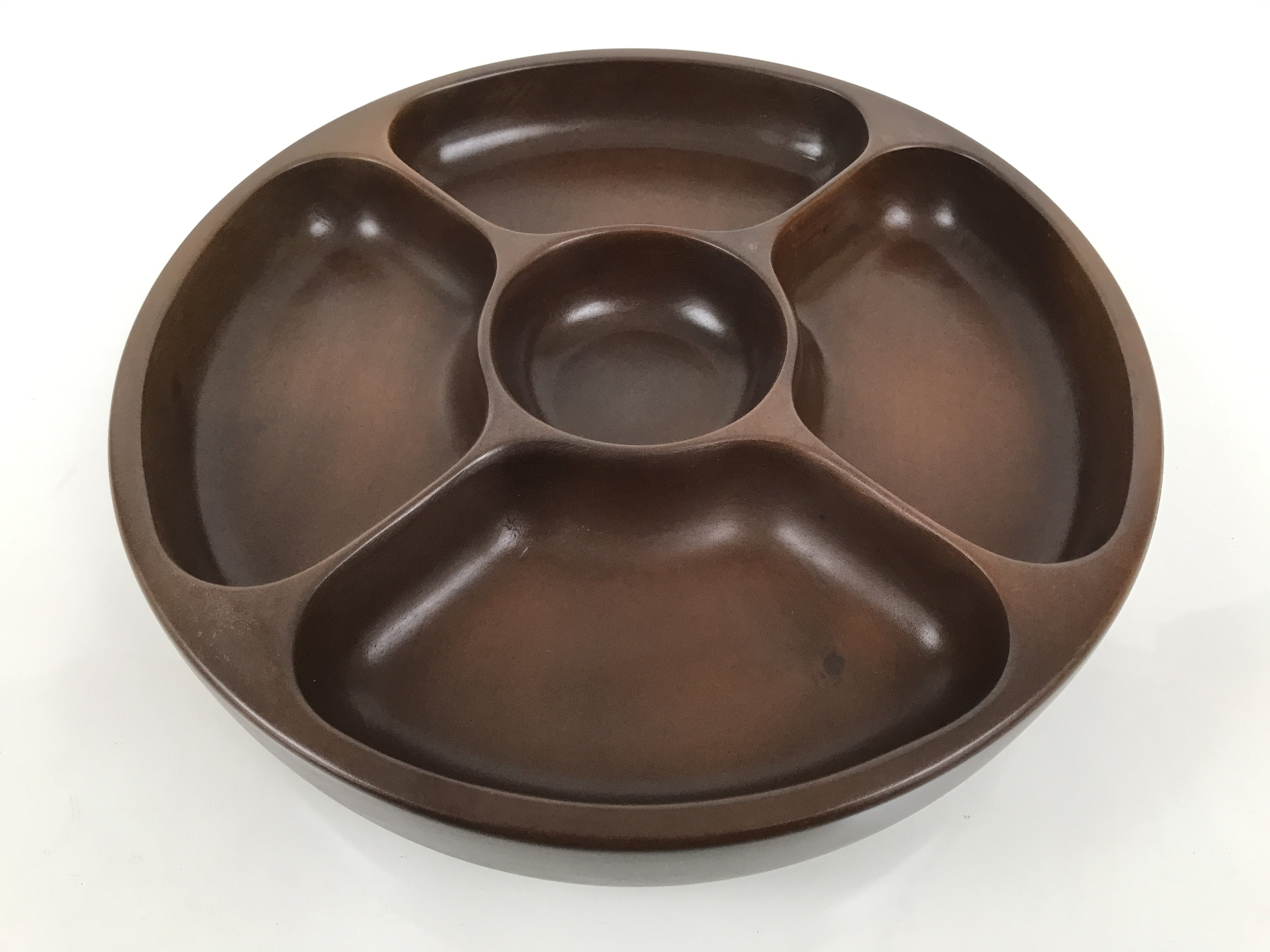 This is a vintage Japanese serving plate. The round brown plate is carved from a piece of wood with three round legs attached. It has a round, smaller compartment in the center and four bigger compartments around it. It is great for serving side dishes, desserts, and other light dishes.
