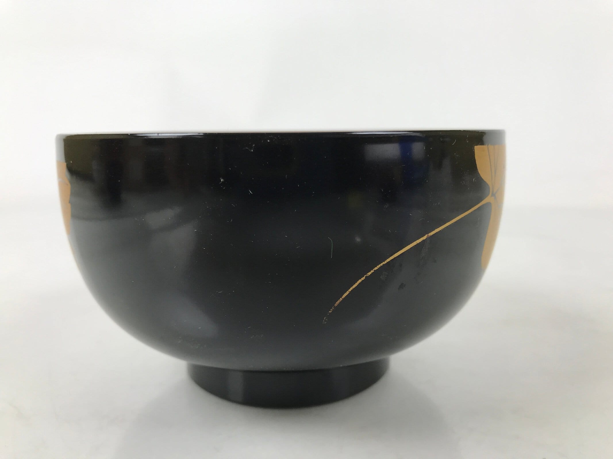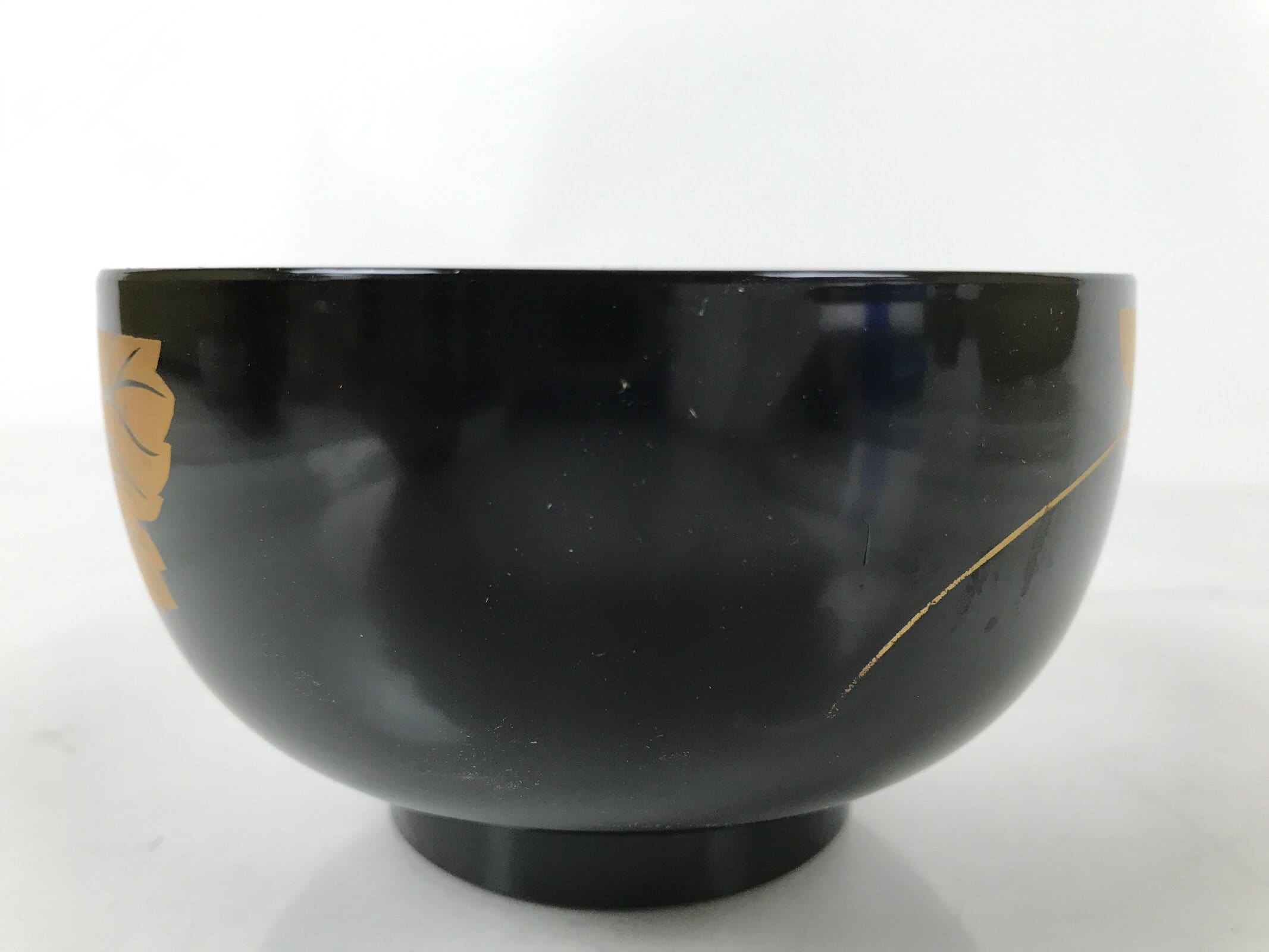 A glossy black lacquered bowl in the Aizu-Nuri style with a leafy motif makie outside and red inside, this vintage lacquered wooden bowl is a beautifully decorative addition to any traditional Japanese dinnerware set. This particular bowl is considered an owan, made for soups or rice. It is easy to hold while eating.