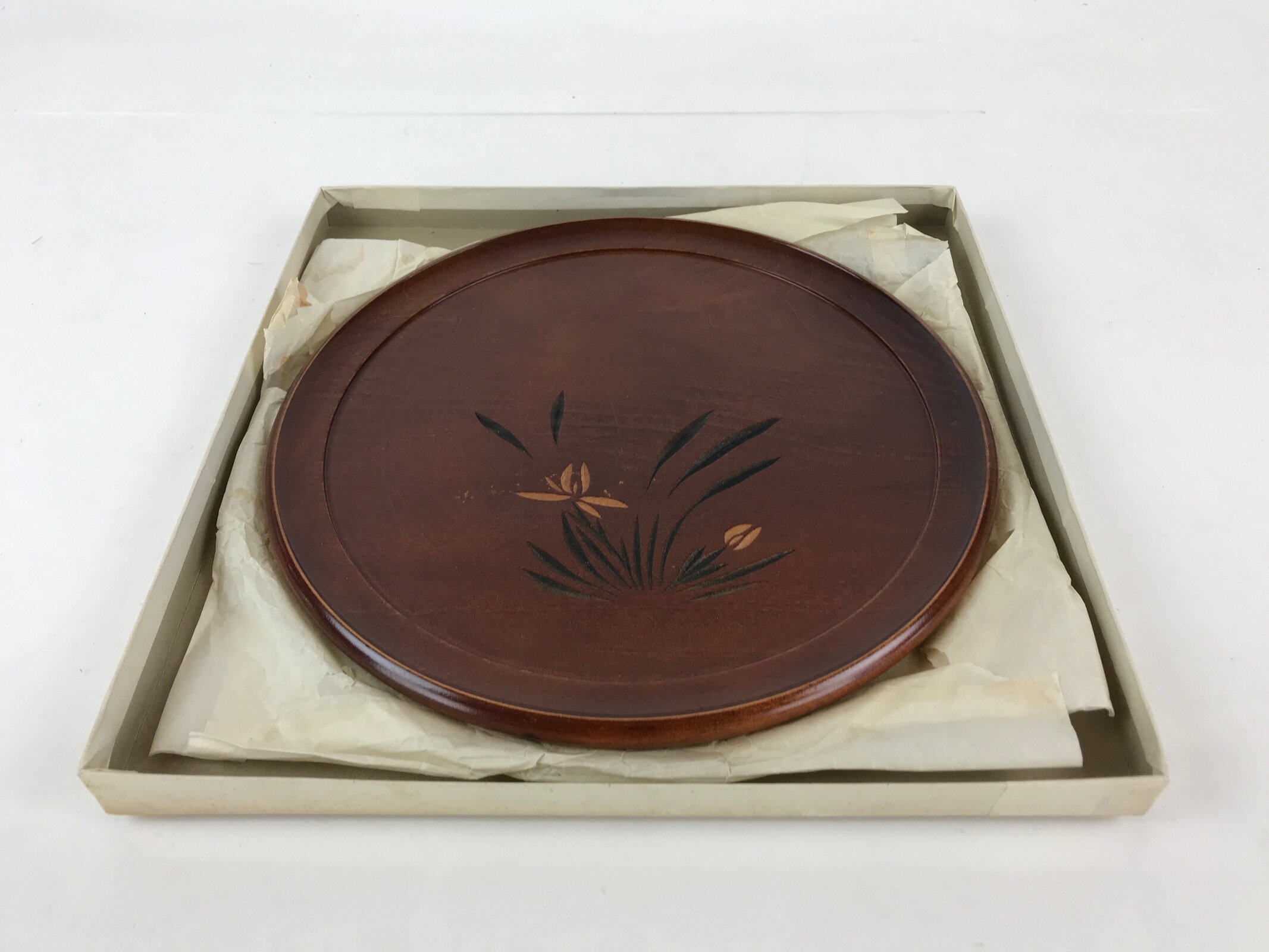 This is a Japanese vintage lacquerware tray with a little flower picture carved on it. This is the work of Teruji Tsuji, who was selected for the Japan Traditional Art Crafts Exhibition.