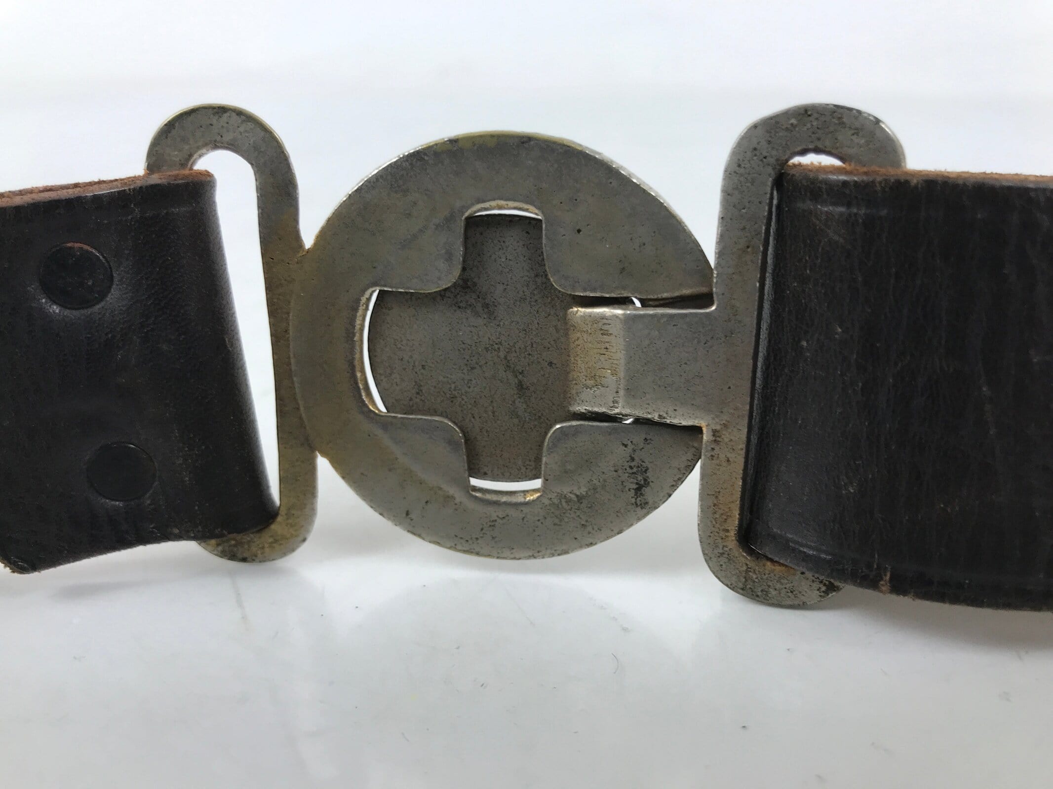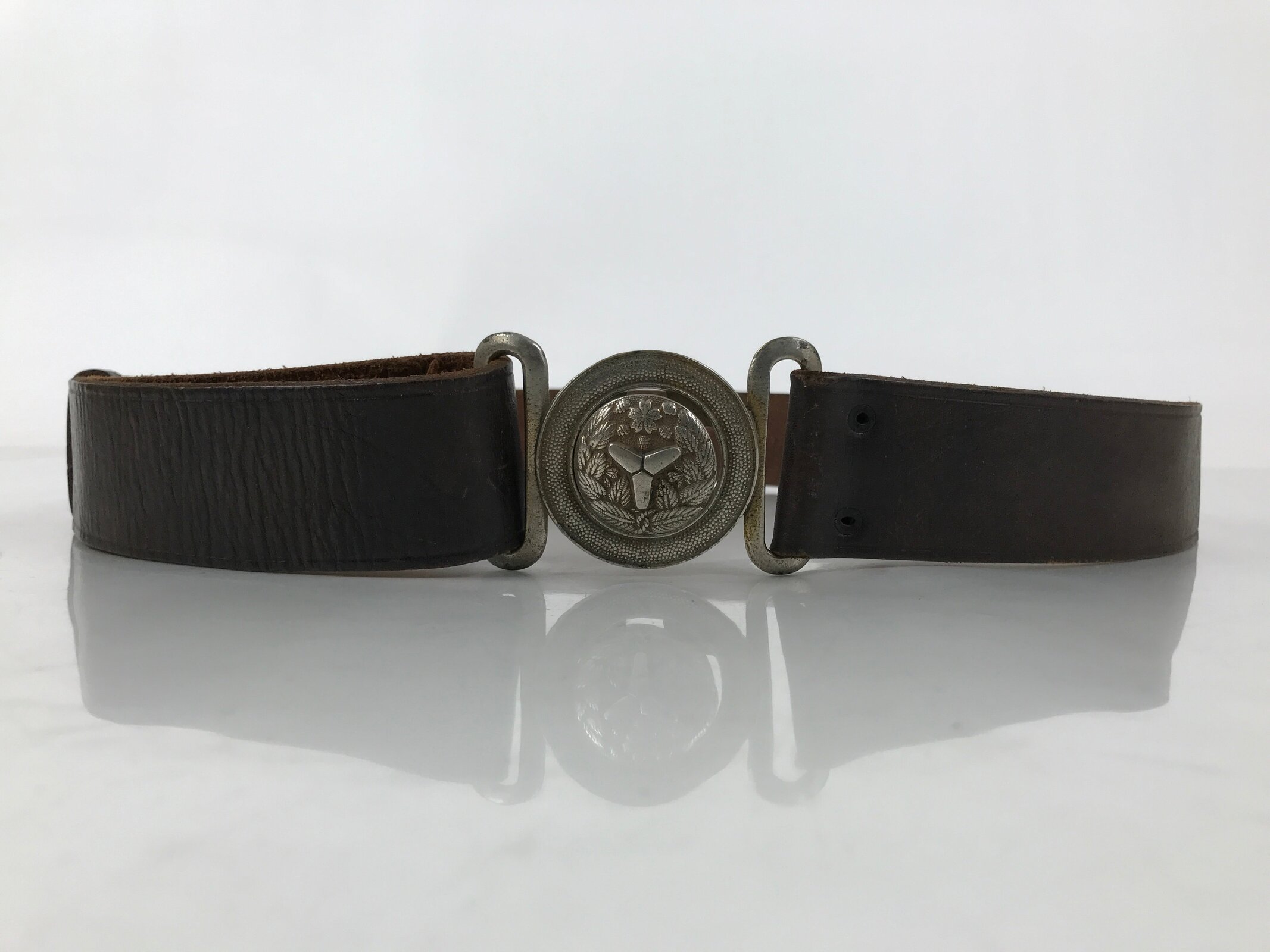 This is a vintage Japanese fireman’s dress uniform leather belt. It is made of sturdy brown leather and fastened together with a silver metal locking clasp. The clasp is round and fits through a cross-shaped hole that holds the belt together by tension. The clasp has a round image of the old National Fire Department insignia along with leaves and a cherry blossom.