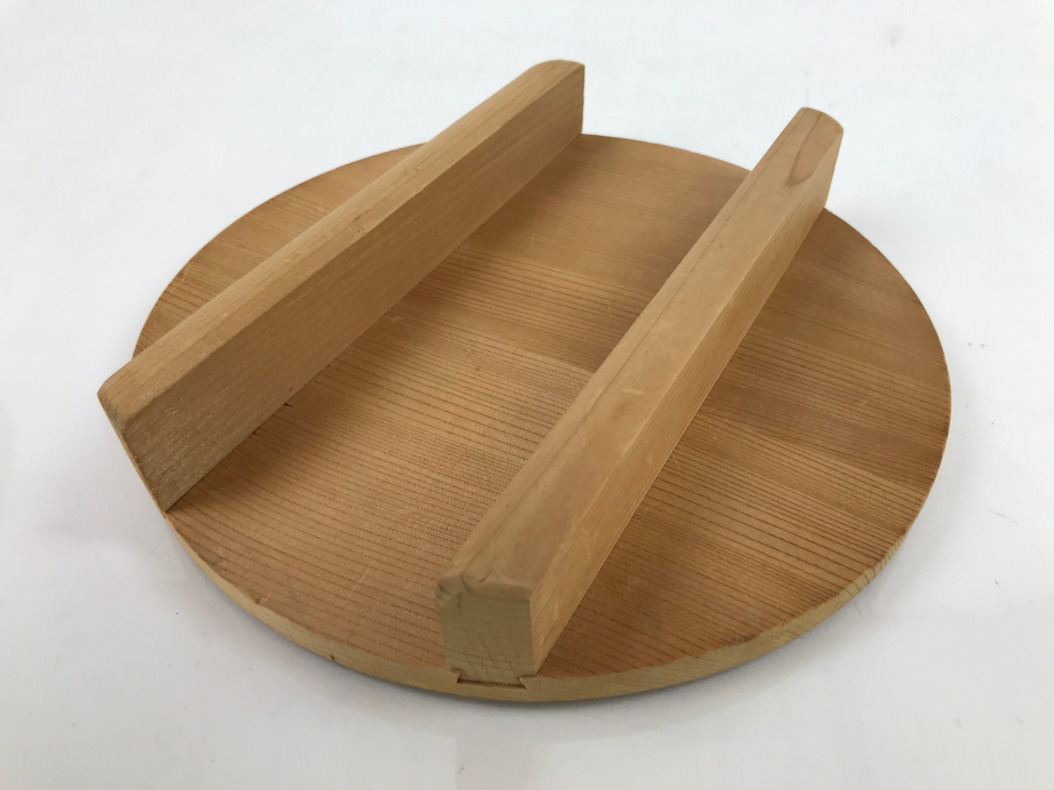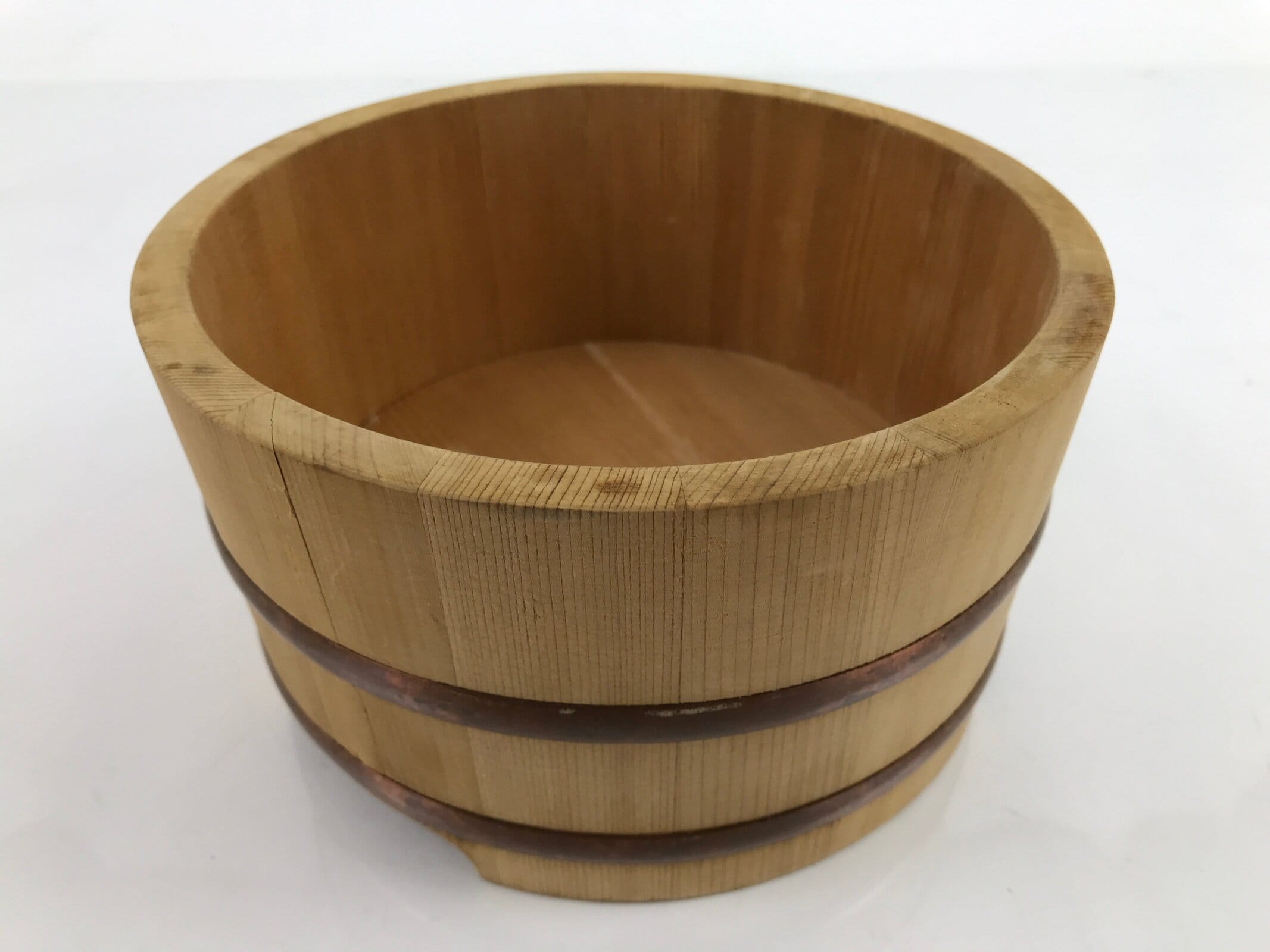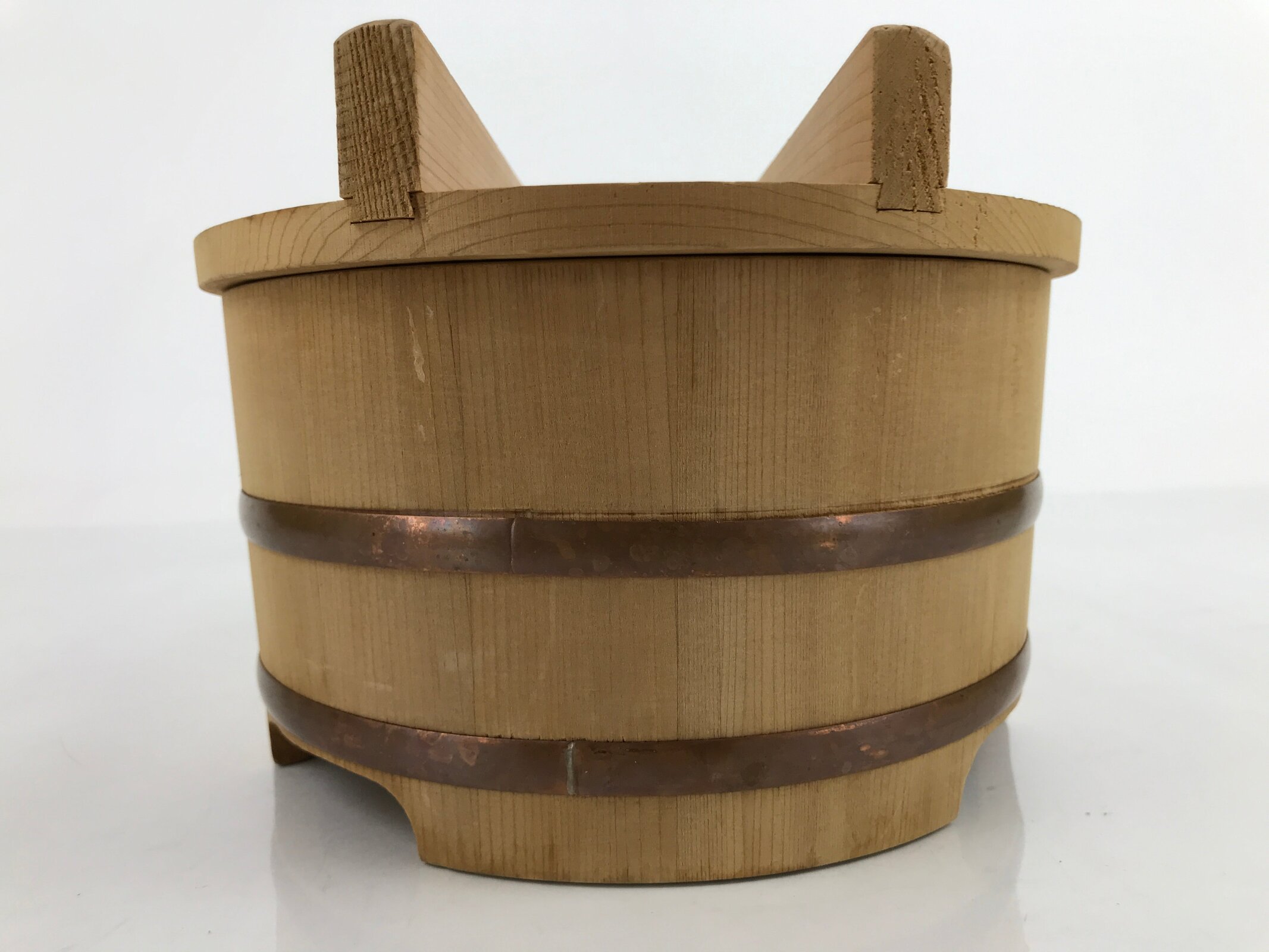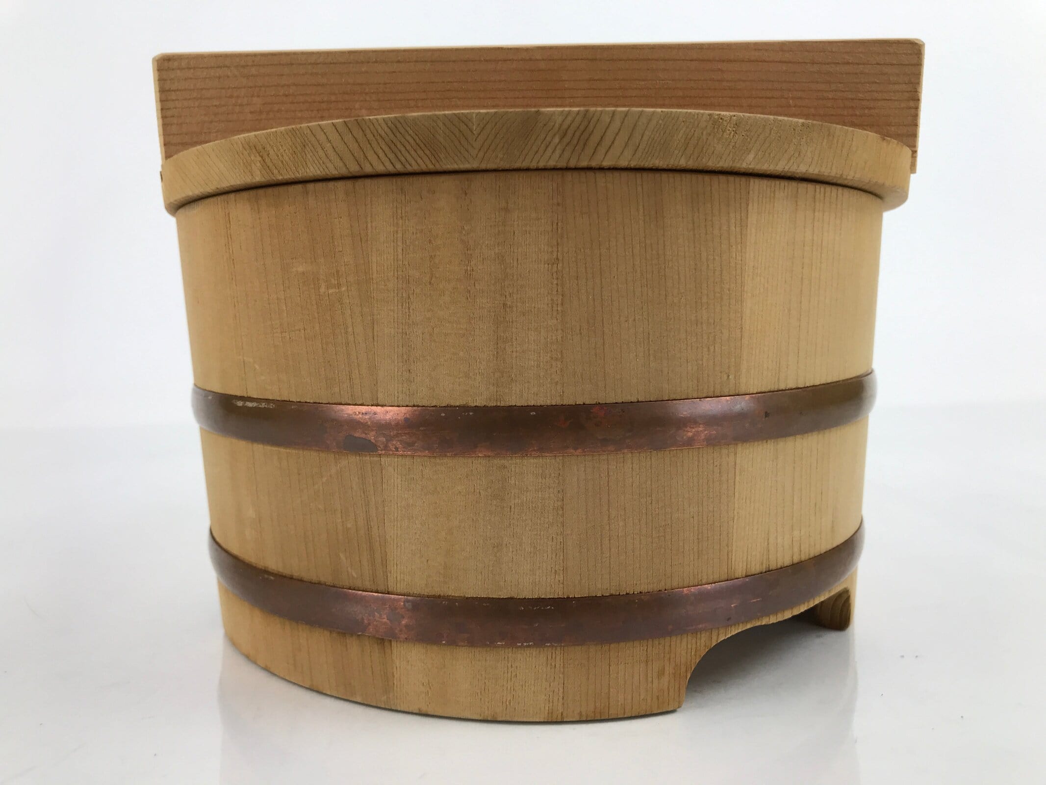 This is a handmade traditional Japanese lidded wooden bucket made for storing water, rice, or other food product. It is also commonly used for making pickles. Stout, sturdy, and a natural brown color, it is made from precisely cut slats of wood held together by two flat copper metal bands via tension. This beautiful classic piece is also perfect for adding traditional flair to any home or office decor.