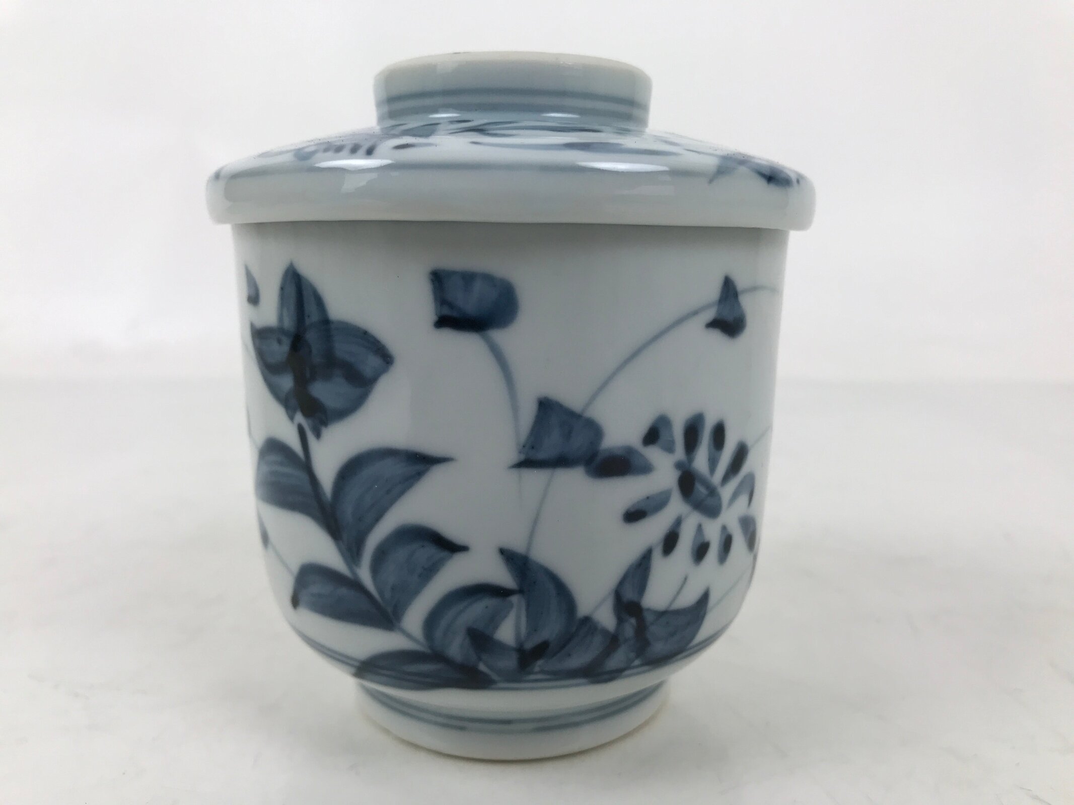 This is a vintage Japanese ceramic teacup with a lid. The cup is white with painted blue flowers, likely Japanese kikyo bell flowers and chrysanthemum flowers. The lid has a matching design. It prevents tea or other beverages and food from cooling down. This elegant teacup is perfect for tea ceremonies and tea parties, adding a touch of traditional elegance to your table.