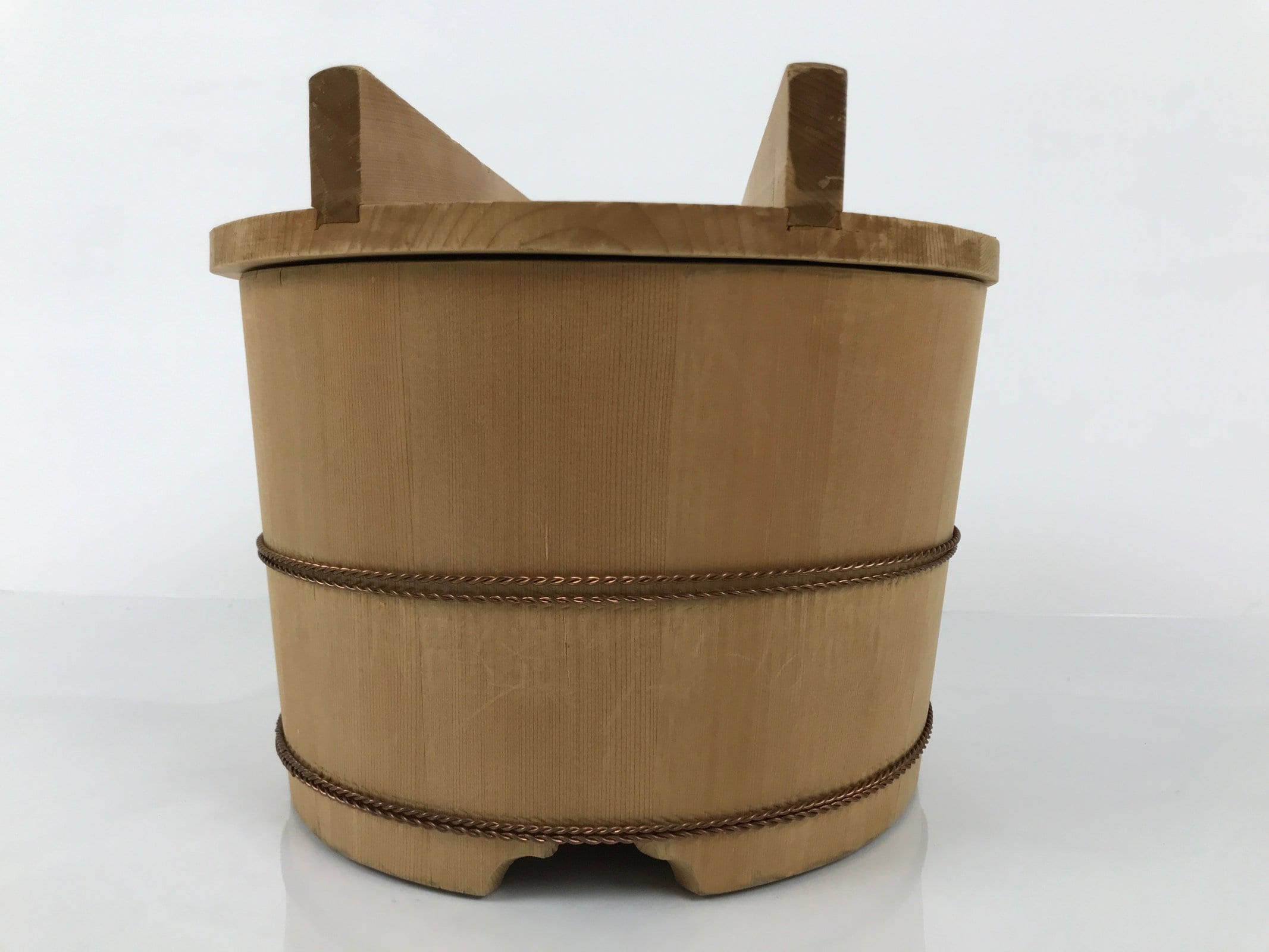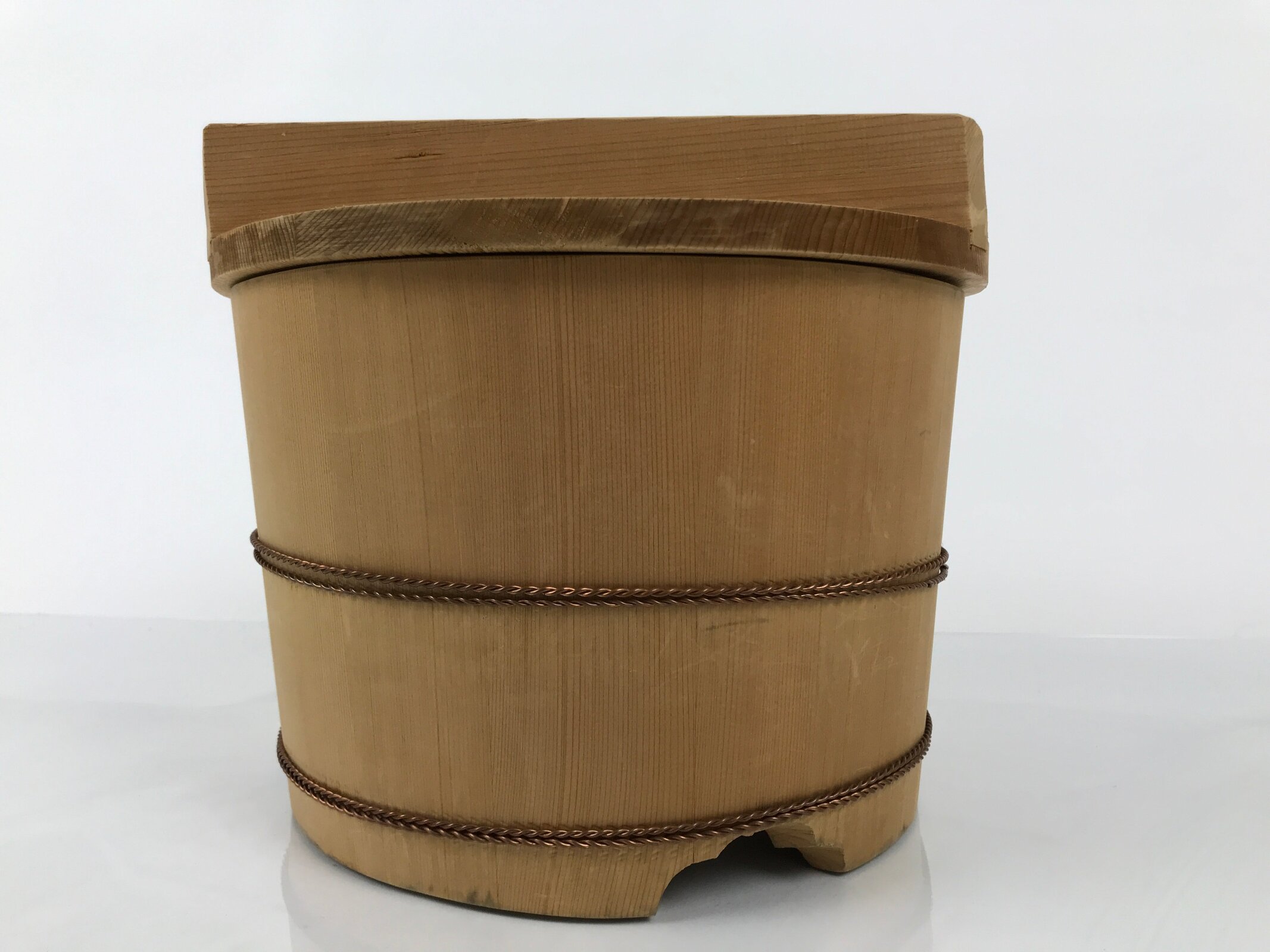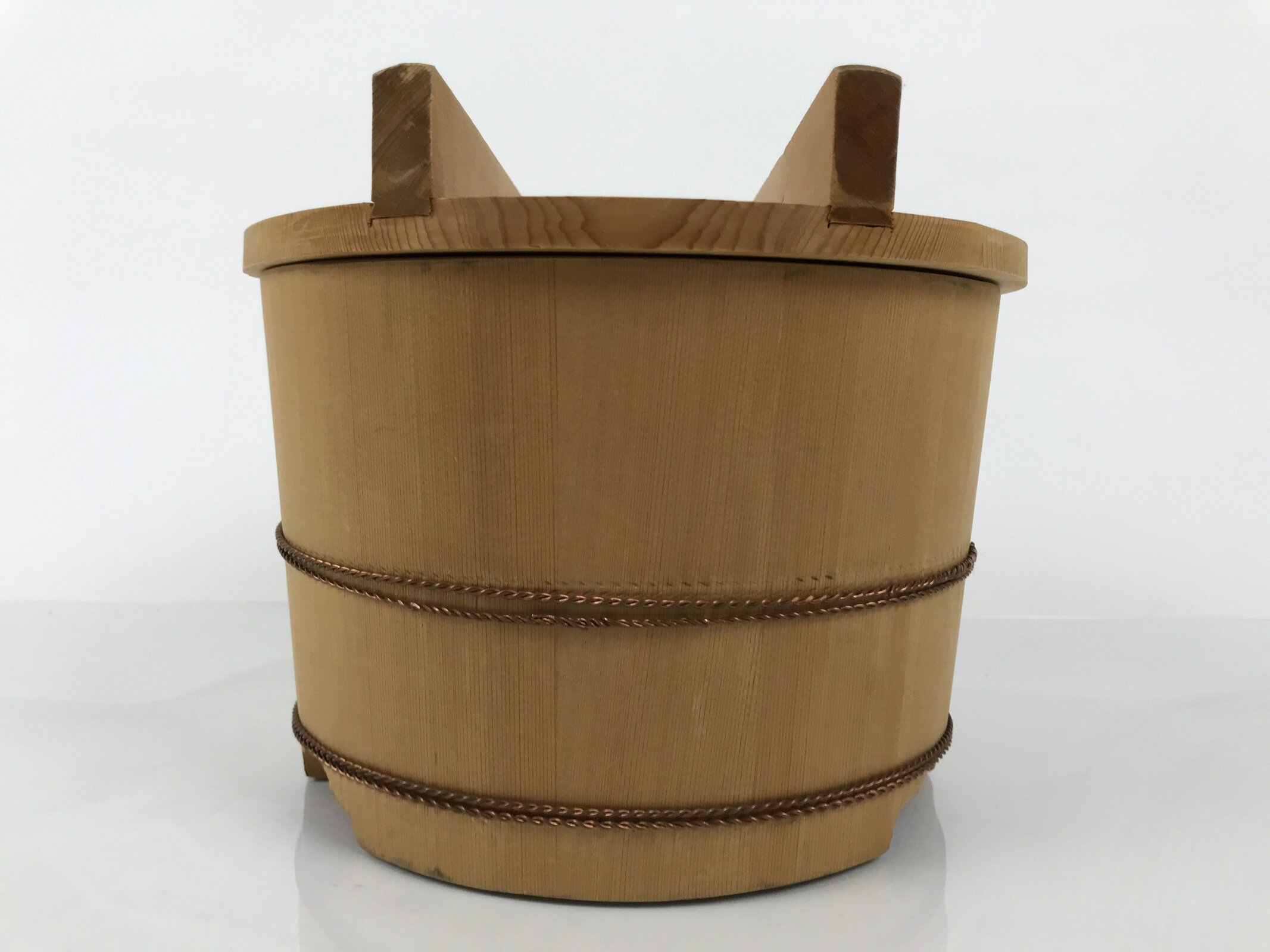 This is a handmade traditional Japanese lidded wooden bucket made for storing water, rice, or other food products. It is also commonly used for making pickles. Stout, sturdy, and a natural brown color, it is made from precisely cut slats of wood held together by four narrow, twisted copper metal bands via tension. This beautiful classic piece is also perfect for adding traditional flair to any home or office decor.