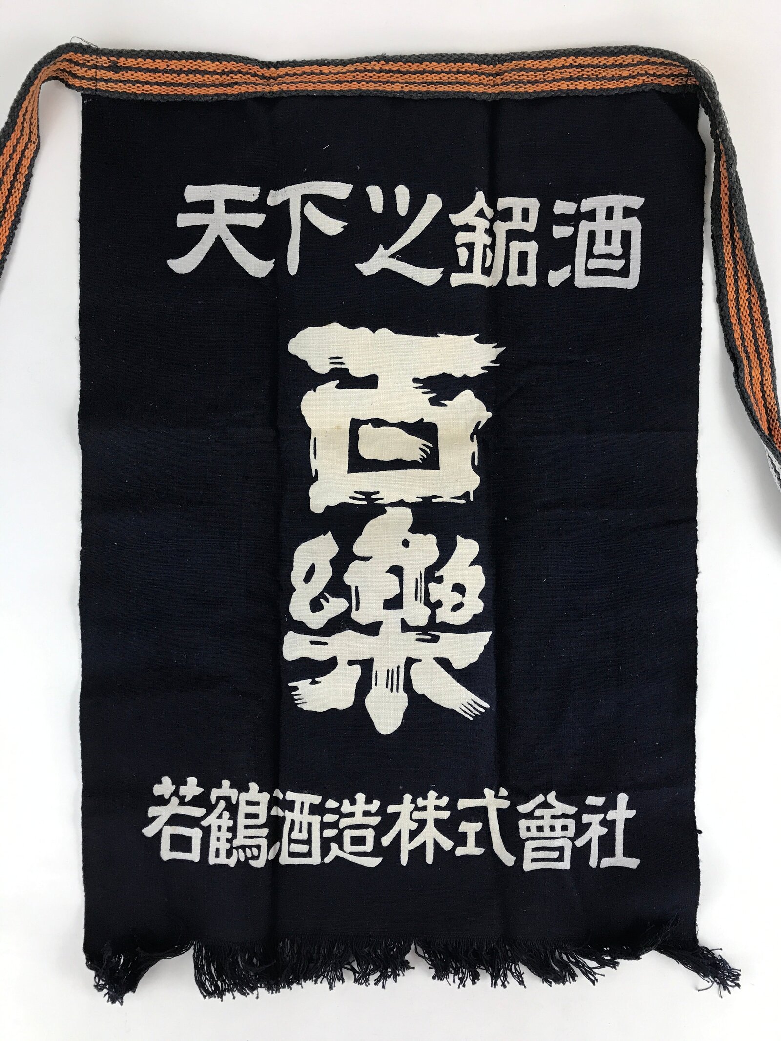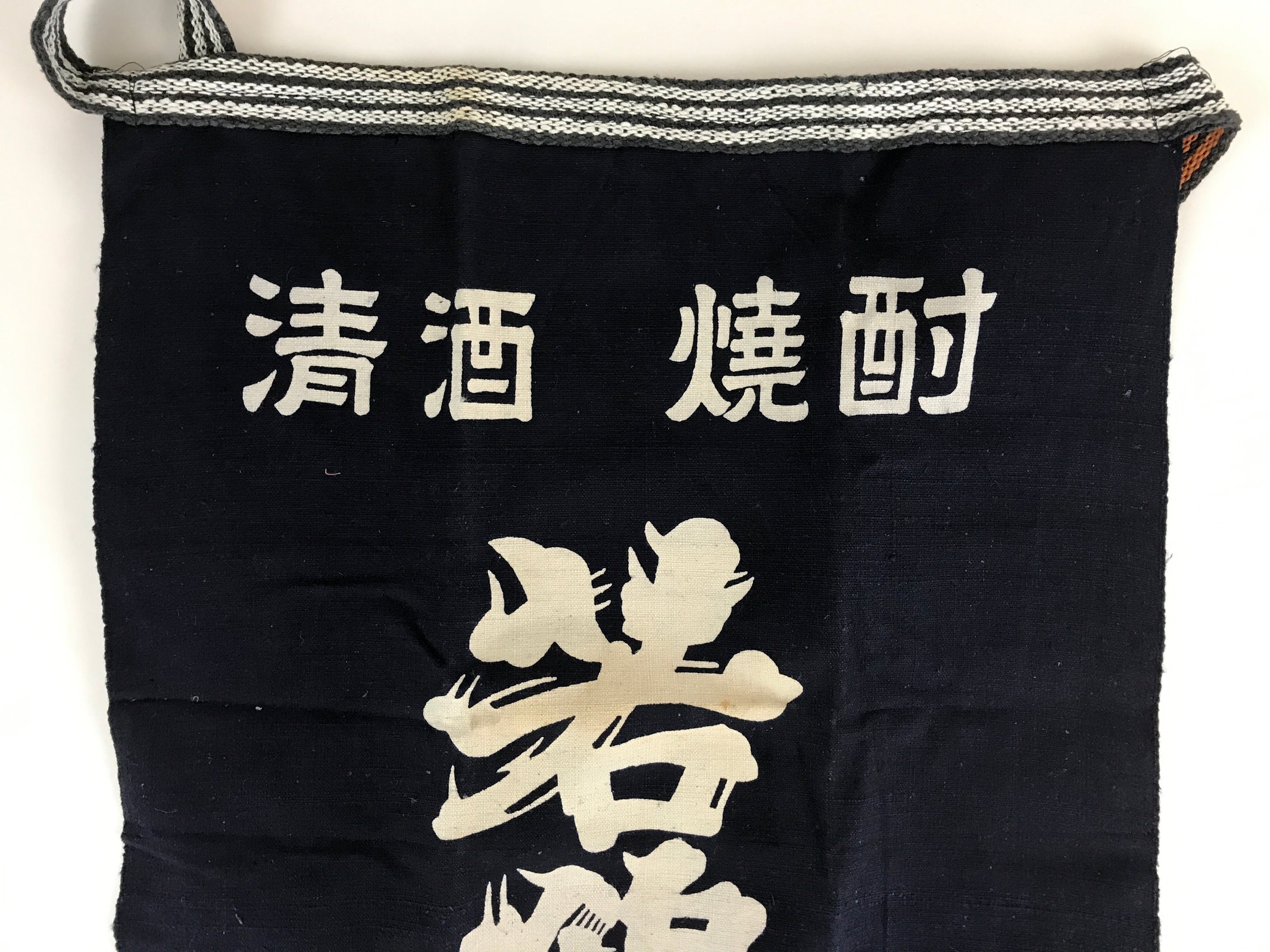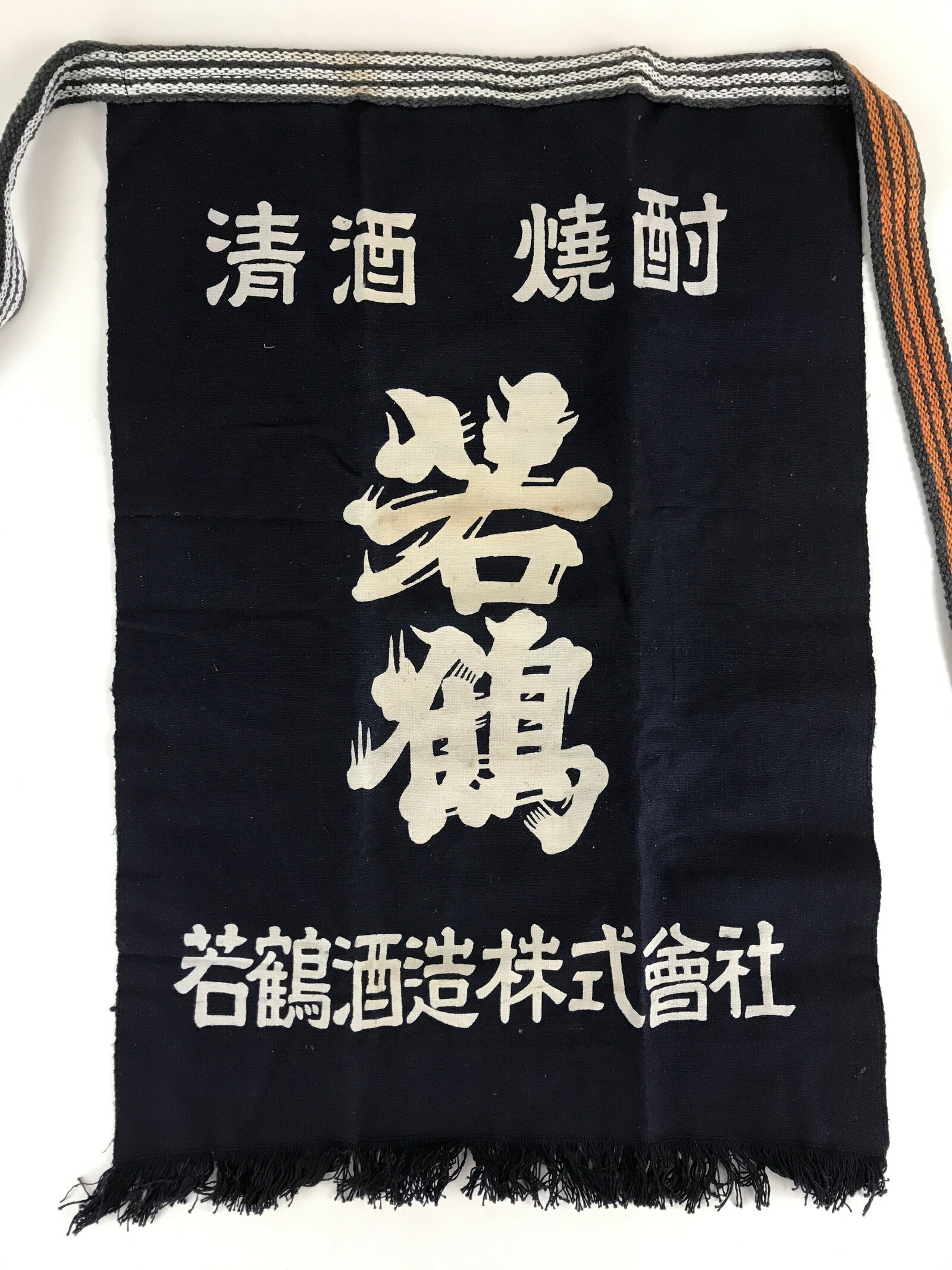 This is a vintage Japanese apron, Maekake. Maekake is an apron, a piece of cloth with strings that covers the front of the garment, especially from the waist down. The Maekake fabric and string are thicker than regular aprons. Wrapping it around your waist and tightening that works like a corset and reduces the burden on your lower back, and prevents clothes from getting dirty. The kanji on the apron are “Sake, Shochu, Wakatsuru, Idea Wakatsuru Sake Brewery Co., Ltd / world-famous sake, Hyakuraku.”