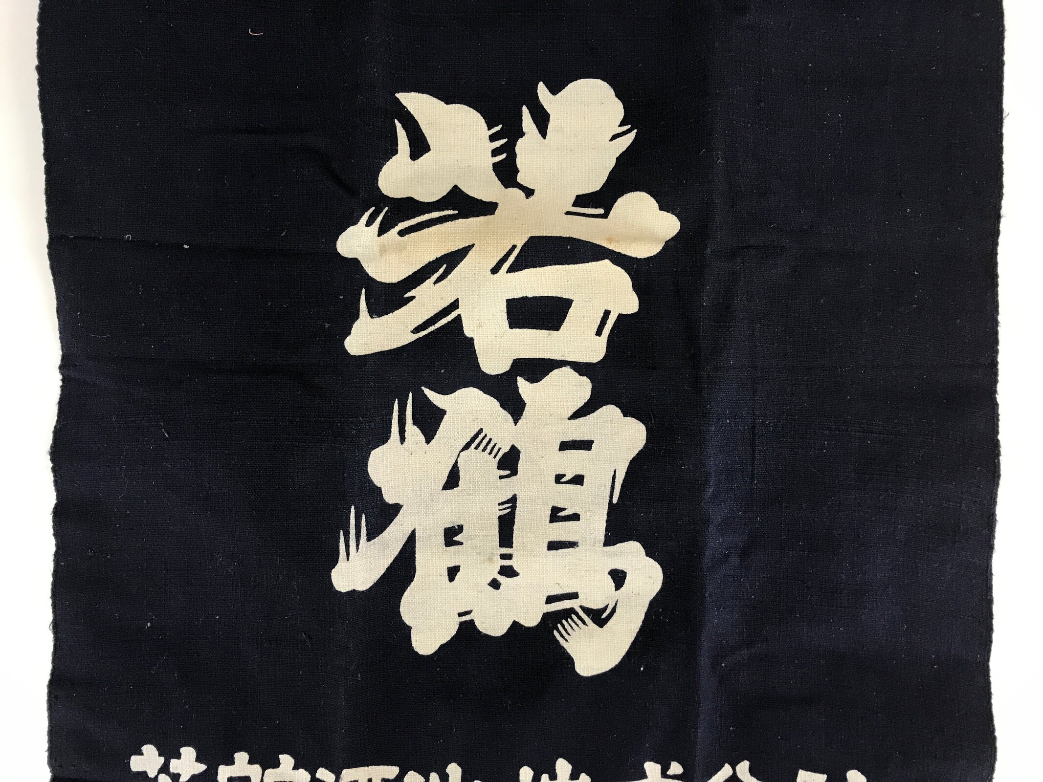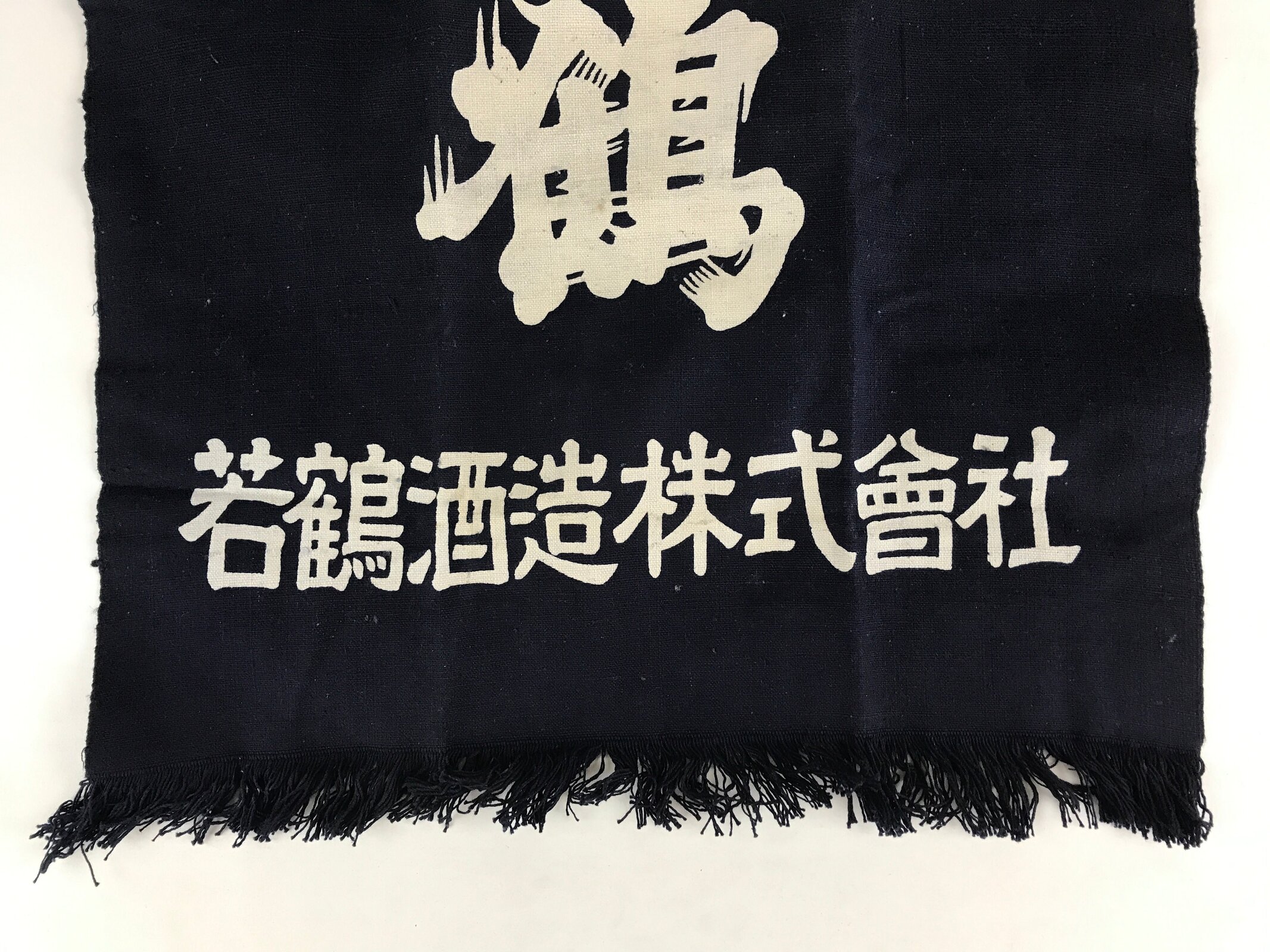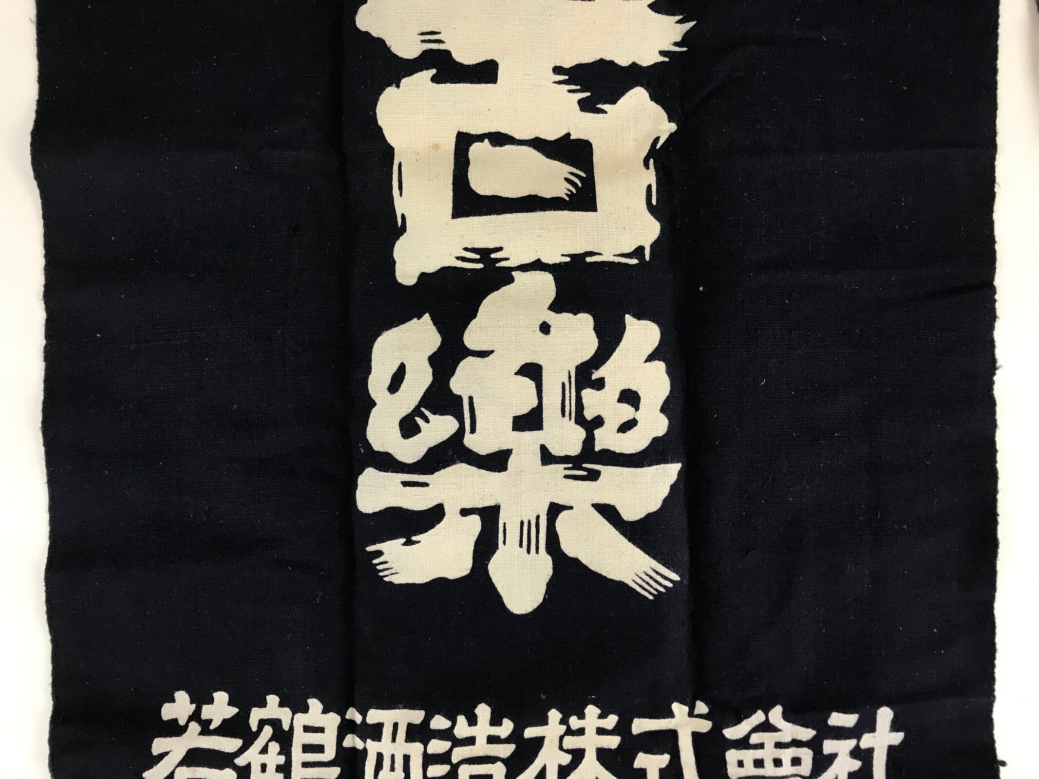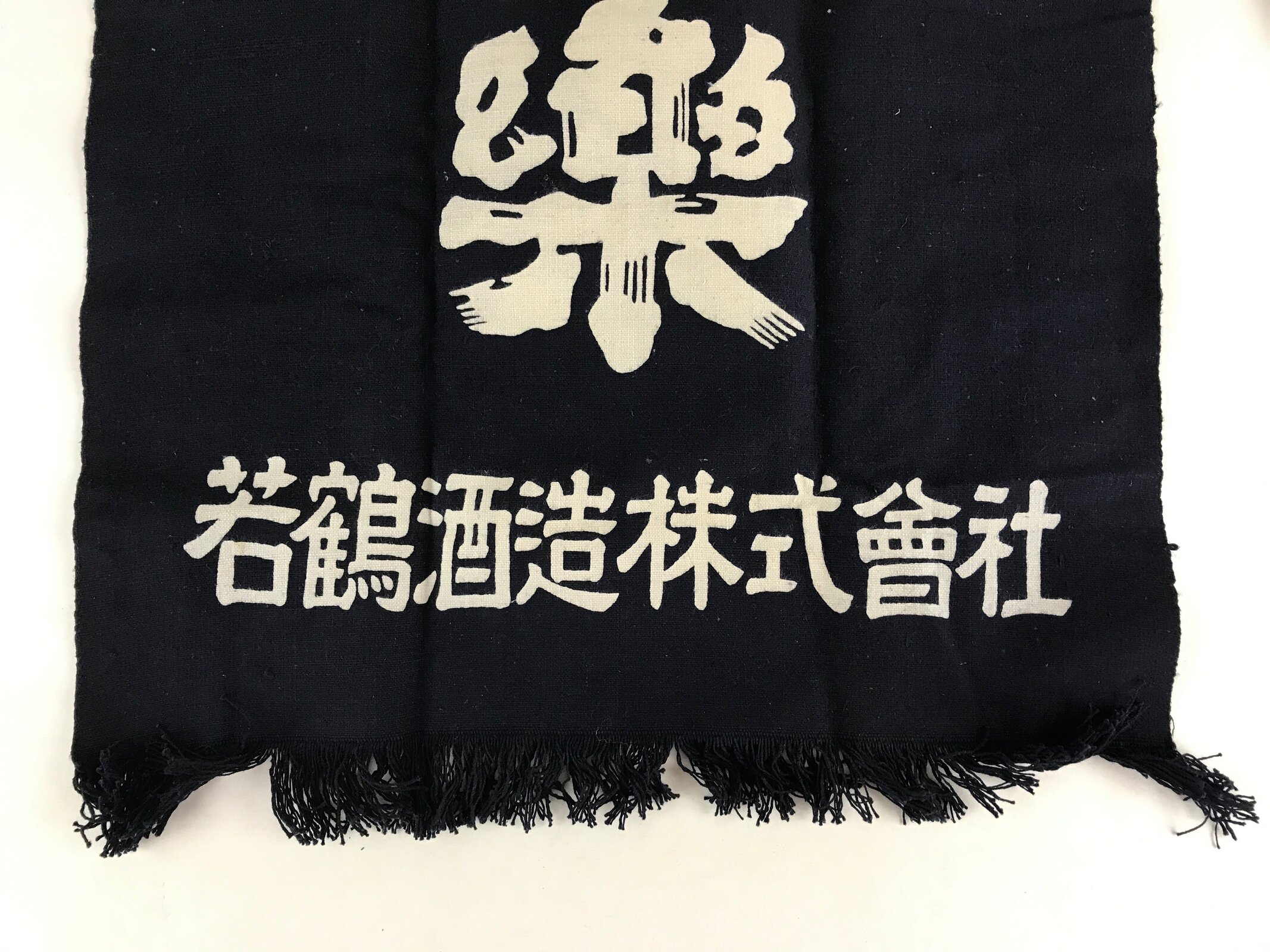 This is a vintage Japanese apron, Maekake. Maekake is an apron, a piece of cloth with strings that covers the front of the garment, especially from the waist down. The Maekake fabric and string are thicker than regular aprons. Wrapping it around your waist and tightening that works like a corset and reduces the burden on your lower back, and prevents clothes from getting dirty. The kanji on the apron are “Sake, Shochu, Wakatsuru, Idea Wakatsuru Sake Brewery Co., Ltd / world-famous sake, Hyakuraku.”
