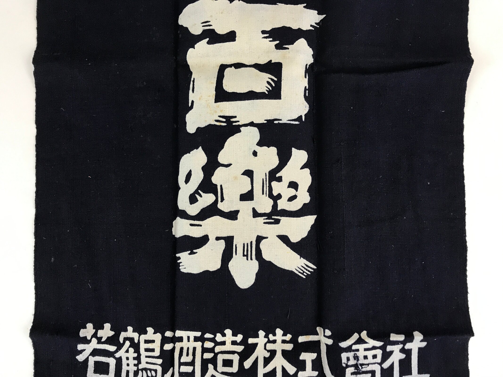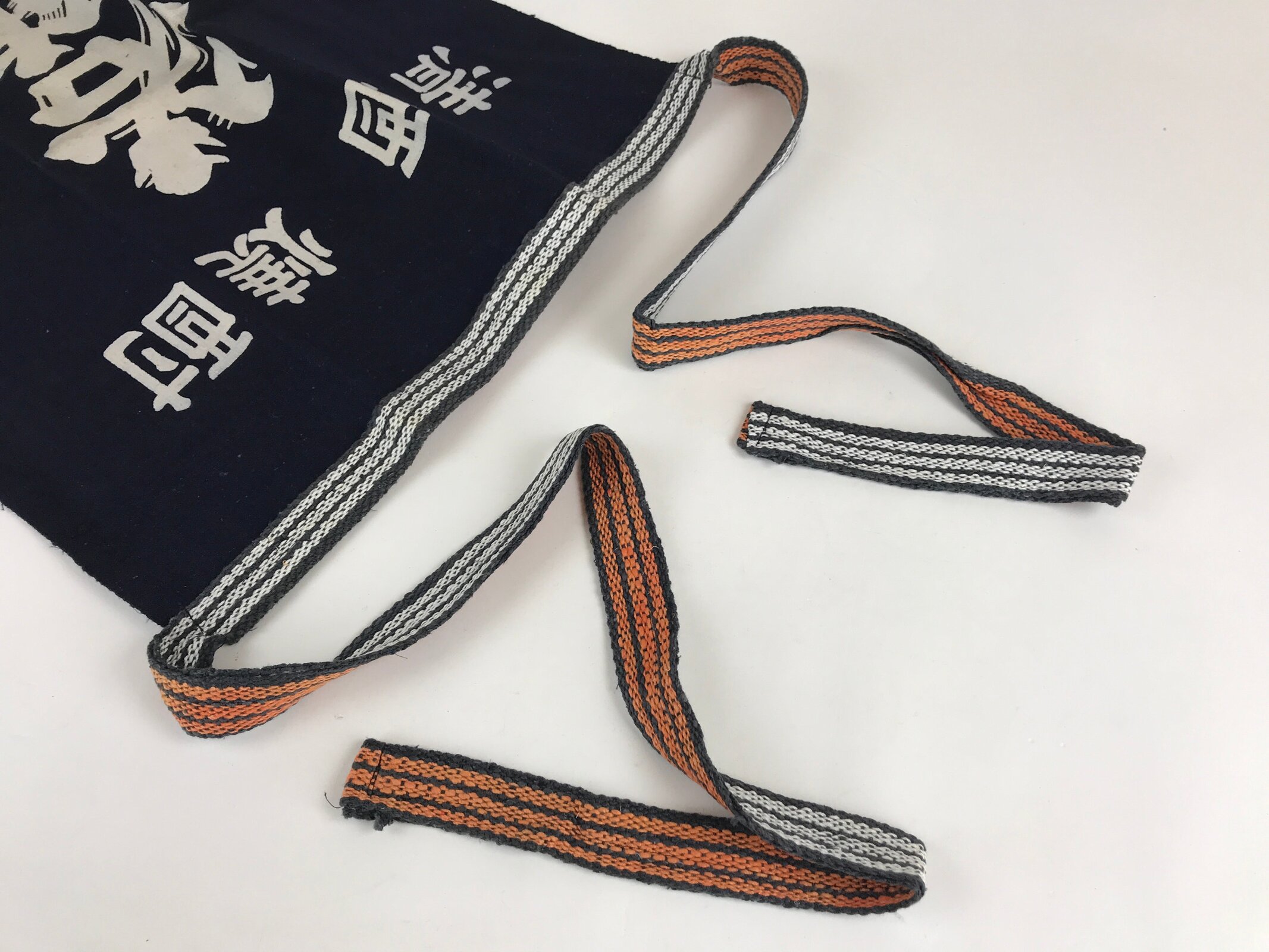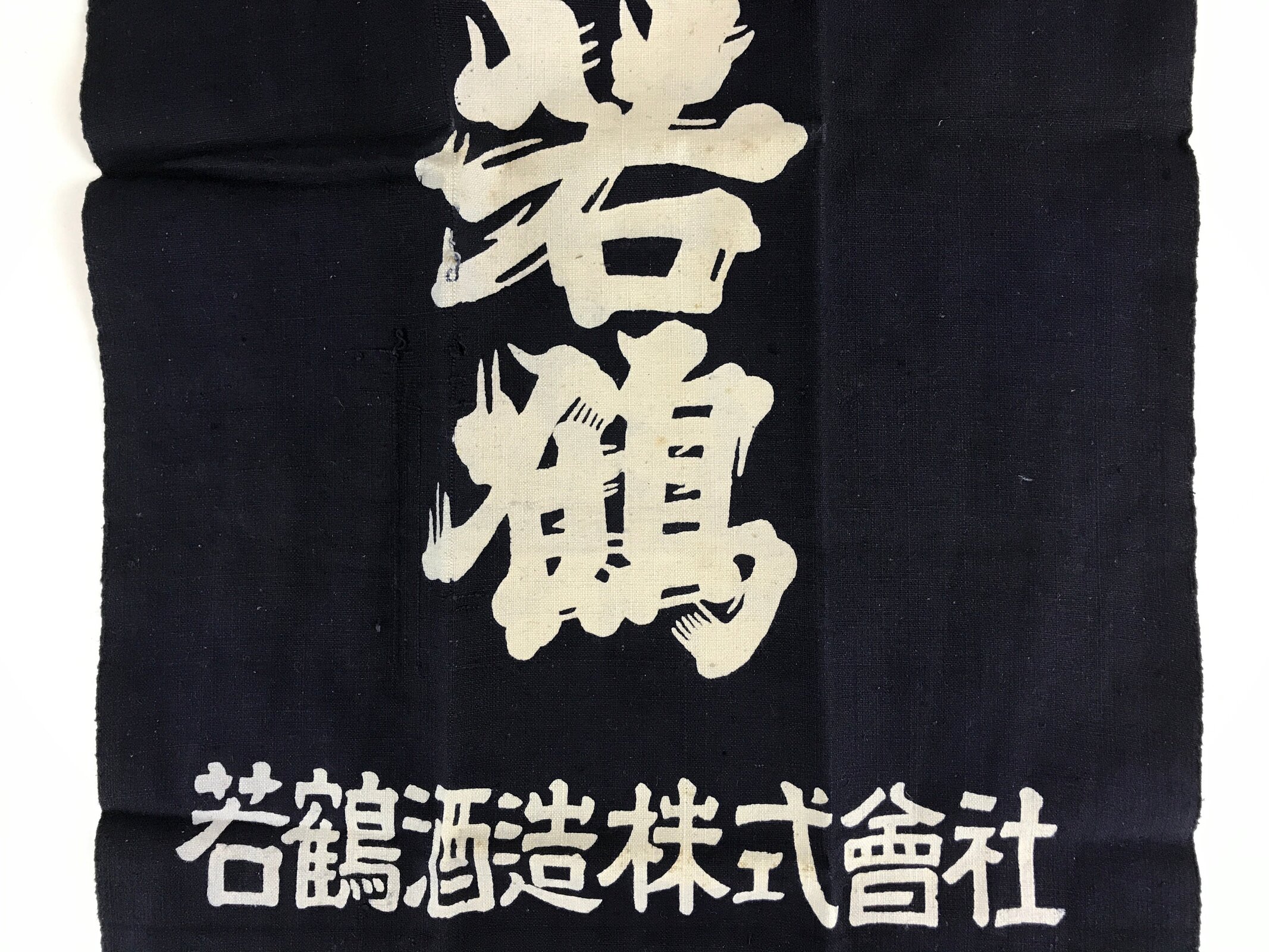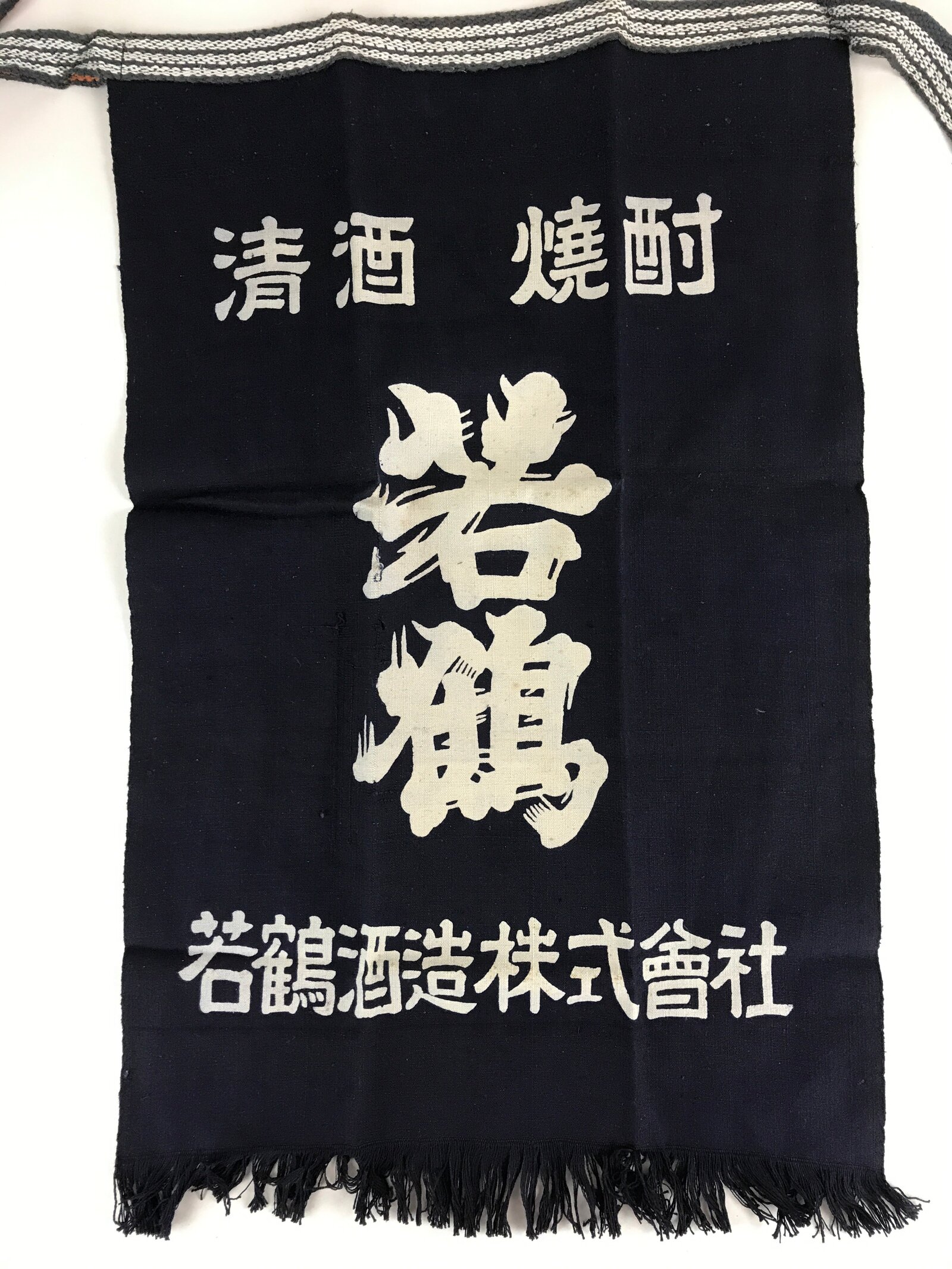 This is a vintage Japanese apron, Maekake. Maekake is an apron, a piece of cloth with strings that covers the front of the garment, especially from the waist down. The Maekake fabric and string are thicker than regular aprons. Wrapping it around your waist and tightening that works like a corset and reduces the burden on your lower back, and prevents clothes from getting dirty. The kanji on the apron are “Sake, Shochu, Wakatsuru, Idea Wakatsuru Sake Brewery Co., Ltd / world-famous sake, Hyakuraku.”