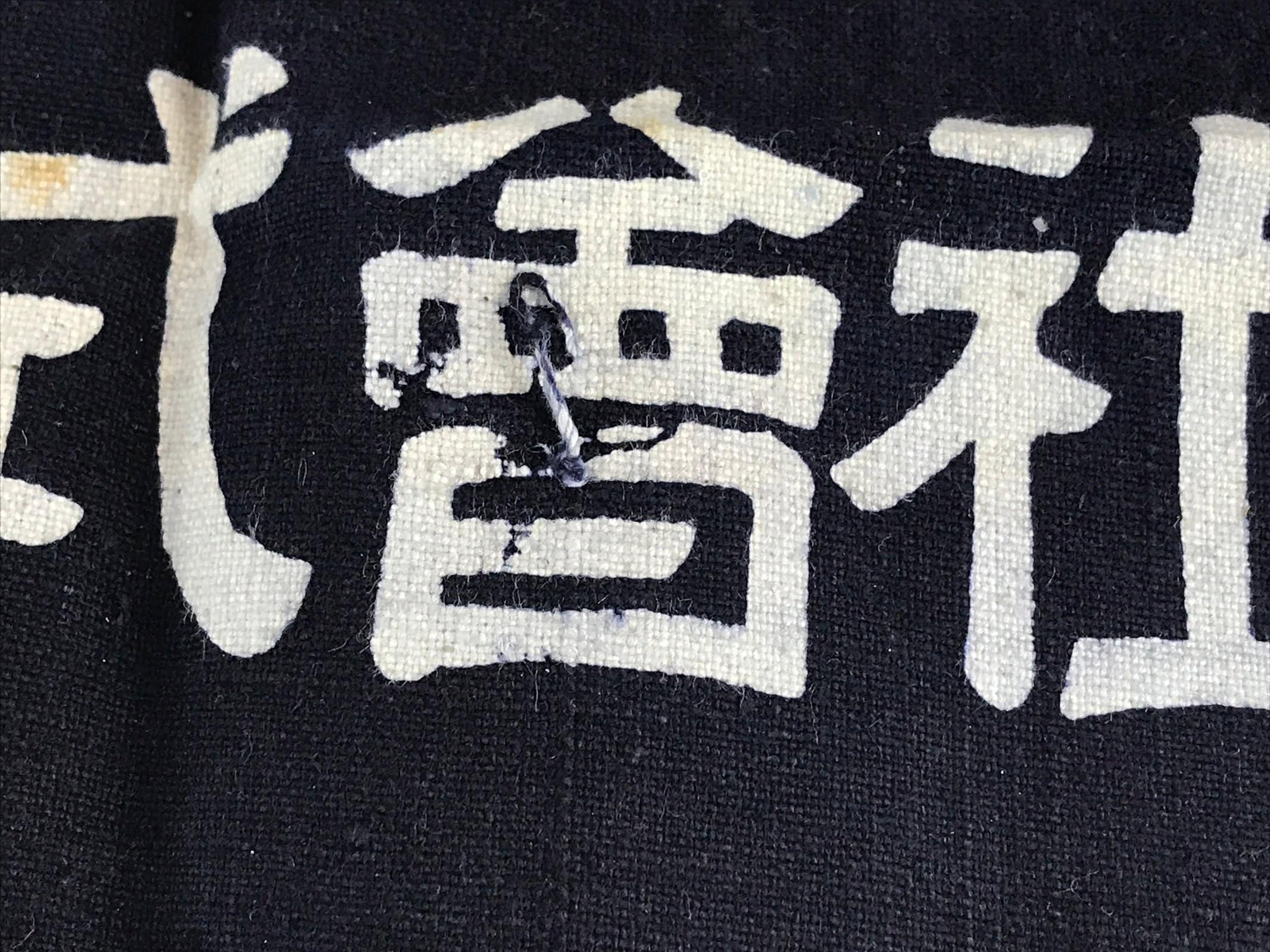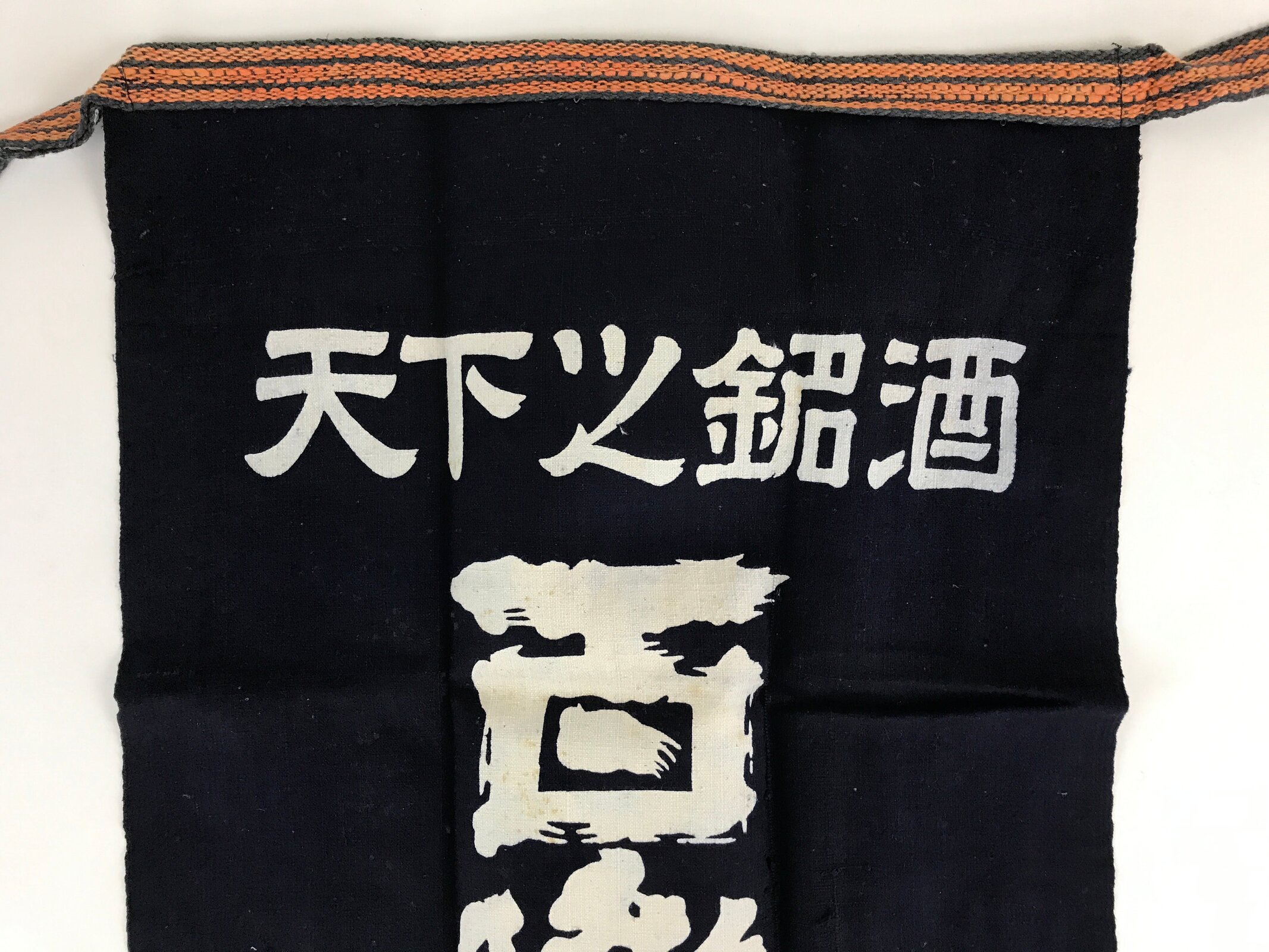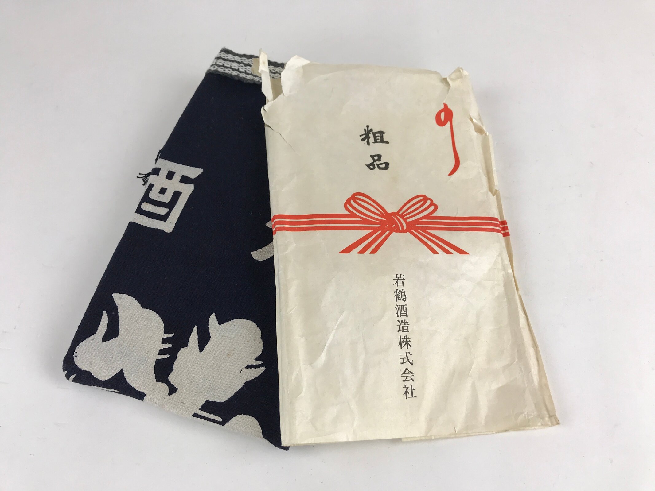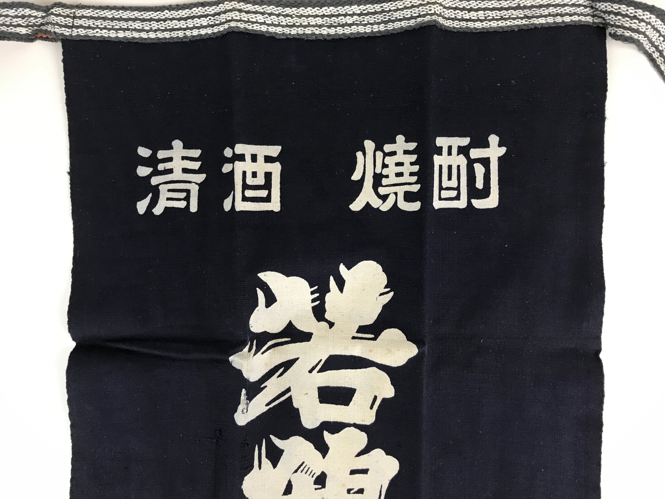 This is a vintage Japanese apron, Maekake. Maekake is an apron, a piece of cloth with strings that covers the front of the garment, especially from the waist down. The Maekake fabric and string are thicker than regular aprons. Wrapping it around your waist and tightening that works like a corset and reduces the burden on your lower back, and prevents clothes from getting dirty. The kanji on the apron are “Sake, Shochu, Wakatsuru, Idea Wakatsuru Sake Brewery Co., Ltd / world-famous sake, Hyakuraku.”