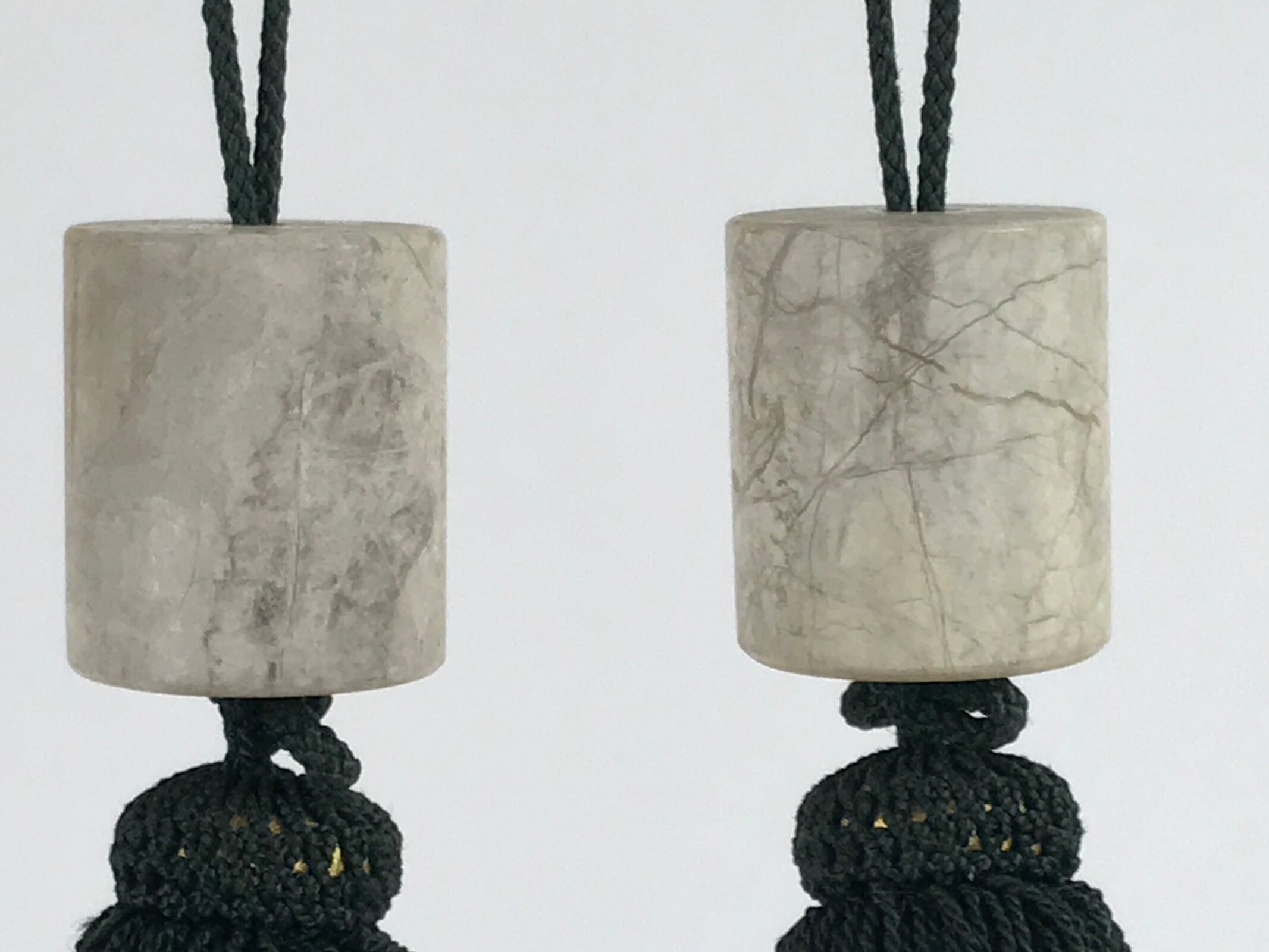 This item features two cylindrical marble stones with a light gray veins with subtle brown accents. It has dark green tassels with a gold accent underlayer at the head.