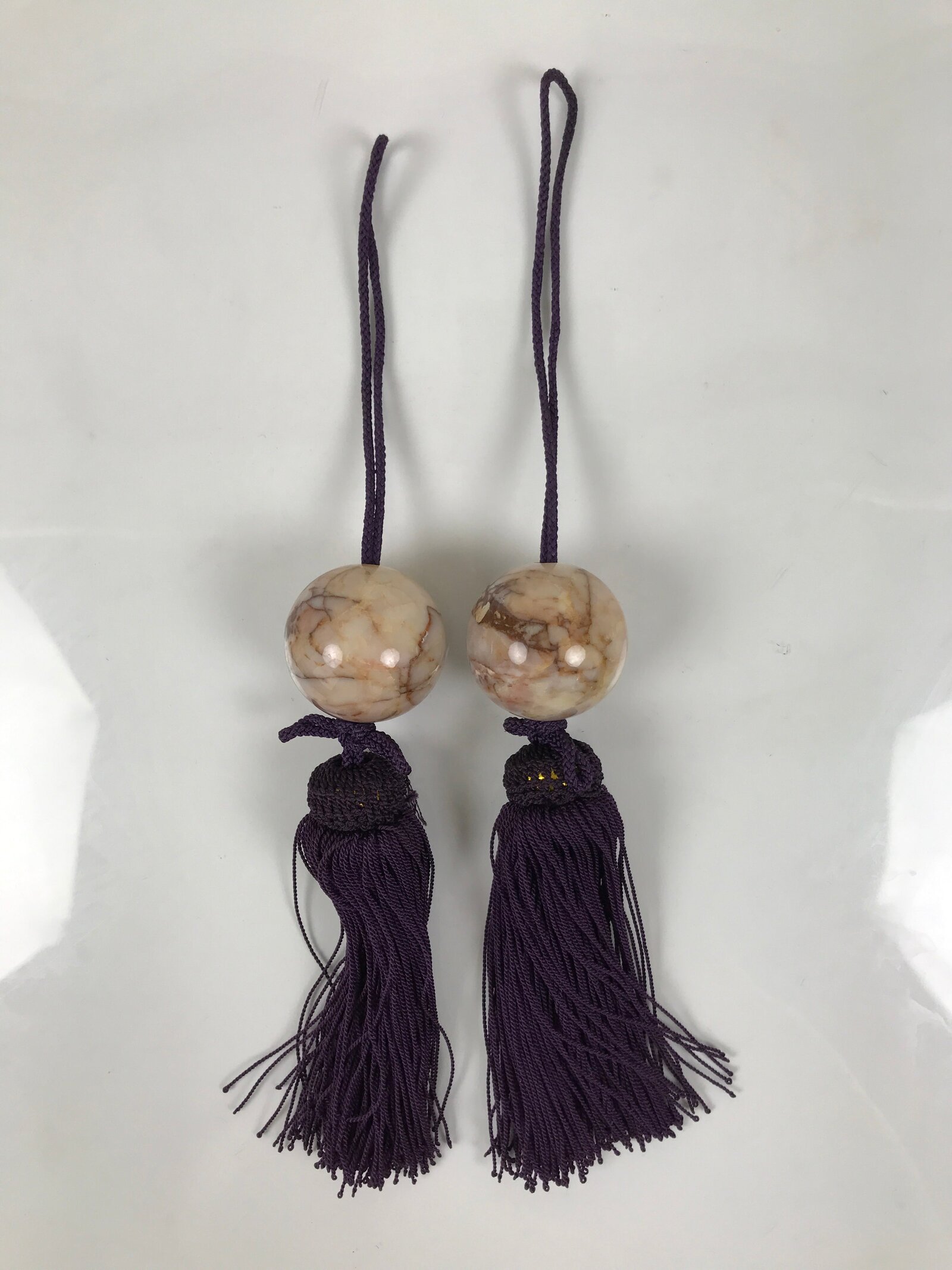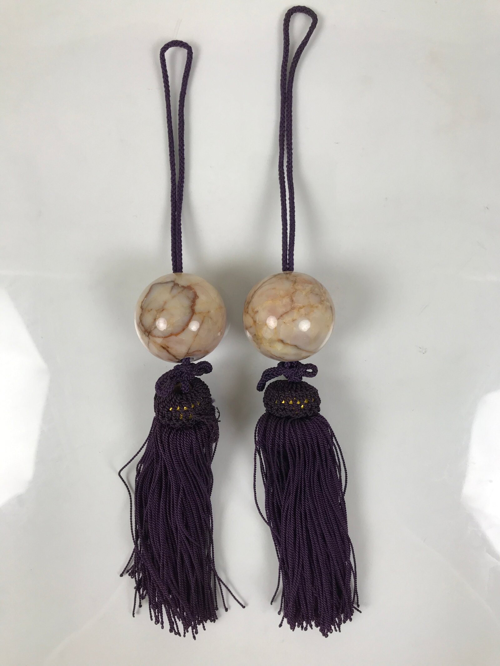 This item features natural pink marble stones in a sphere shape with a gorgeous vein pattern with varying shades of brown and beige. It has deep purple tassels with a gold accent underlayer at the head.
