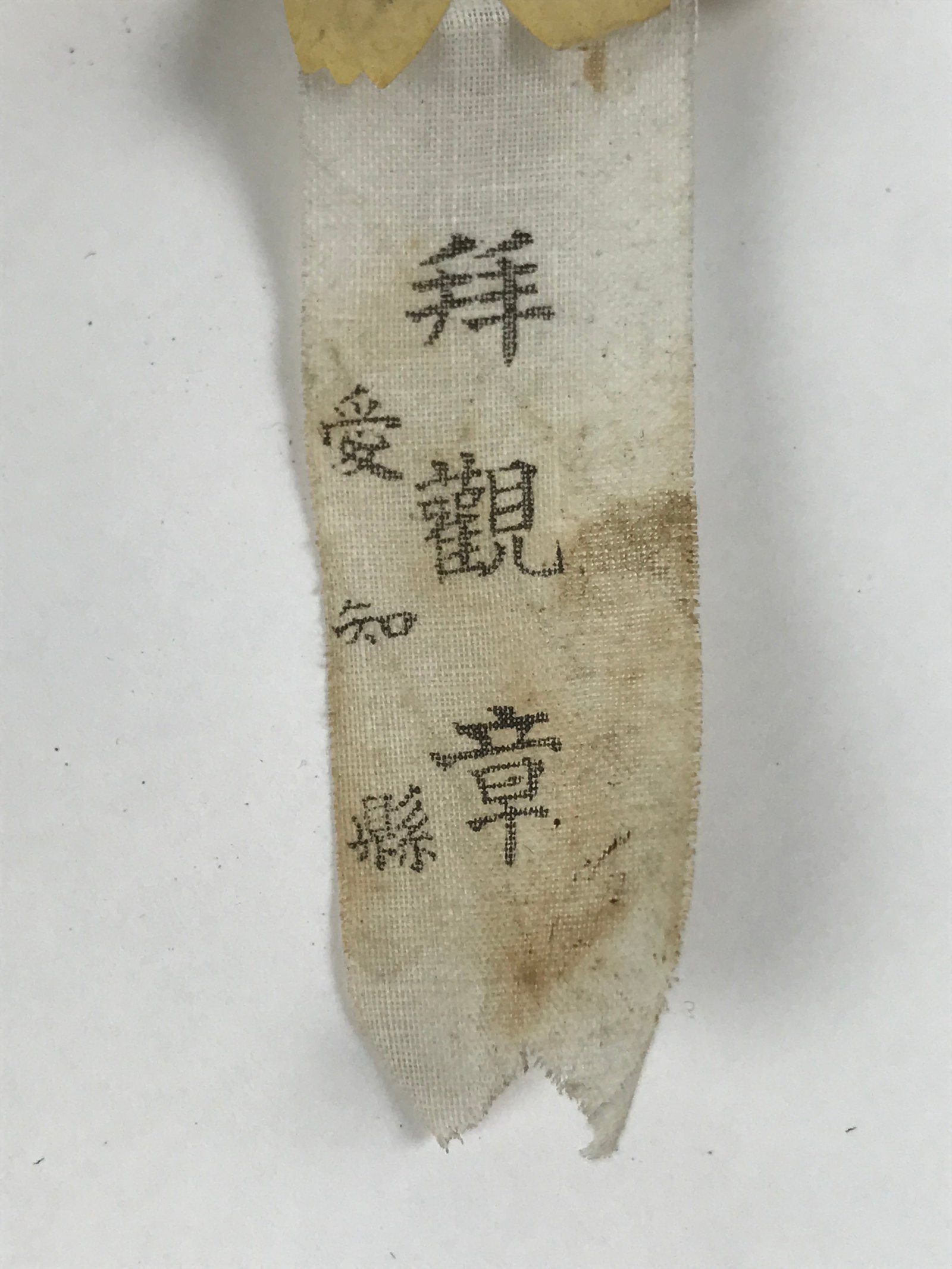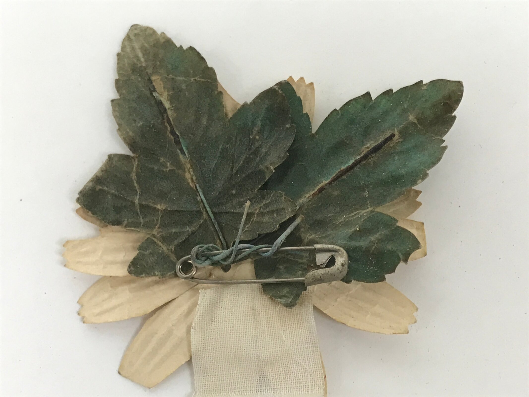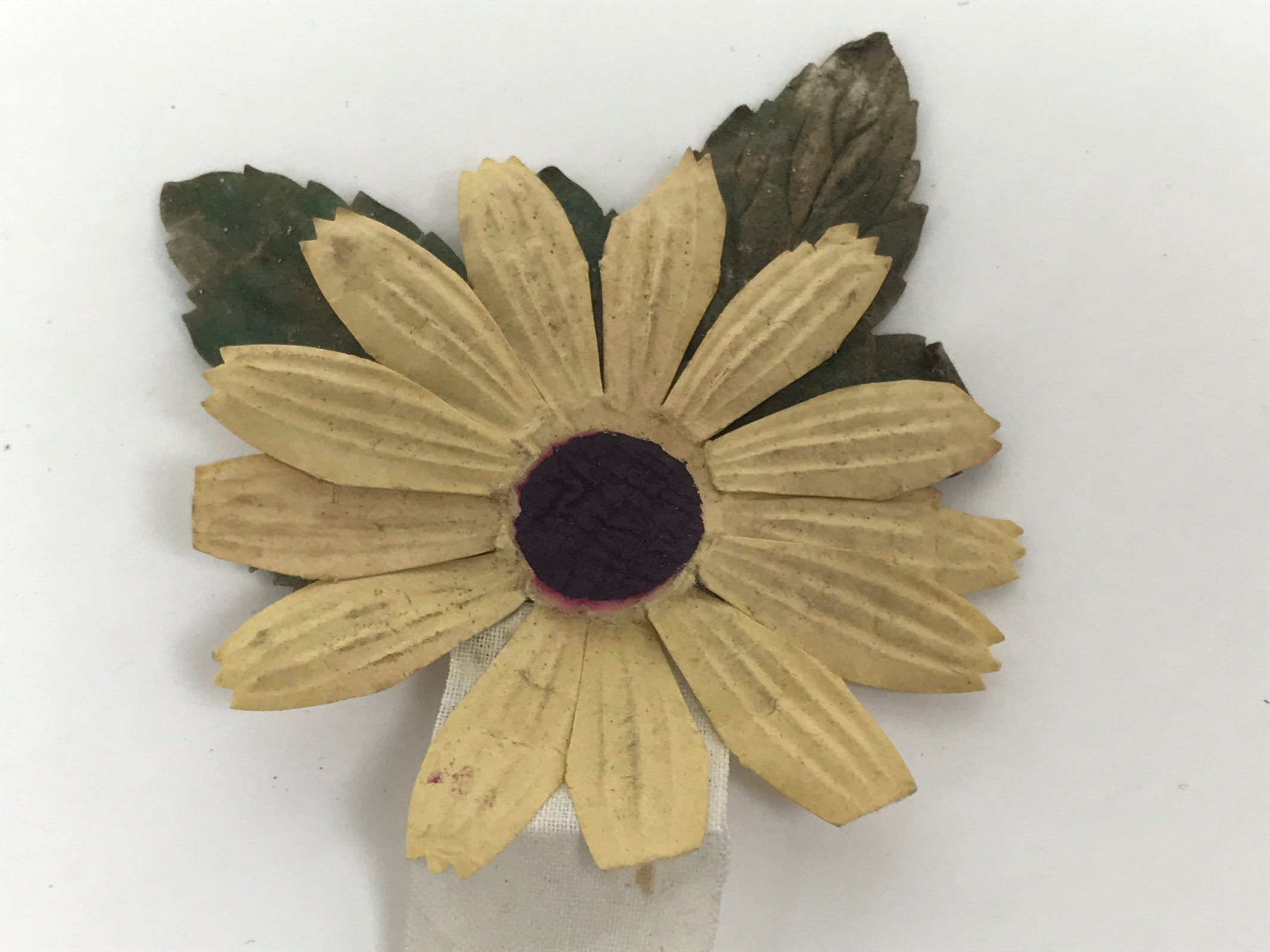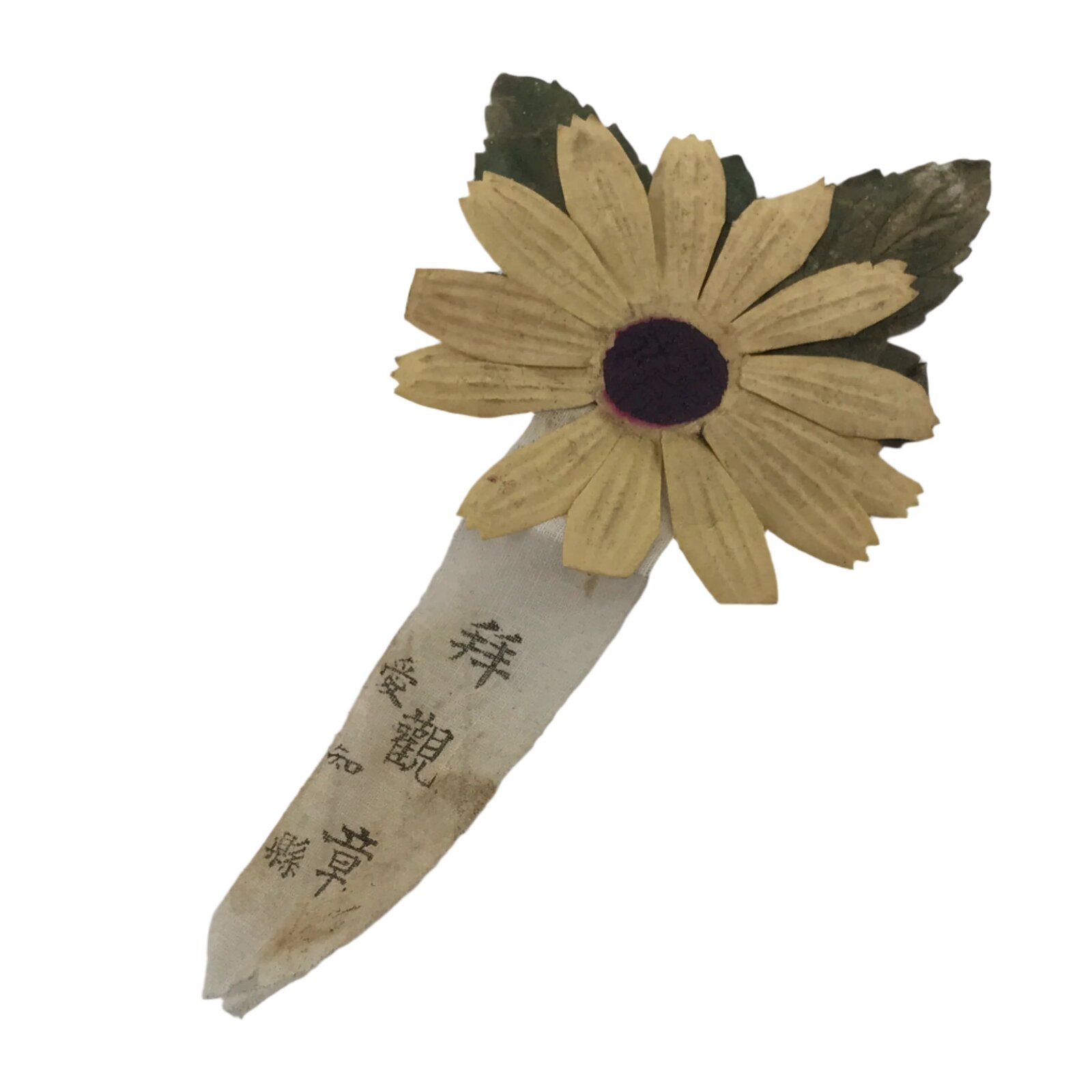 This vintage Japanese medal features a yellow chrysanthemum flower made of paper. The bottom part has text that reads ‘medal for visiting, Aichi prefecture’.