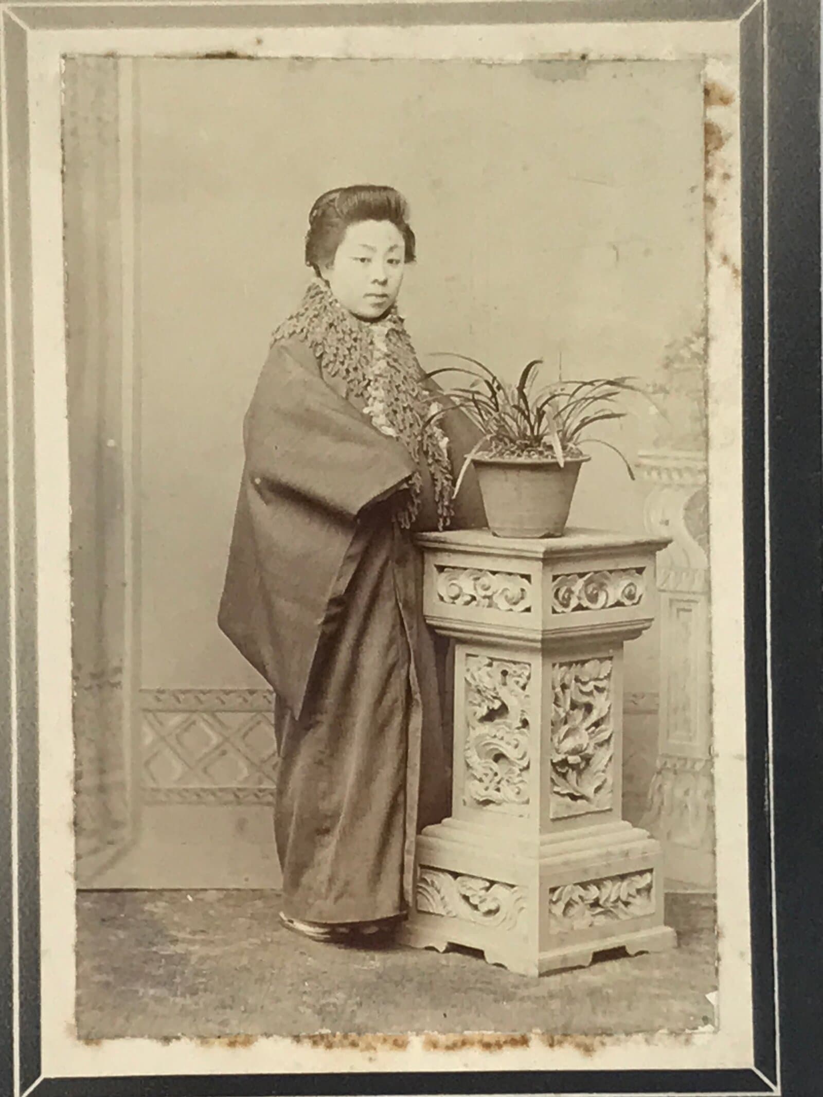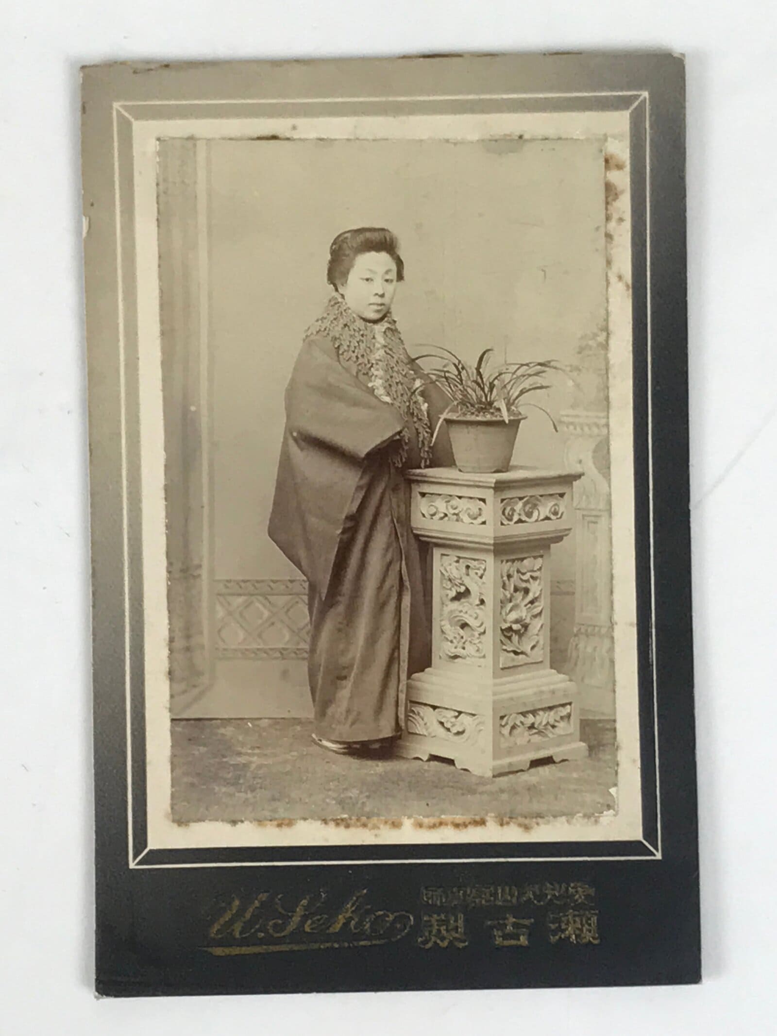 This is an antique Meiji Era portrait photograph of a woman in black in white. She is wearing a formal kimono and long haori with a shaggy scarf. She poses next to a pedestal with a potted plant on it. It comes adhered to the original thick, decorative paper card.
