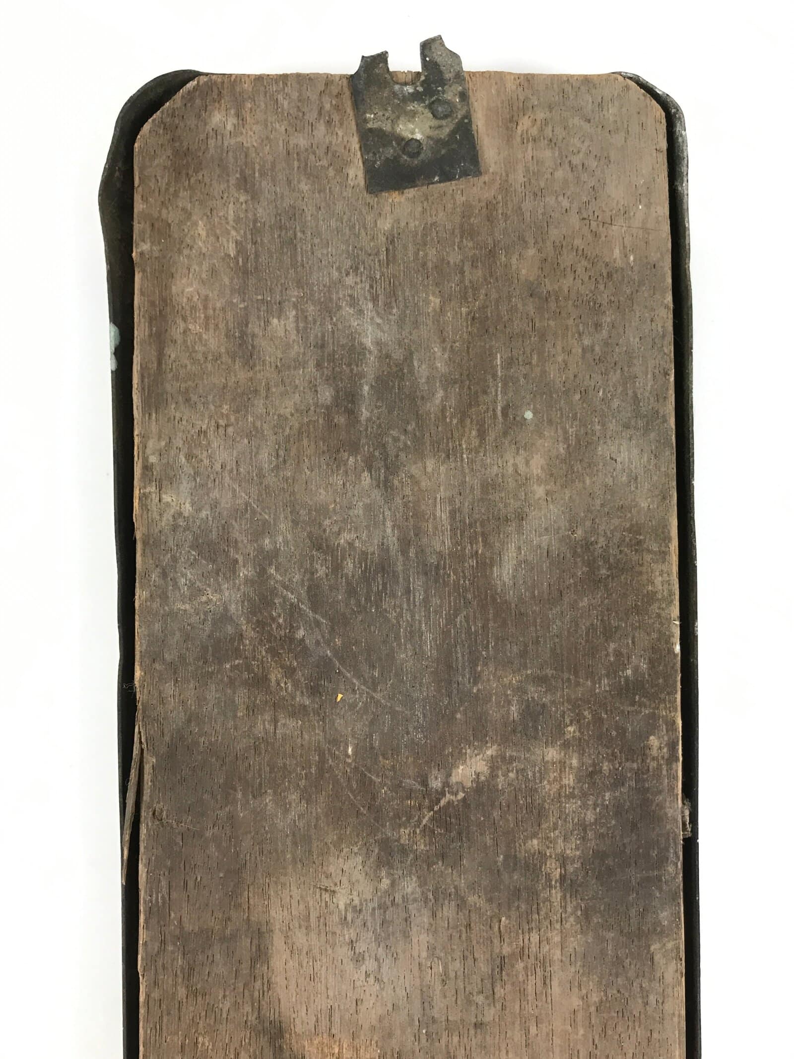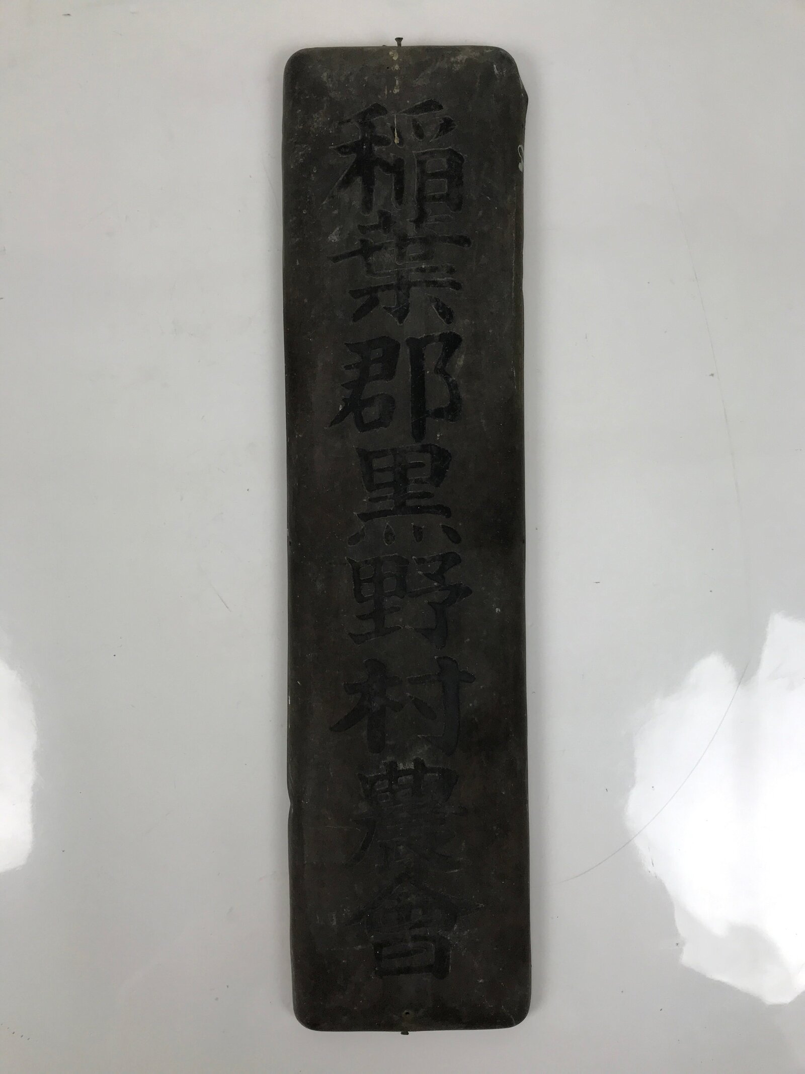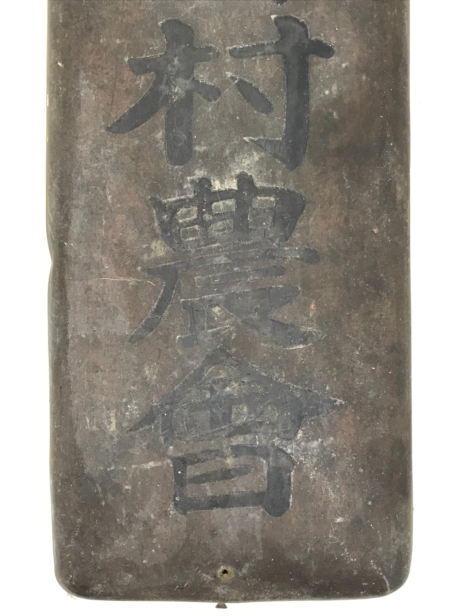 This is a vintage Japanese metal and wooden signboard made to be placed outside a business. There are black kanji characters written vertically on the board and it says “Inaba-gun Kurono Village Agricultural Association” (稲葉郡黒野村農會). The front part of the sign is metal while the back part is a piece of wood to keep the shape. There is a broken hanger on the back side that is replaceable. Kurono Village became part of Gifu City in 1950.