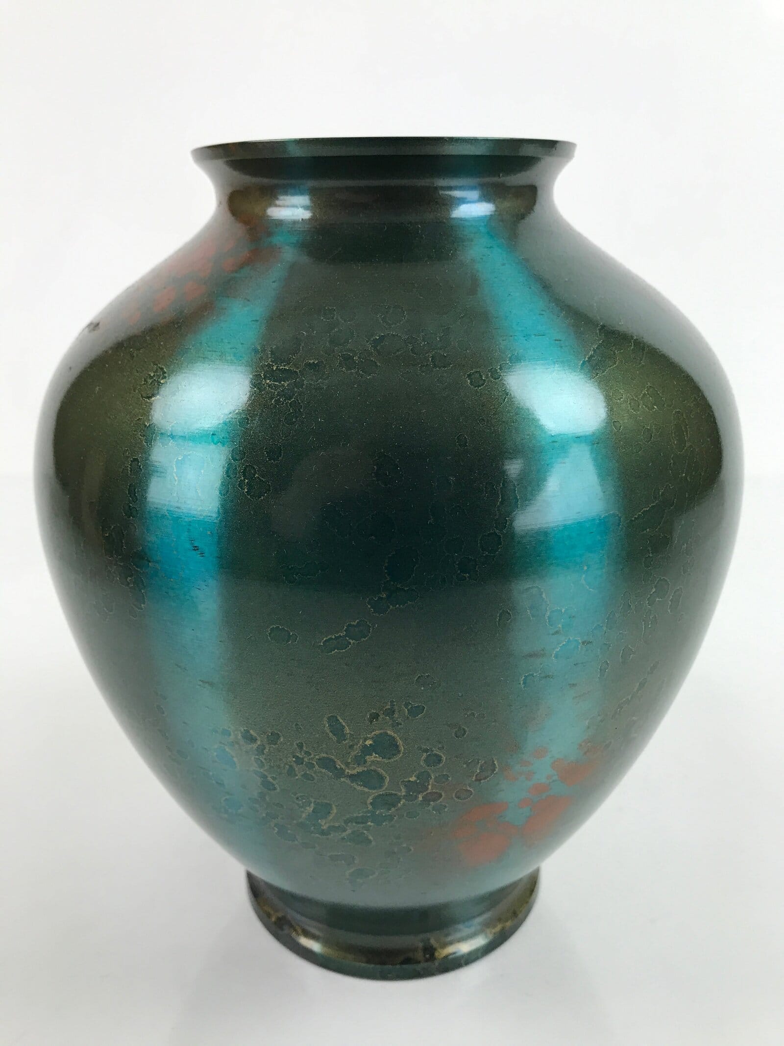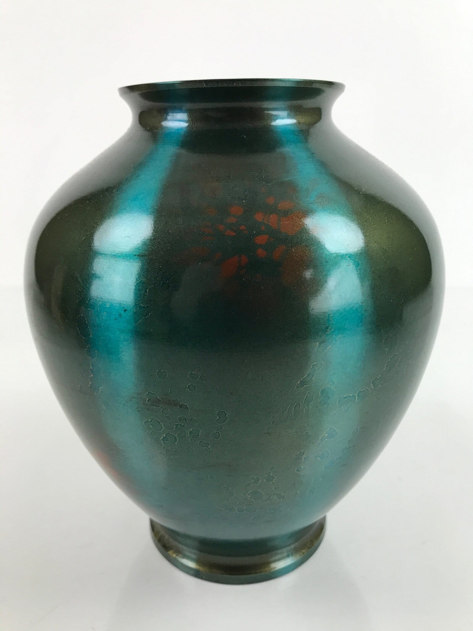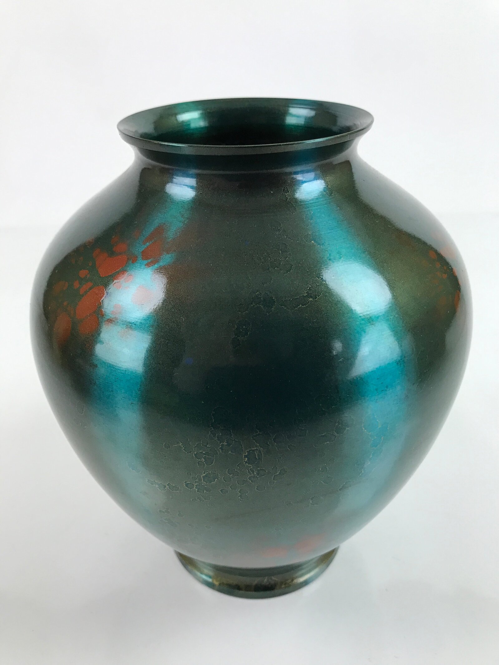 This Japanese vintage metal flower vase or kabin has an elegant round shape and a beautiful iridescent green color with brown spots. It has a seal on the bottom. It is sold in a wooden box, perfect for storage when not on display. This vase can be used for Ikebana flower arrangement. It is an elegant piece, suitable for any season and ideal for any home or office.