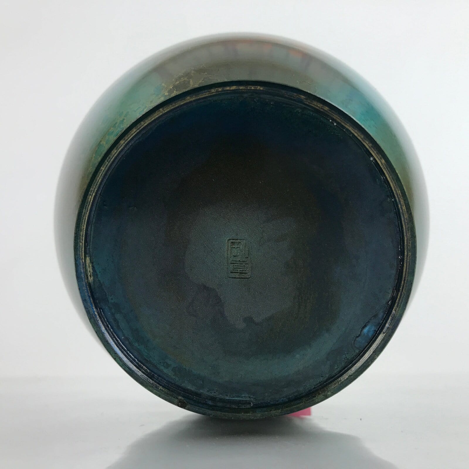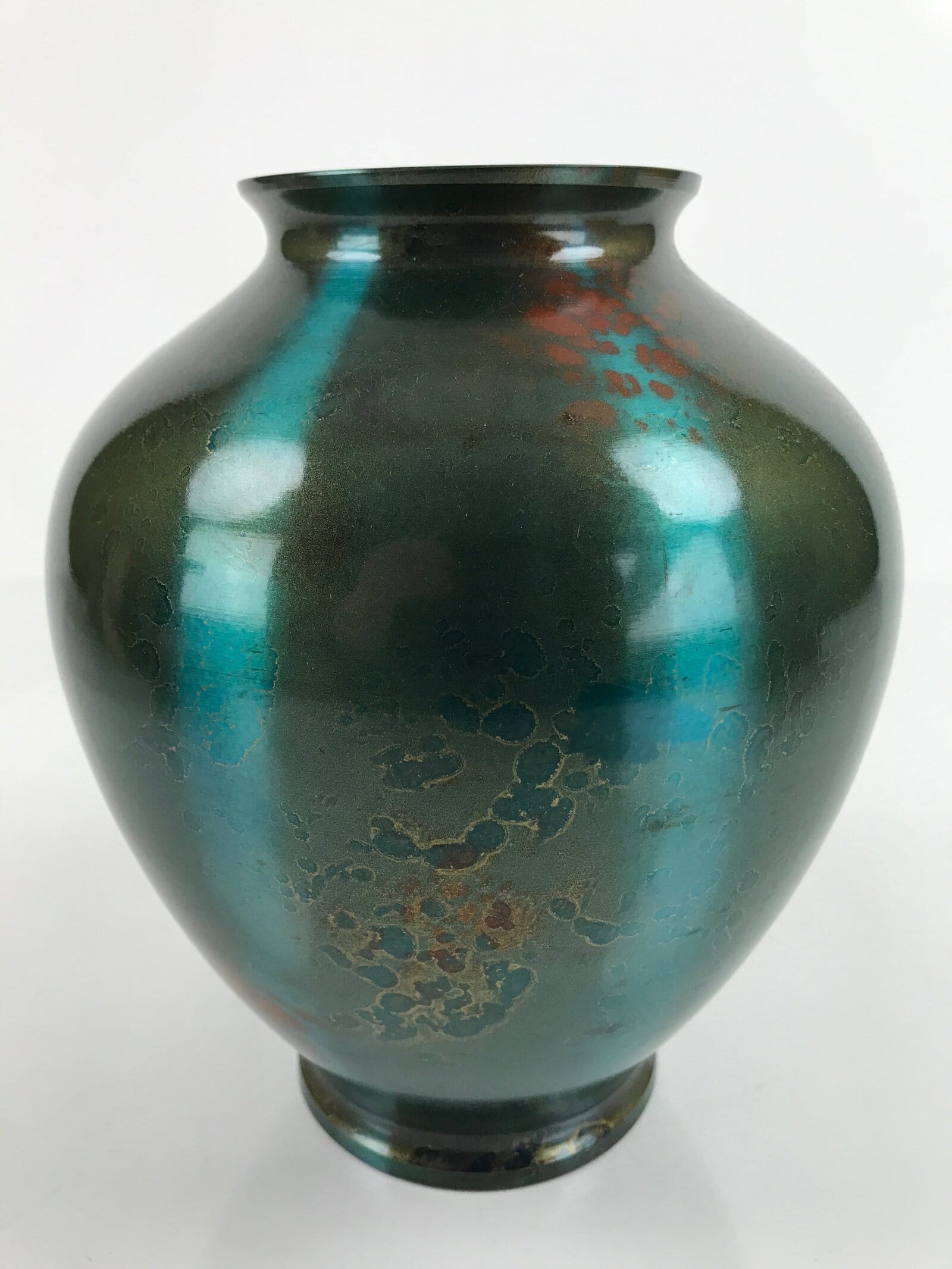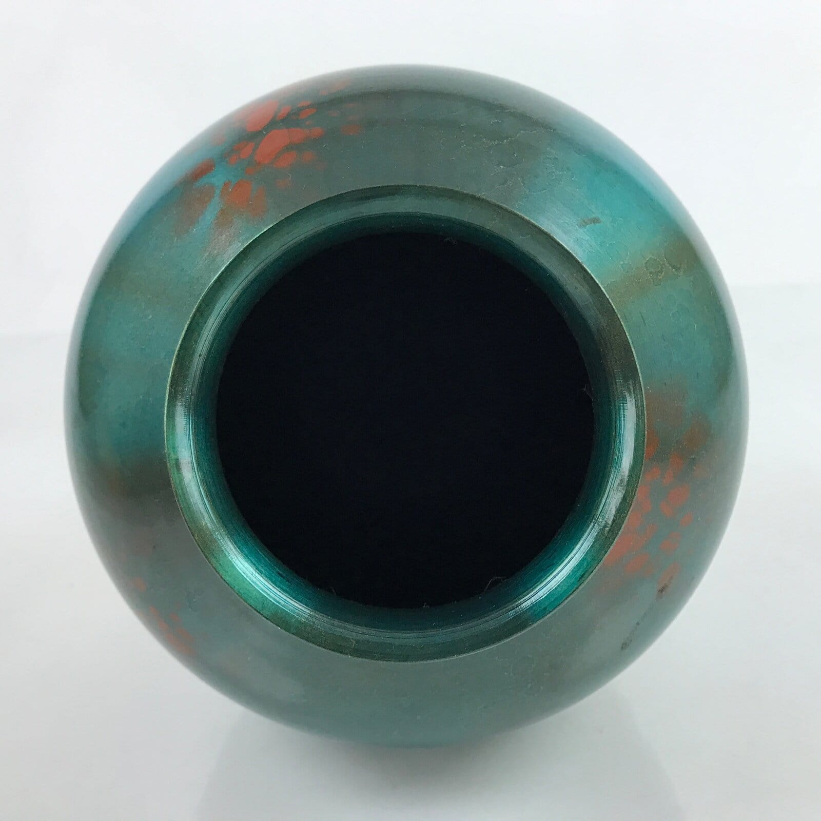 This Japanese vintage metal flower vase or kabin has an elegant round shape and a beautiful iridescent green color with brown spots. It has a seal on the bottom. It is sold in a wooden box, perfect for storage when not on display. This vase can be used for Ikebana flower arrangement. It is an elegant piece, suitable for any season and ideal for any home or office.