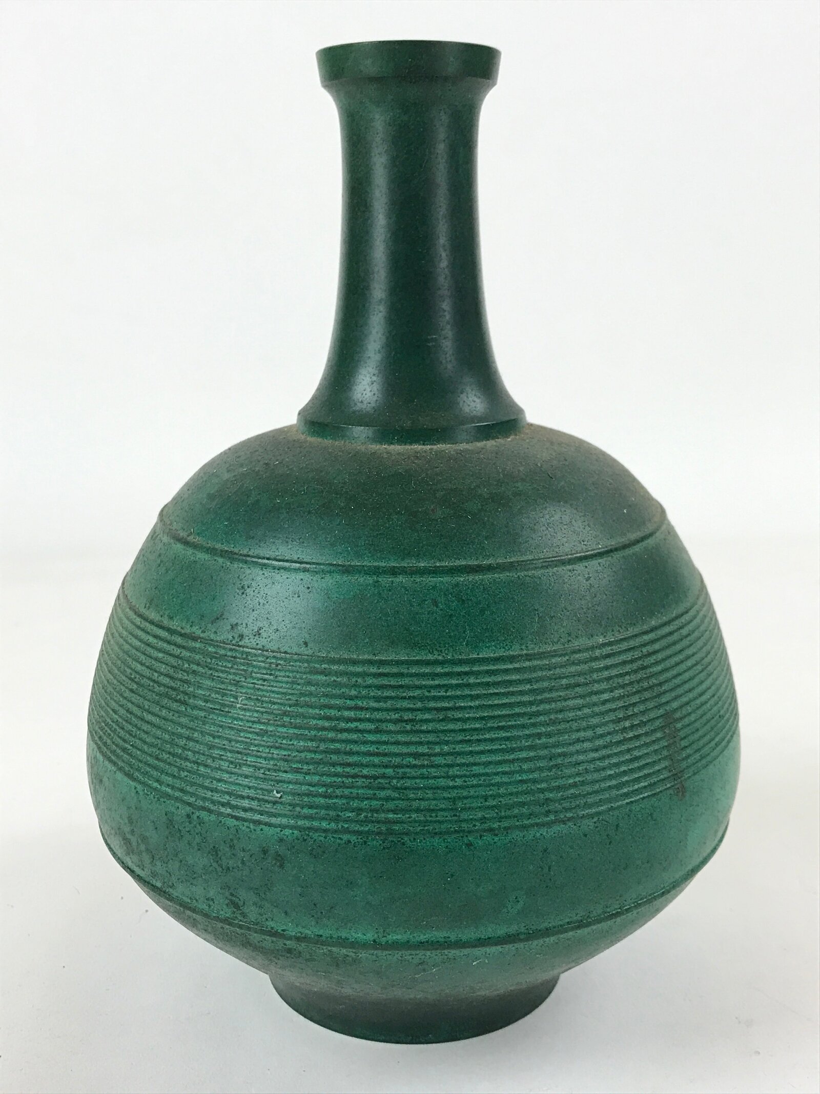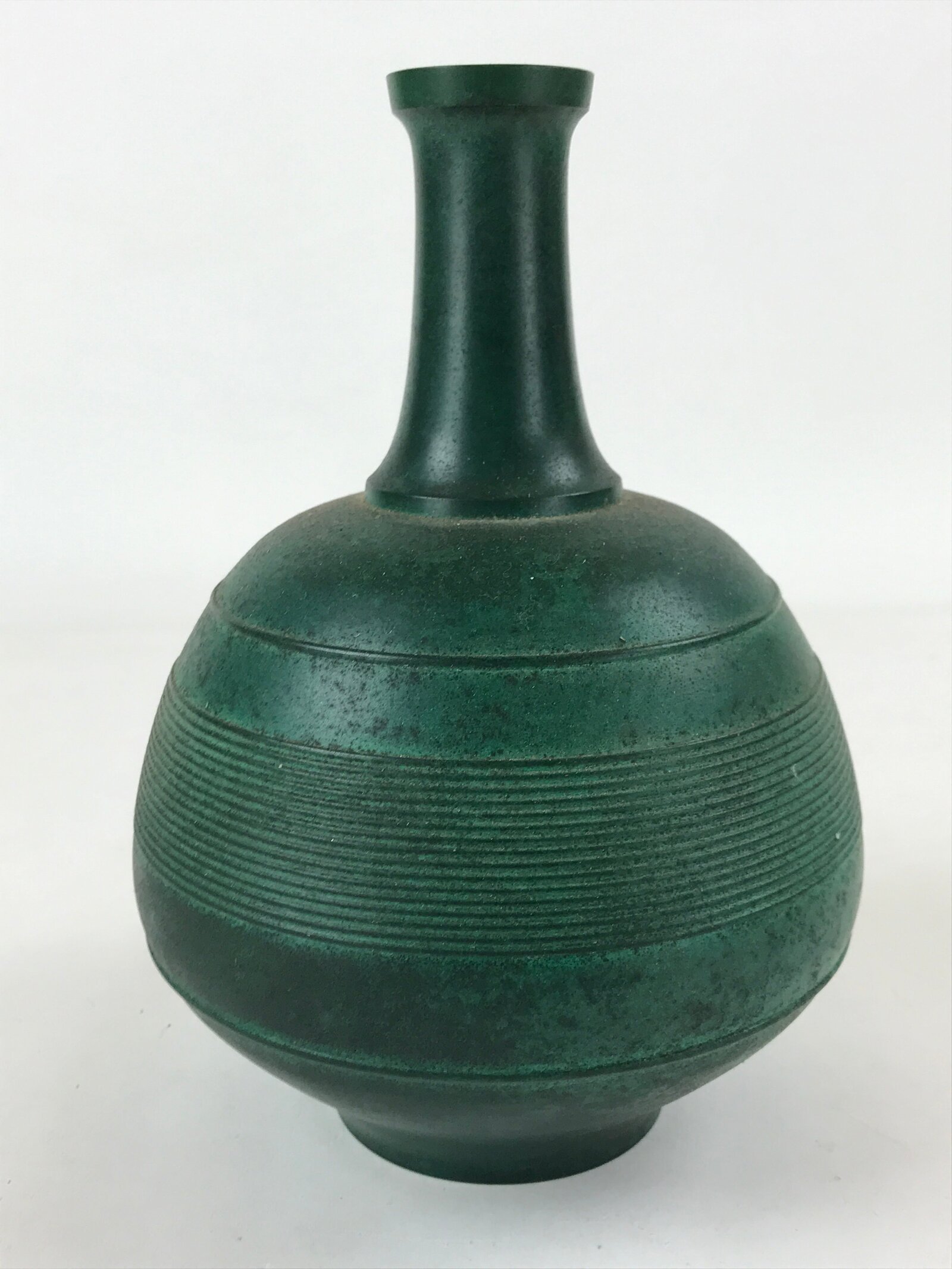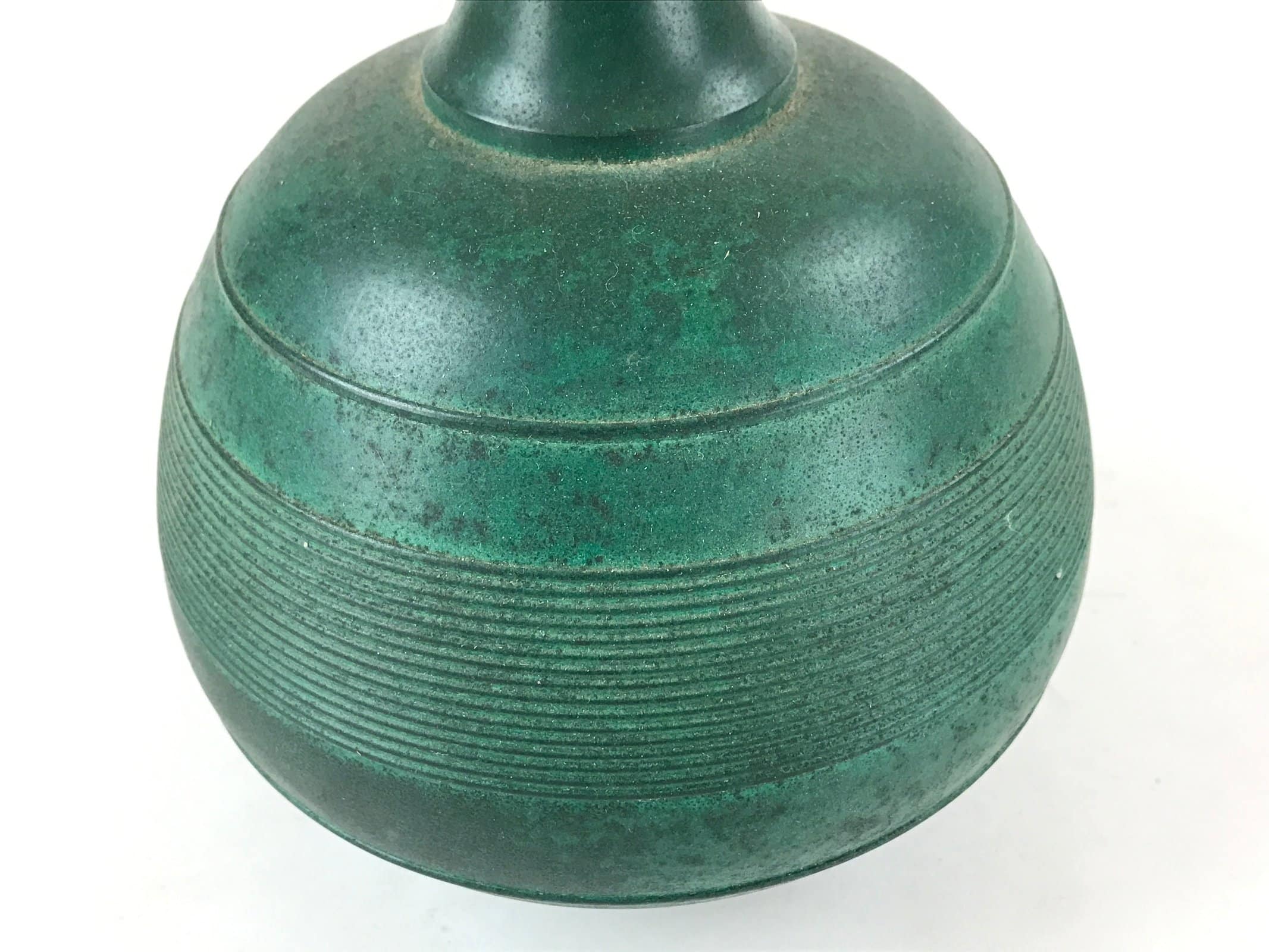 This is a Japanese vintage flower vase or kabin. Used for ikebana flower arrangements, this heavy green bronze metal vase has a long and narrow neck and a round bottom. The bottom part has a series of narrow-line designs.