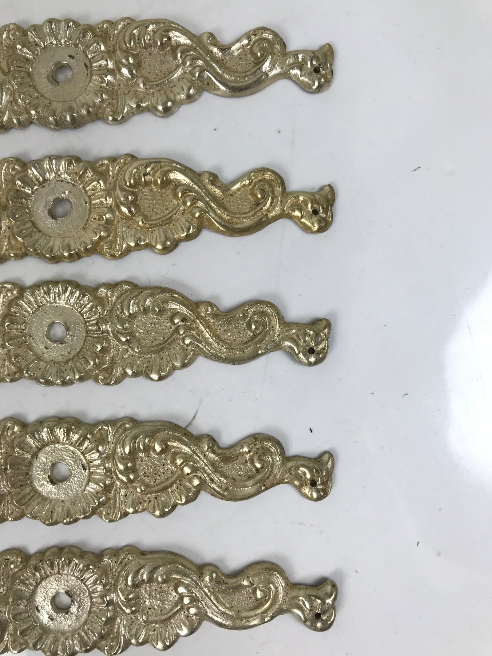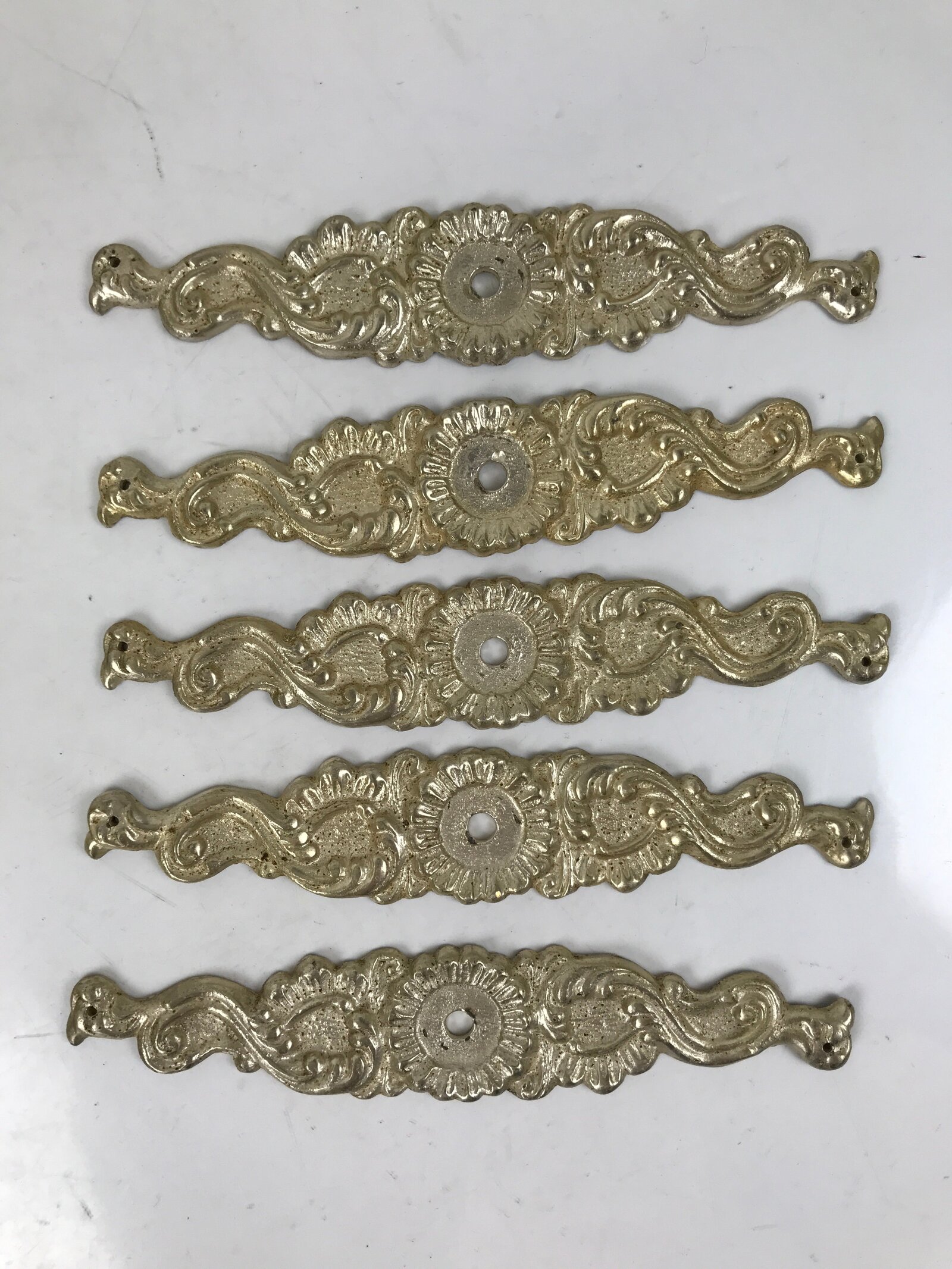 This is a set of five vintage metal backplates for tansu chest drawers and cabinet knobs (sentoku). It has a prominent chrysanthemum motif with twisting vines. There is a hole at the center to fit a knob bolt through, as well as a small hole on either side for small nails to keep the plate secured.