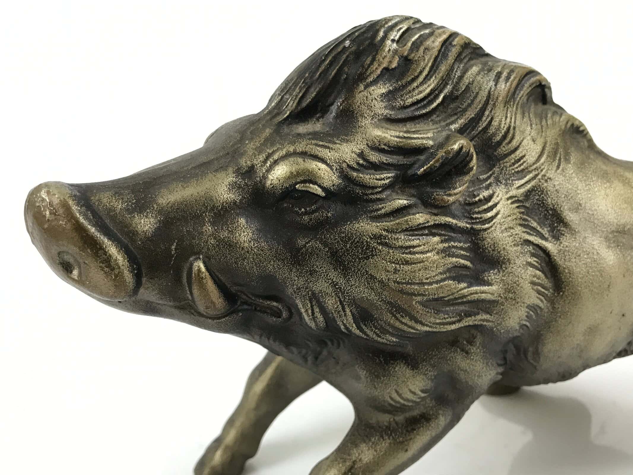 This is a large vintage Japanese metal wild boar statue. Representing the zodiac, this statue has a gold finish and is beautifully detailed. It is steady and will not tip over easily. The wild boar is associated with fertility and financial prosperity.