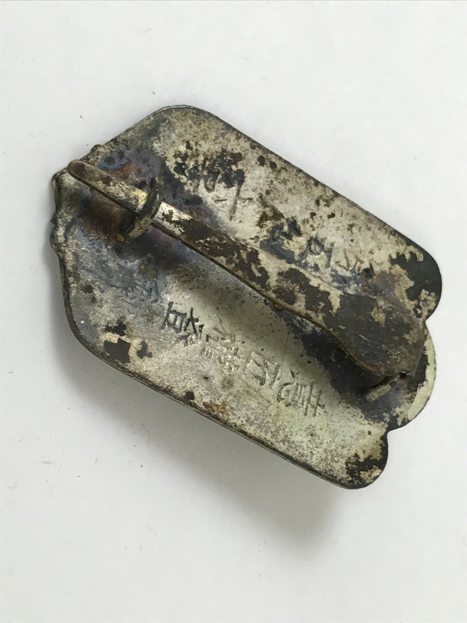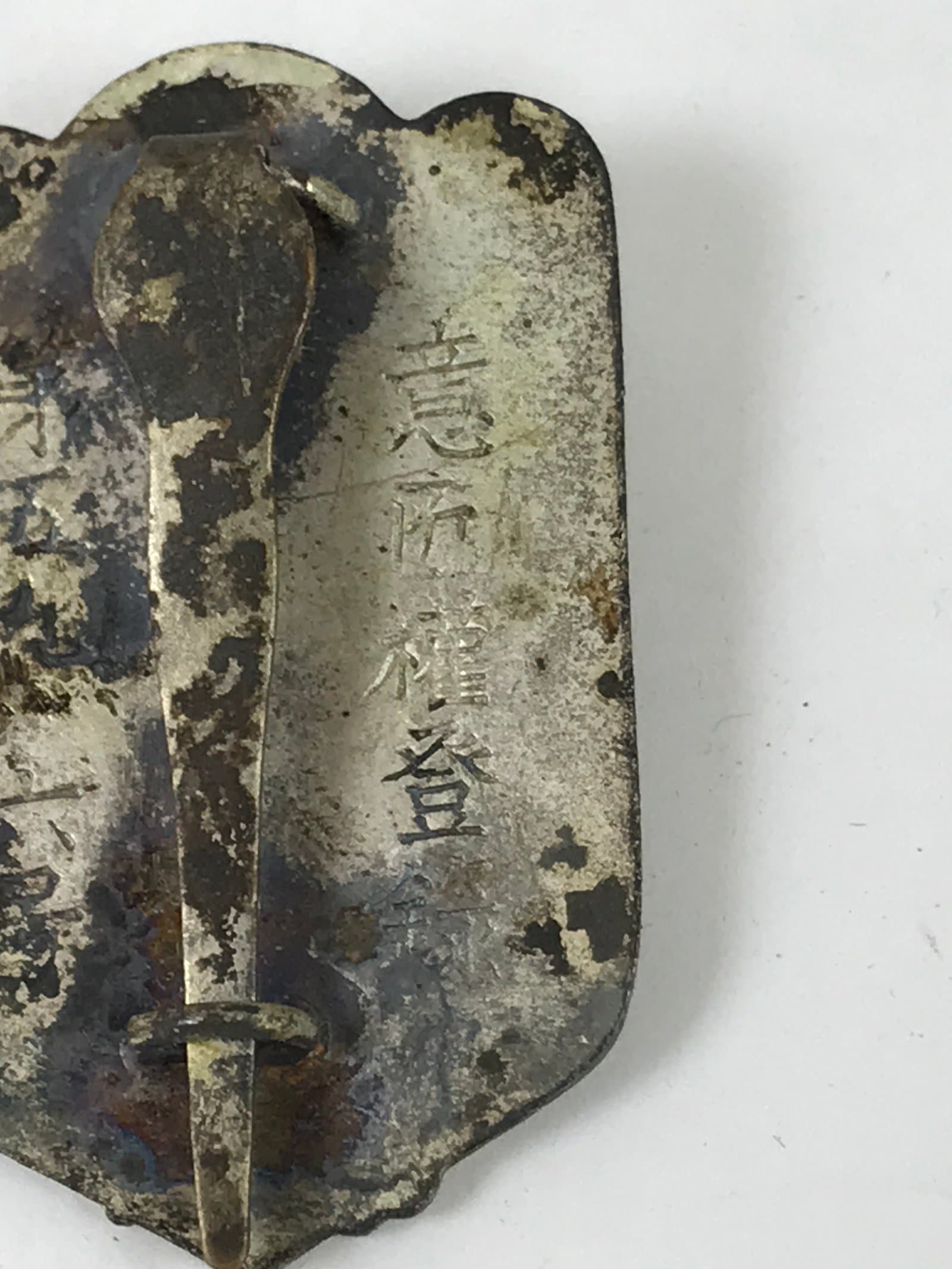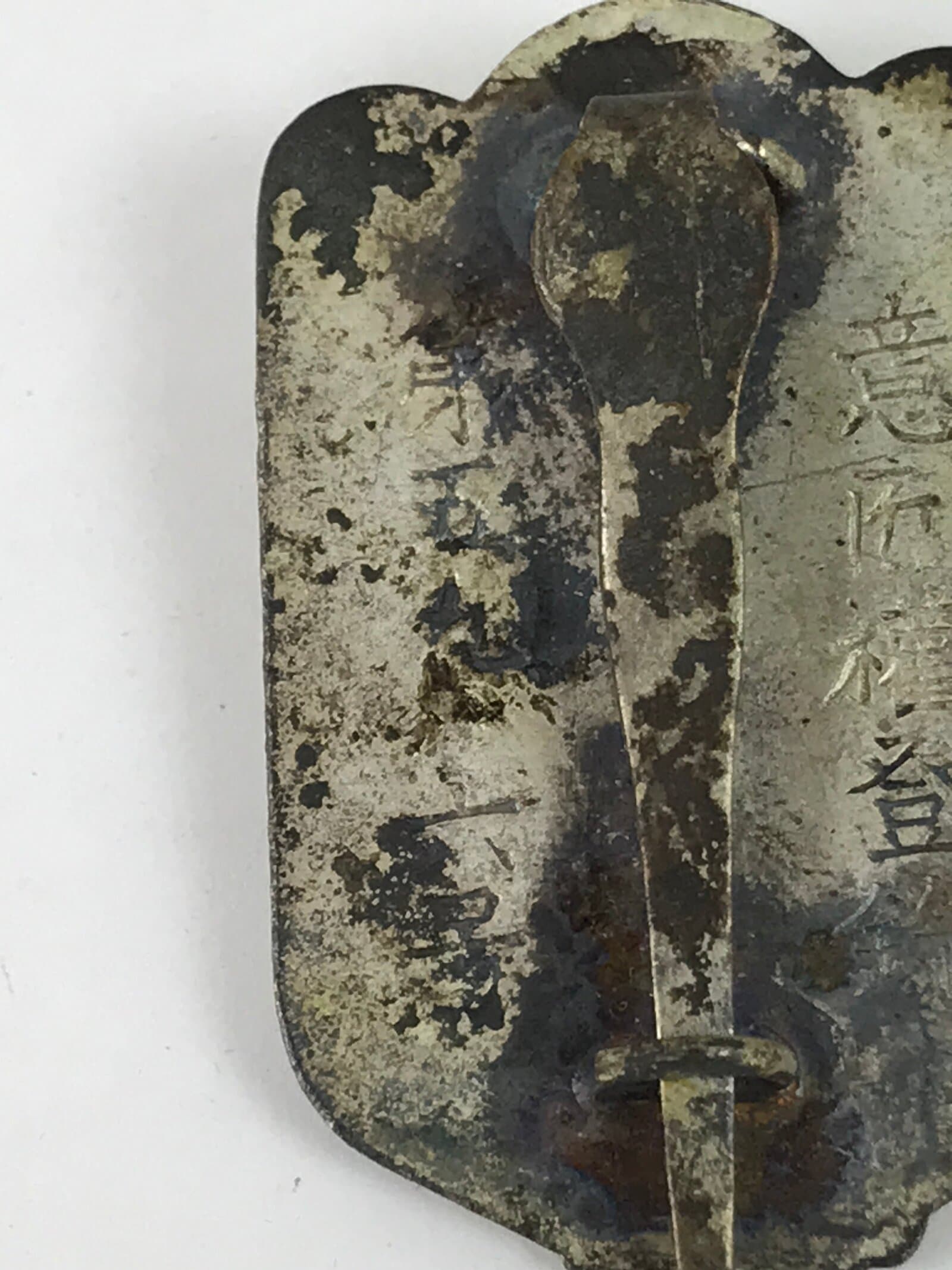 This vintage Japanese metal pin badge was for Imperial Japanese Army reservists. It has a golden star and an anchor on a white background at the front, and inscriptions on the back.