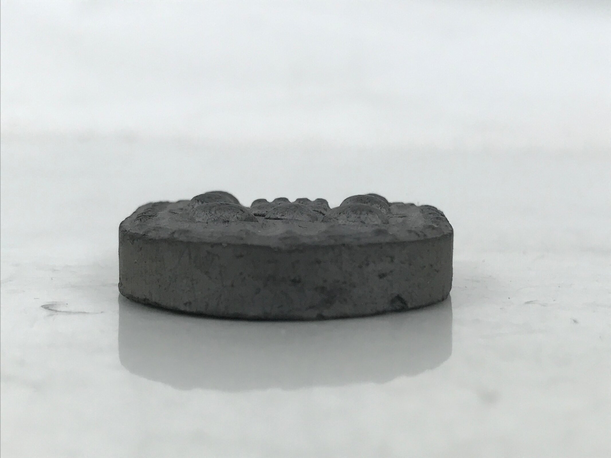 This is a miniature Japanese sculpted clay oni demon roof tile (kawara) decoration often found on temples and sometimes private residences. Also called onigawara, this ridge-end tile acts as an amulet to frighten off evil spirits and ward off misfortune and disaster. It appears to be a simple amulet/souvenir from Mt. Oe in Kyoto Prefecture.