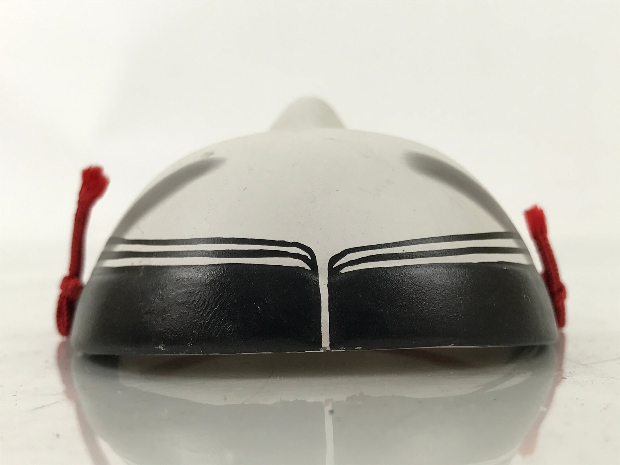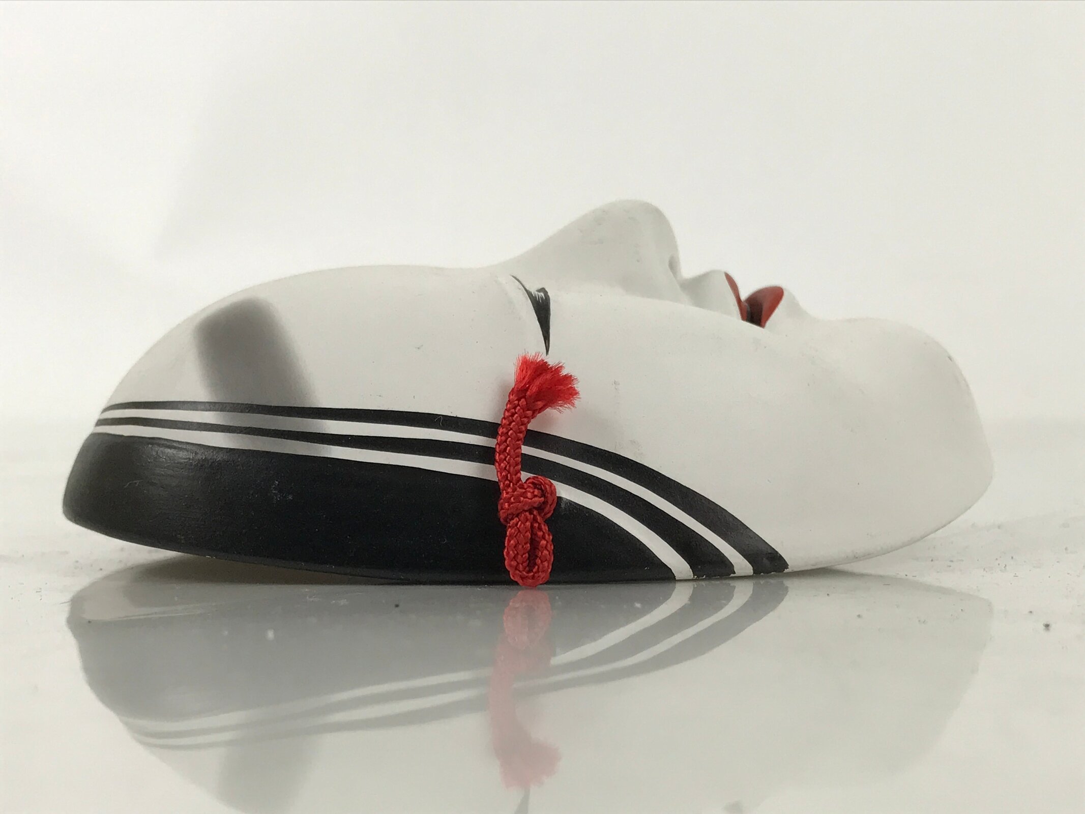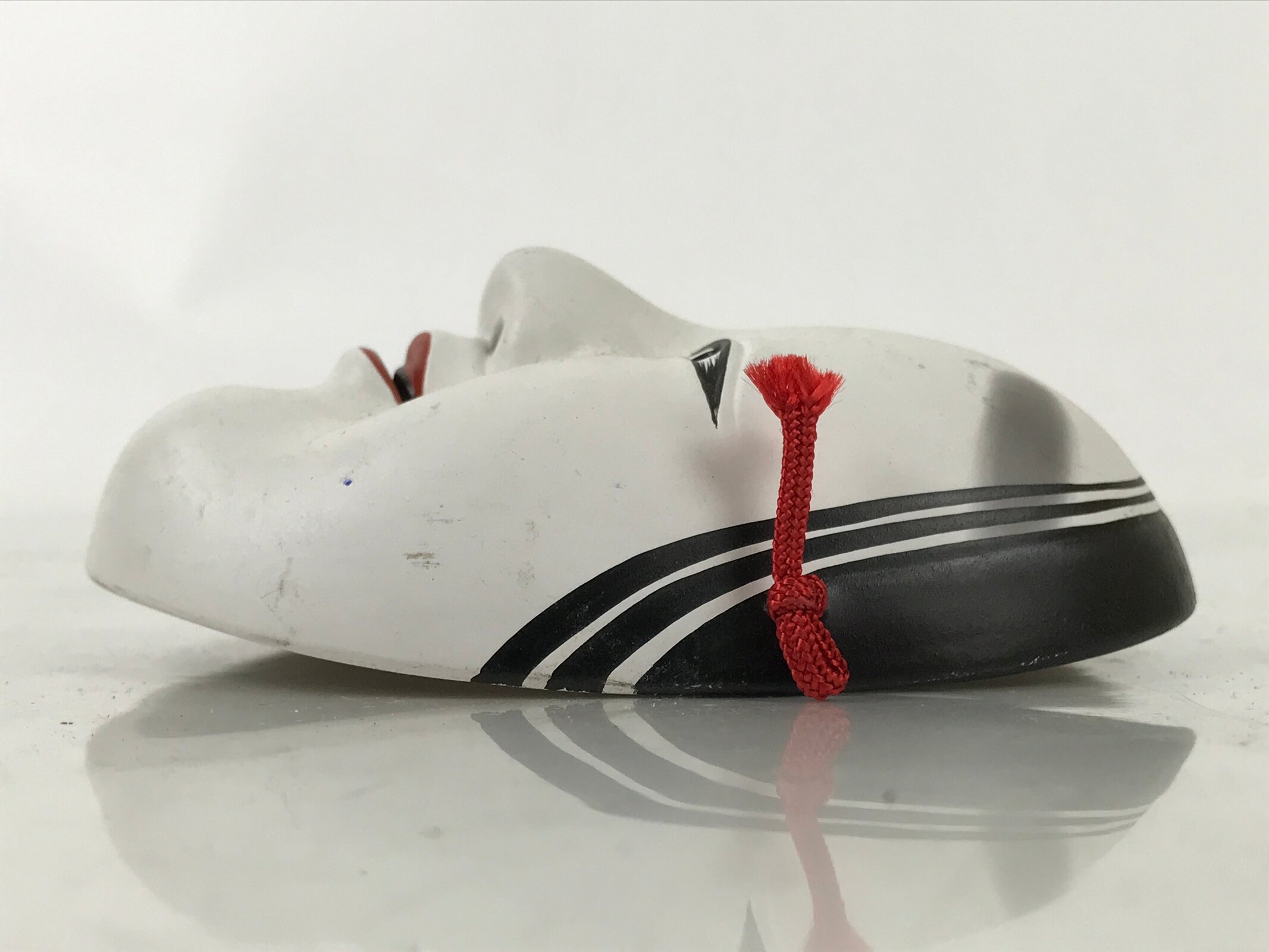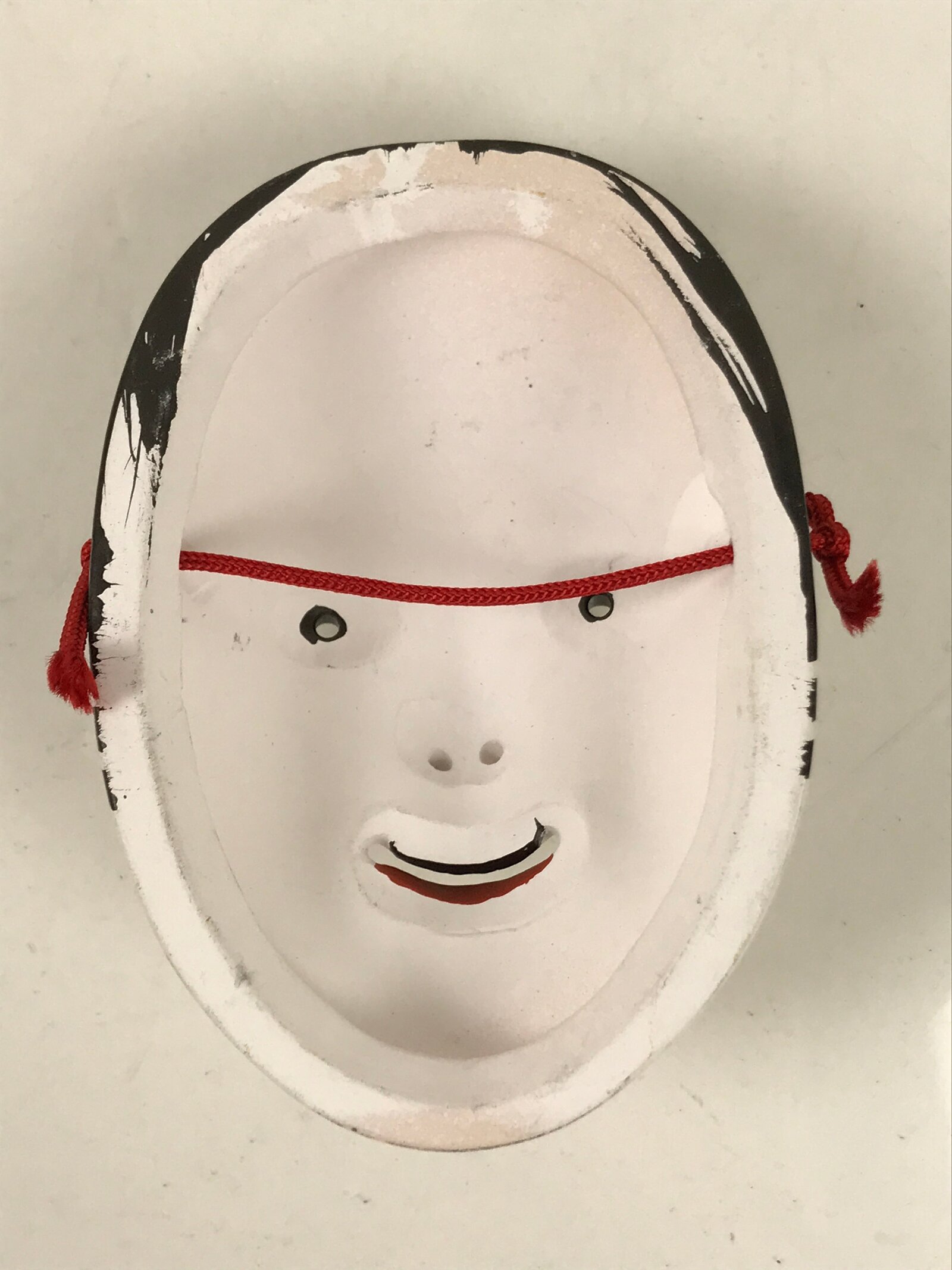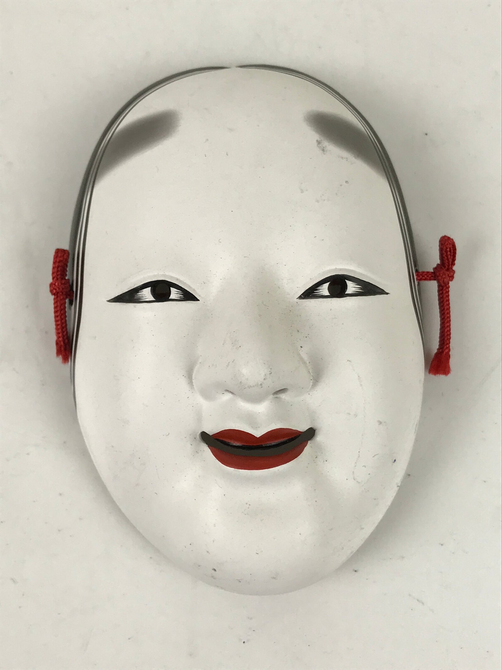 This is a vintage Japanese miniature ceramic noh mask (noh-men) decoration. This character is the face of a young girl (ko-omote). It can also be called onna (woman) on a more broad scale. This character, literally meaning “small face” is typically used in performances as a young girl or supernatural being. It is characterized by a narrow face with neatly parted hair, soft brows, and a slightly open mouth. This mask has a red string fitted through two holes. It can be used for all kinds of home and office decor.