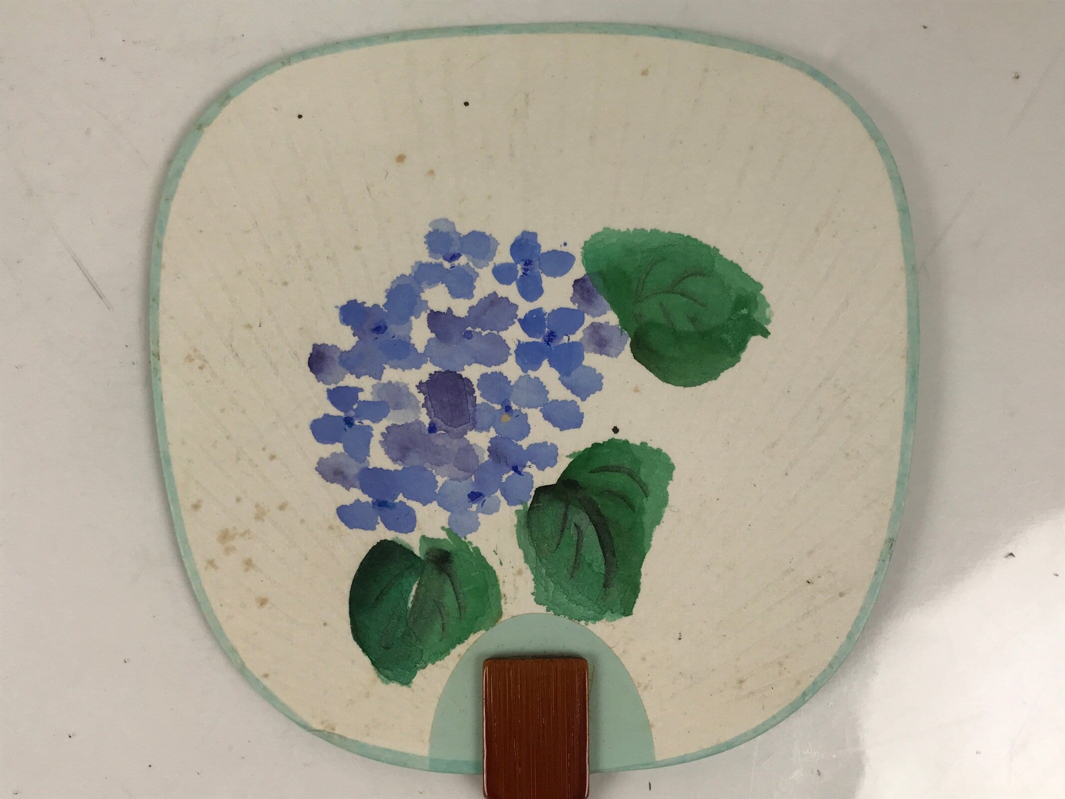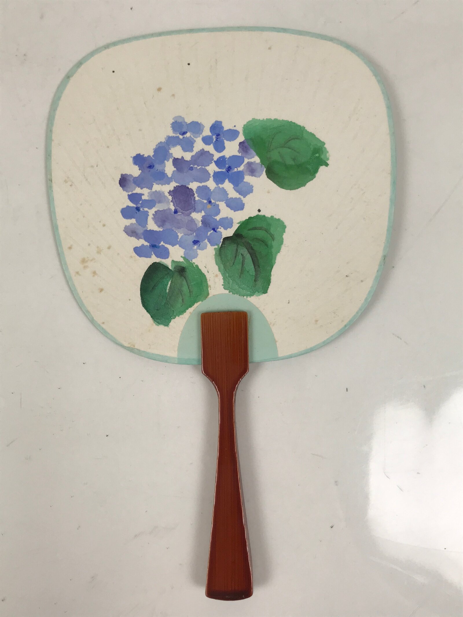 This is a miniature Japanese vintage paper fan or Uchiwa. Uchiwa is a traditional fan tool typically made of wood or bamboo and paper in a flat paddle-like shape. This particular fan features a cluster of purple hydrangeas with a white background and light blue border. The handle is lacquered a glossy medium brown. This compact size of uchiwa is a popular item used as decoration in Buddhist home altars as well as for fanning incense.