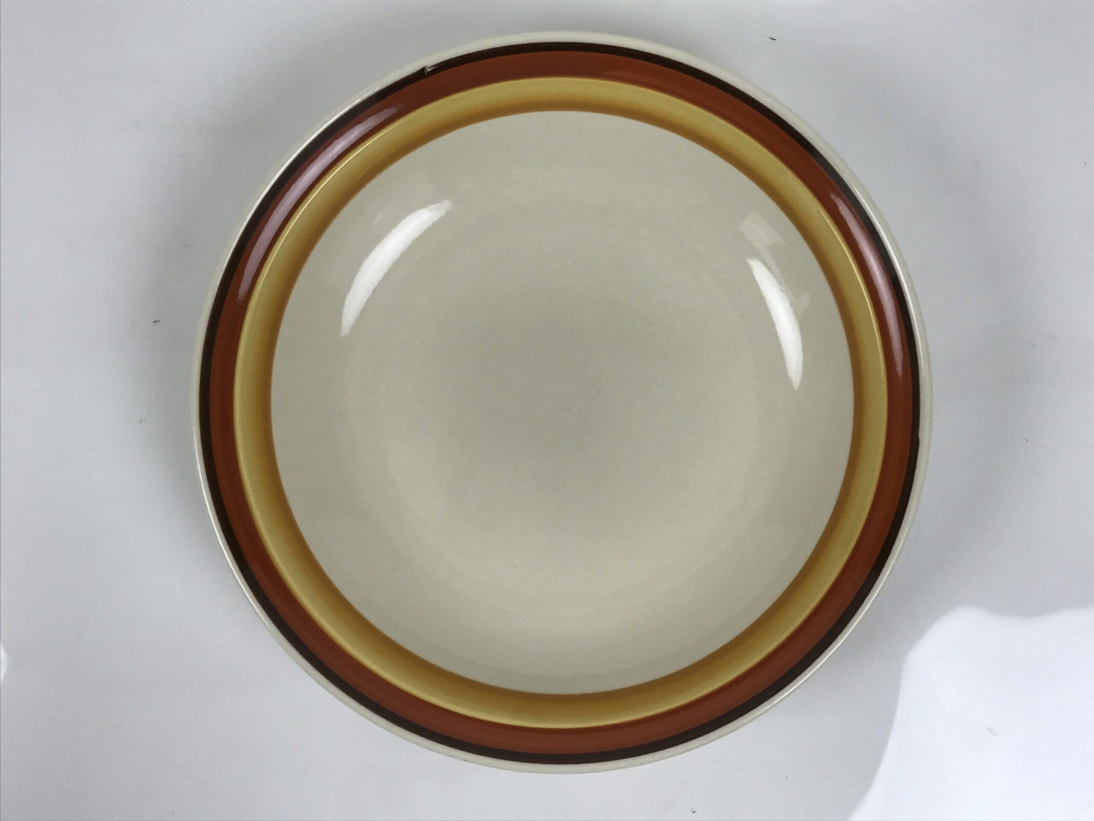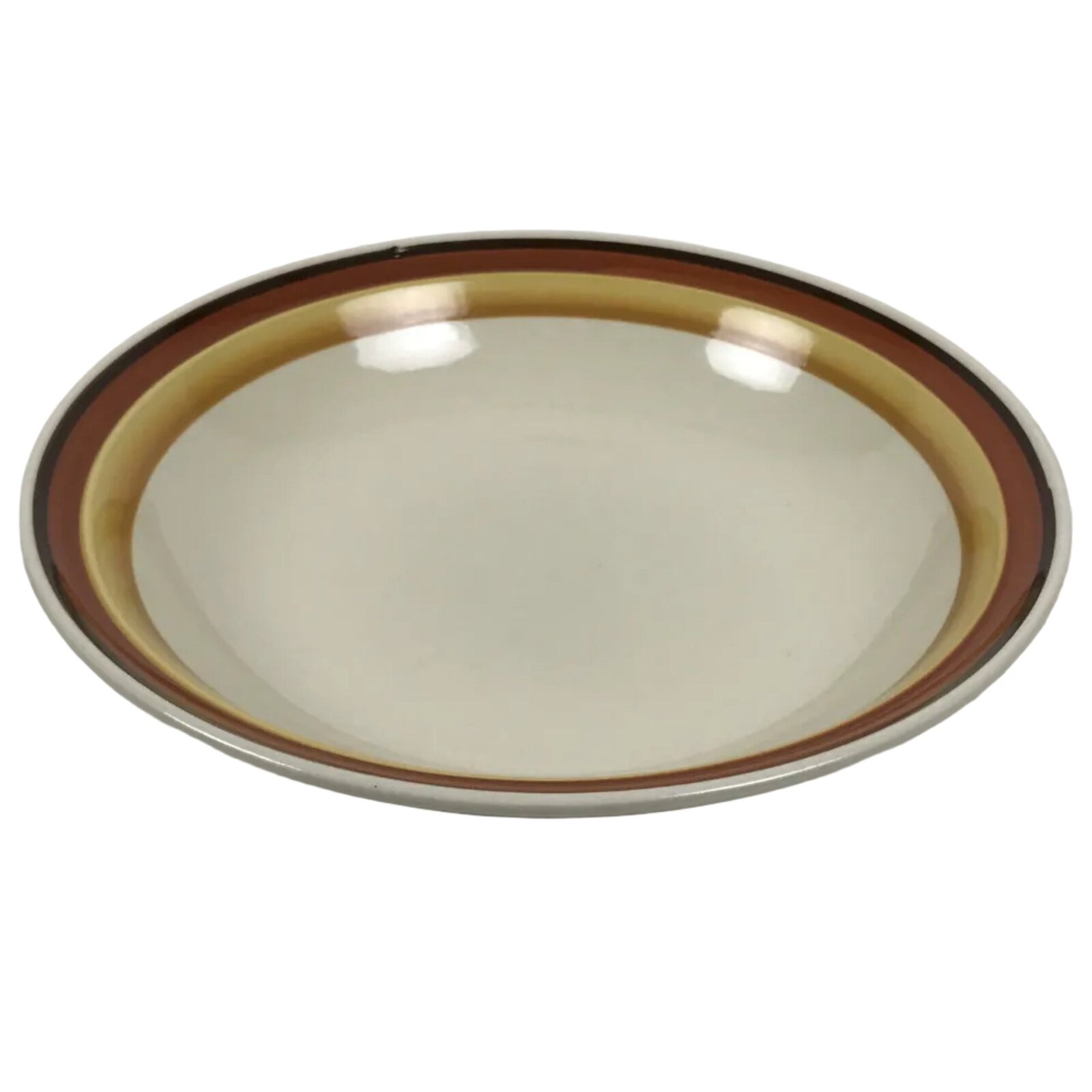 This item is a vintage Japanese stoneware bowl. This wide-mouthed, shallow bowl is mostly beige with a brown and yellow banded line along the inner rim. The back side has a Miyoshi stamp mark. Due to its shape, this type of bowl is excellent for pasta and salads.