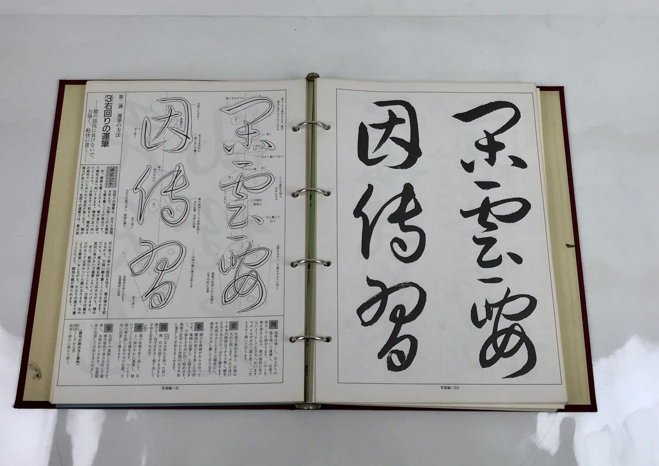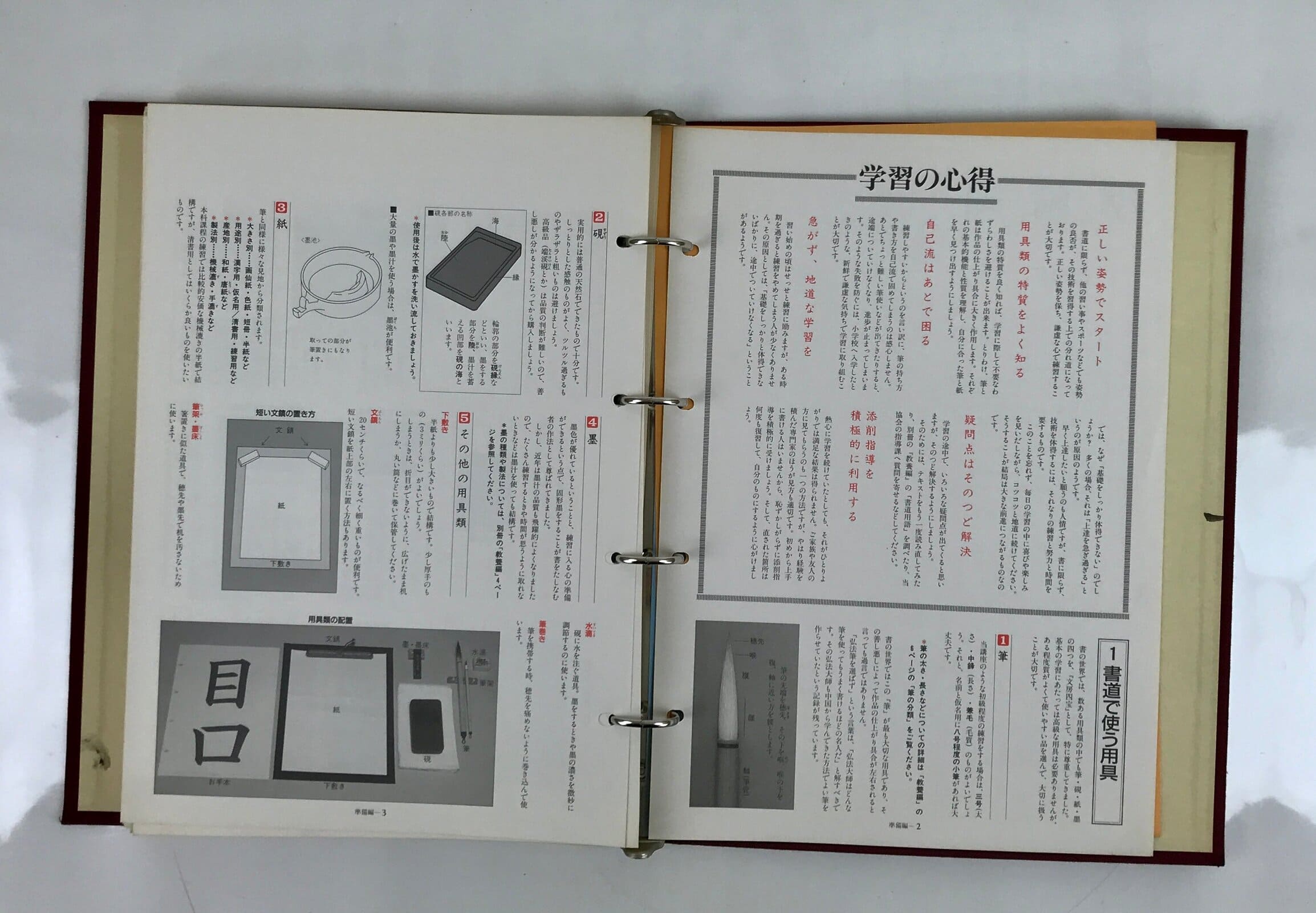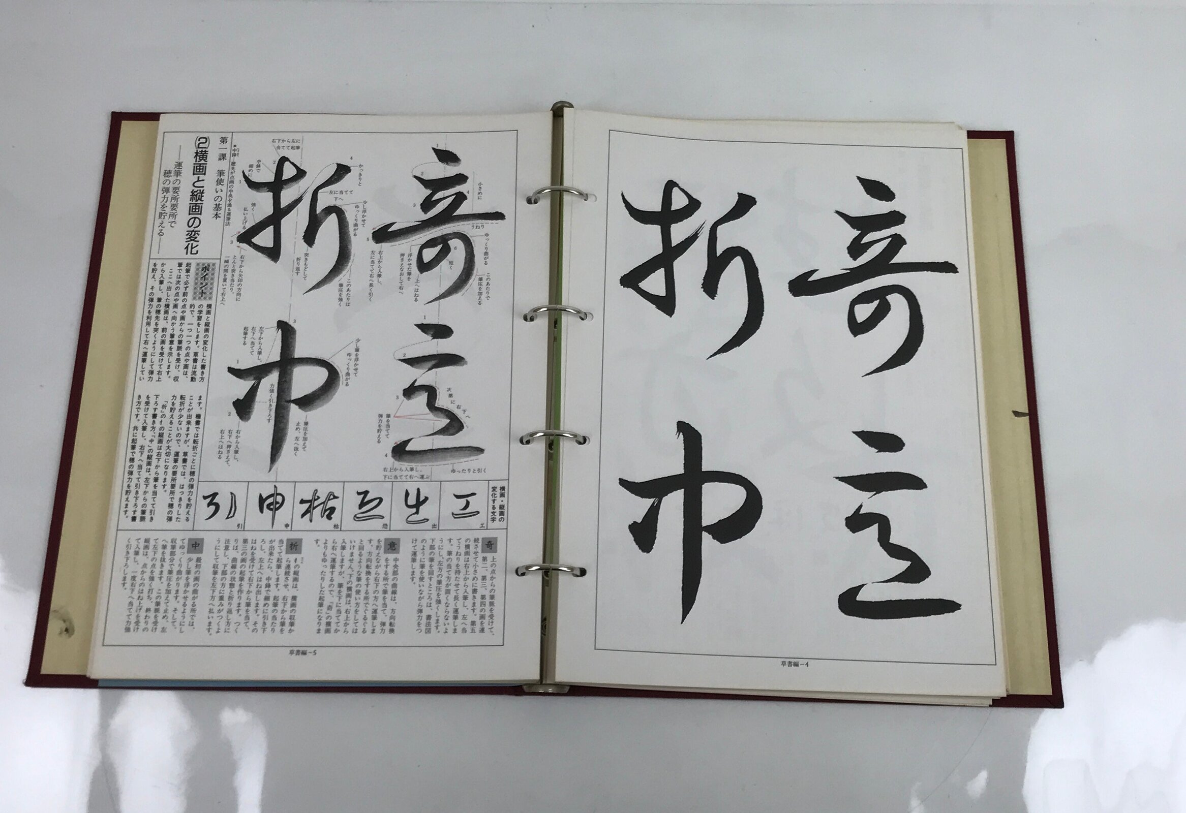 This vintage Japanese modern calligraphy course is divided into sections: getting ready, regular script (kaisho), semi-cursive or running script (gyosho), cursive script (sosho), kana (hiragana and katakana) and daily writings. This course is in a ring binder with large format pages for easy use. For each script, you have several examples with detailed explanations of applying the ink and which pressure to apply to the brush.