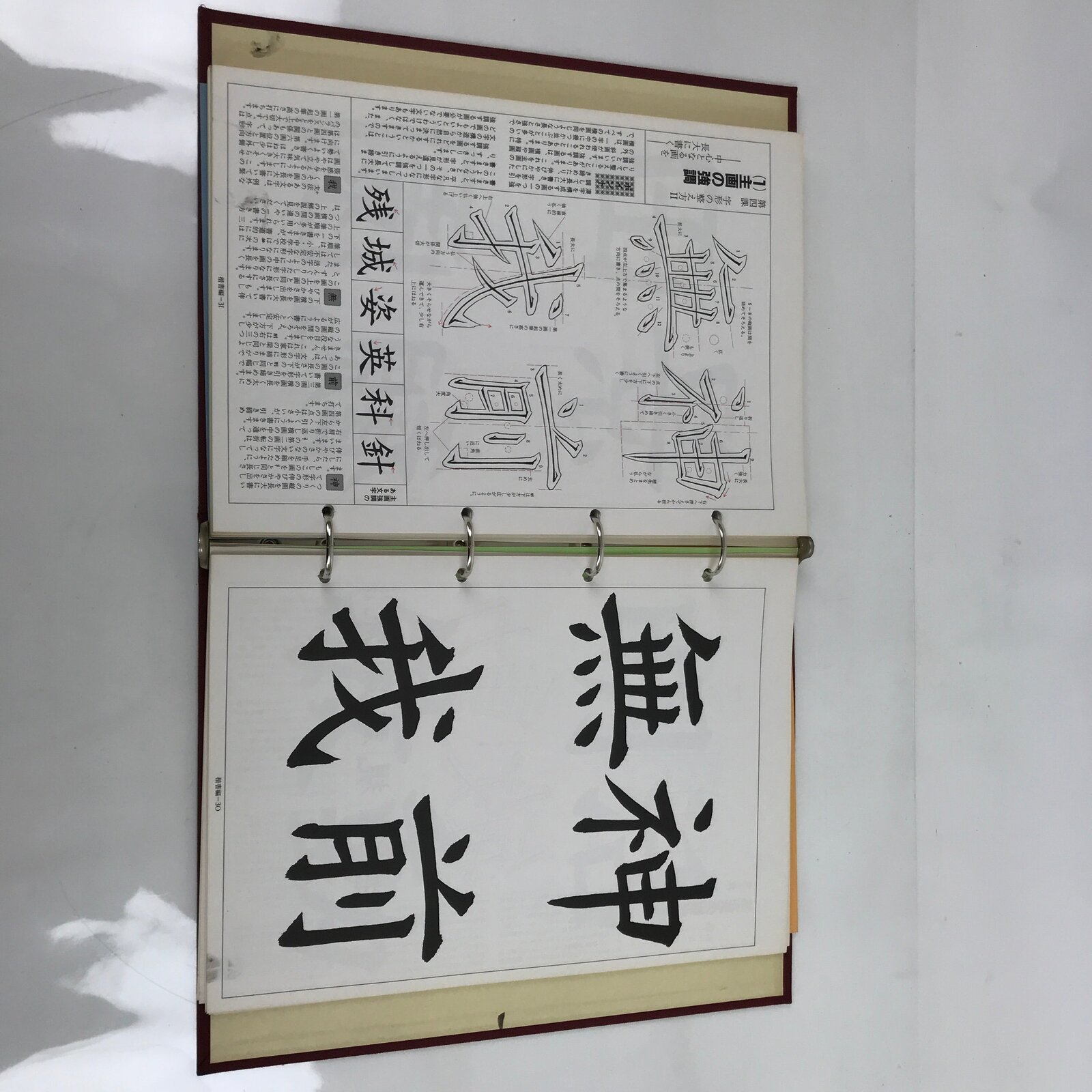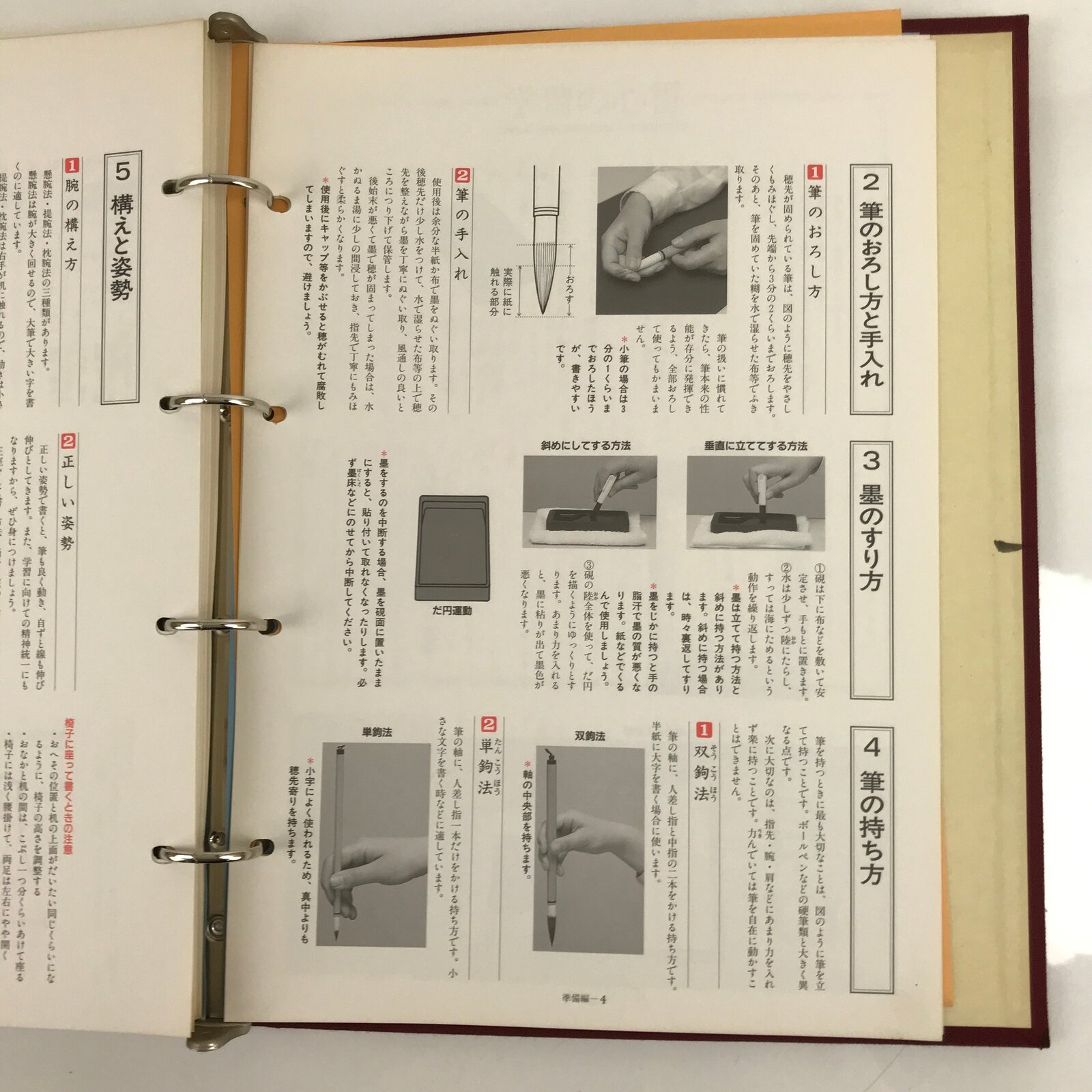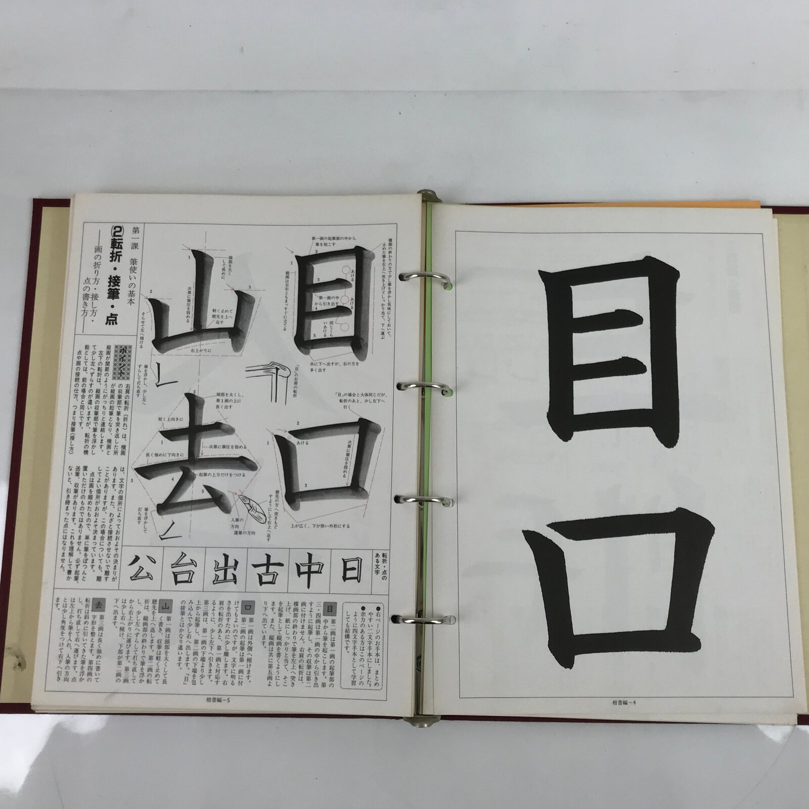 This vintage Japanese modern calligraphy course is divided into sections: getting ready, regular script (kaisho), semi-cursive or running script (gyosho), cursive script (sosho), kana (hiragana and katakana) and daily writings. This course is in a ring binder with large format pages for easy use. For each script, you have several examples with detailed explanations of applying the ink and which pressure to apply to the brush.