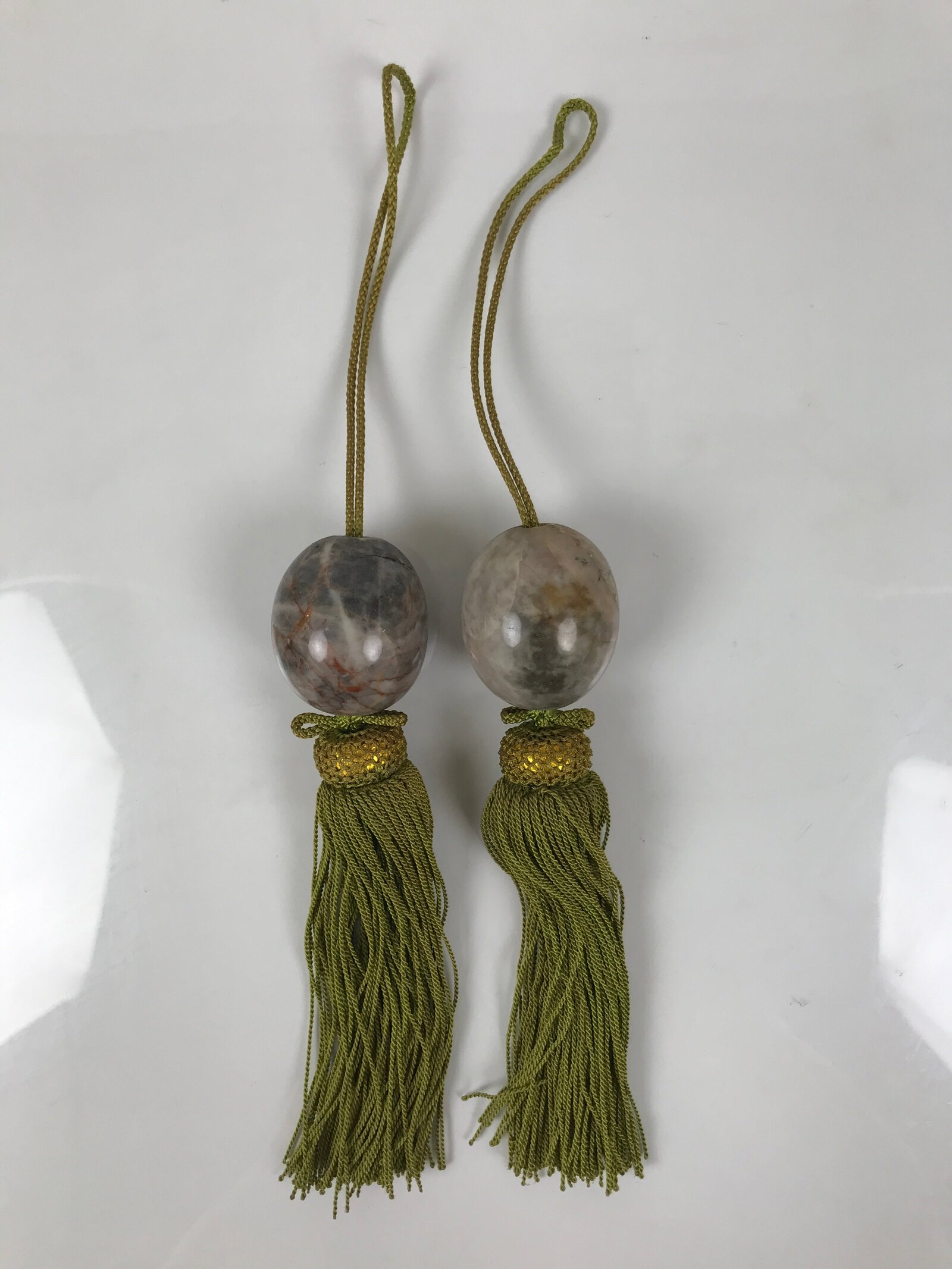 January 24, 2026Japanese Moonstone Stone Hanging Scroll Weights Vtg Fuchin Kakejiku Tassel FC371