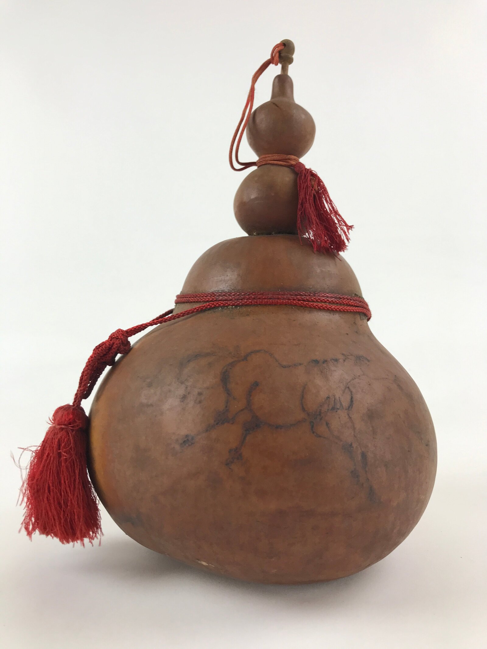 Wound with red silk tasseled cords with a wooden peg lid, this large naturally dried hyotan gourd was not only made for storing and carrying sake and seeds but as a good luck charm for display. Its delightful reddish brown color is paired with a hand-painted image of a leaping horse, likely as a representation of the Japanese saying “hyotan kara koma ga deru” which translates to “a horse comes out from a gourd”. The true meaning, however, is “things can happen in unexpected places”. The image may also be a nod to the zodiac year it was produced. Inside are dried seeds.