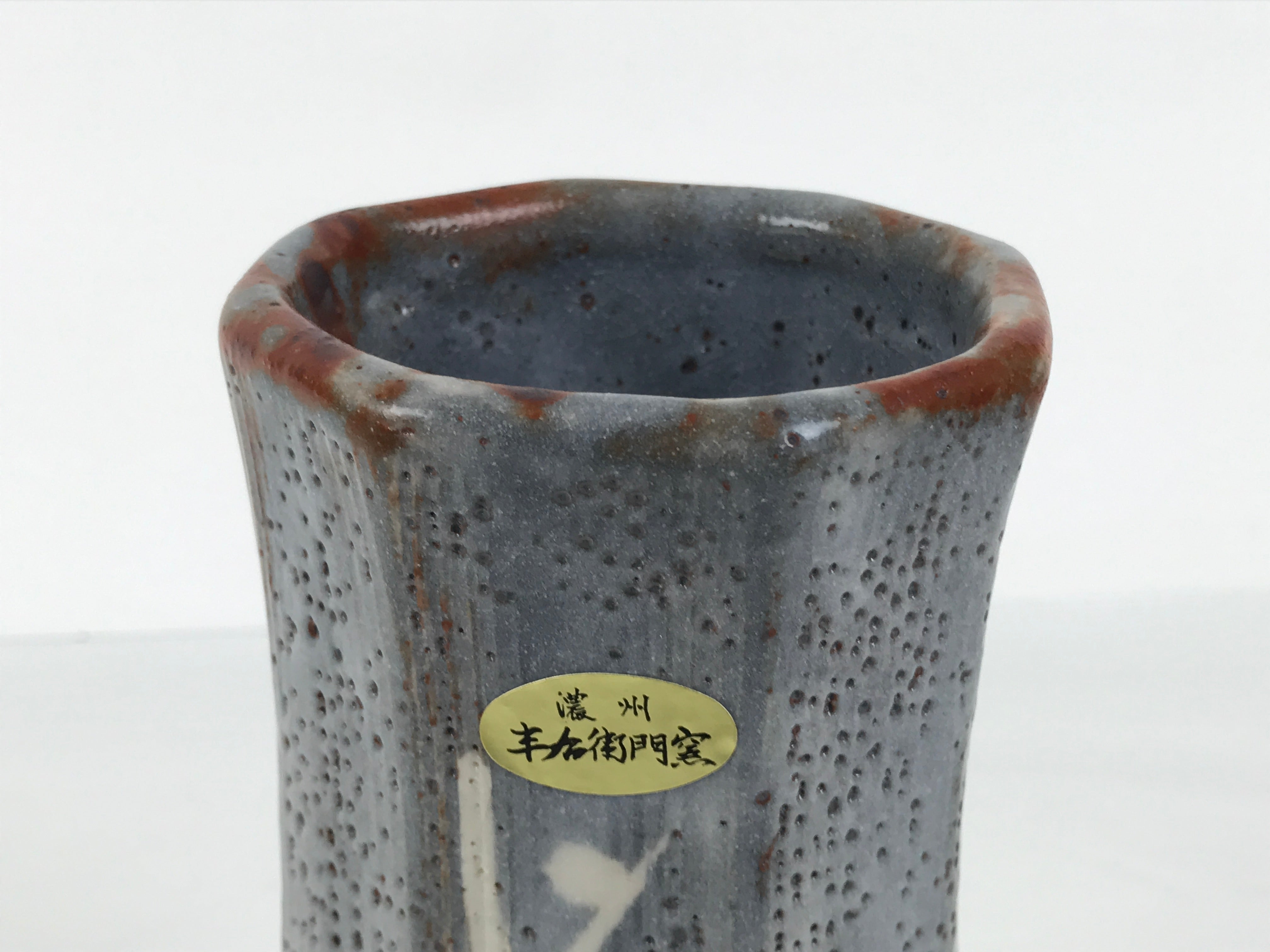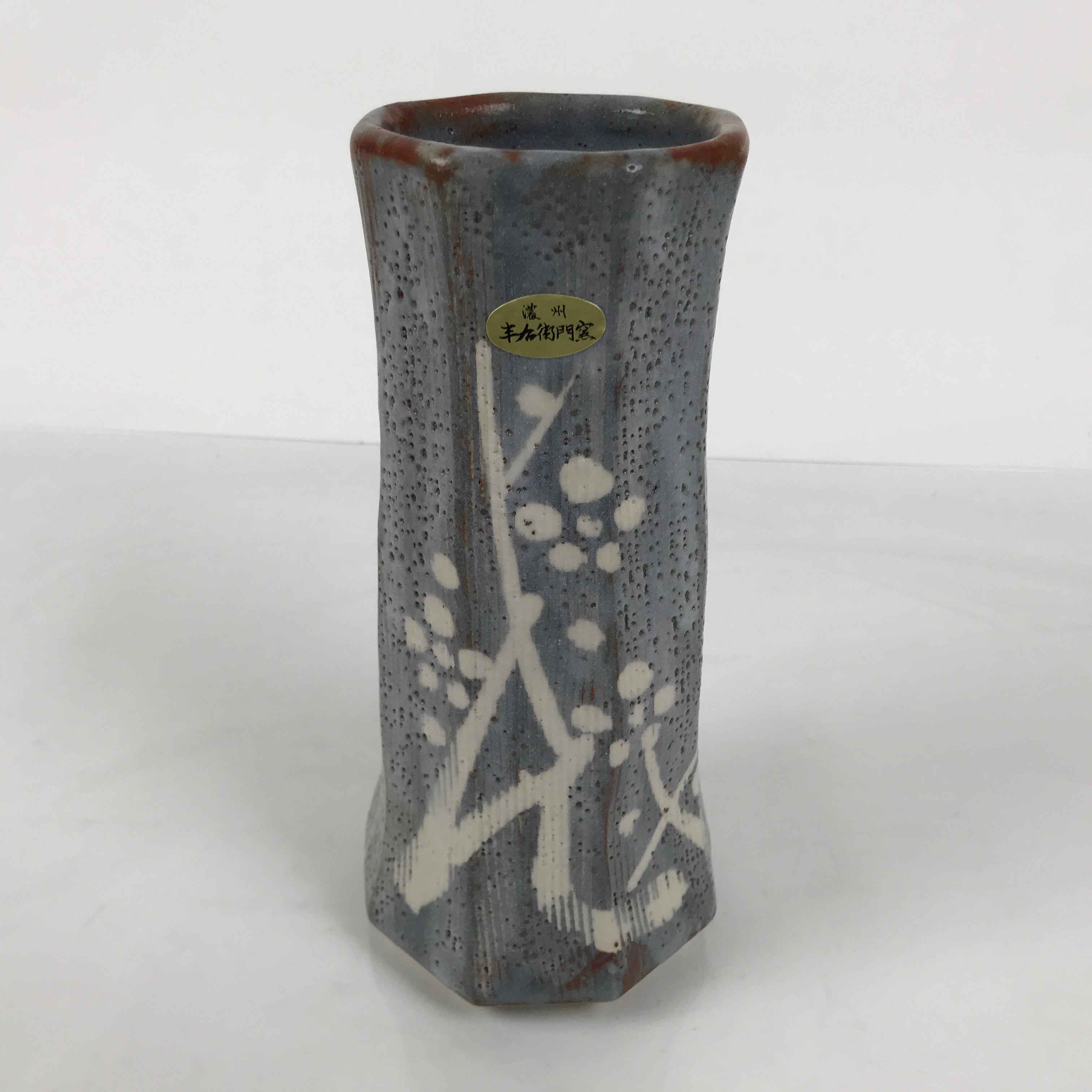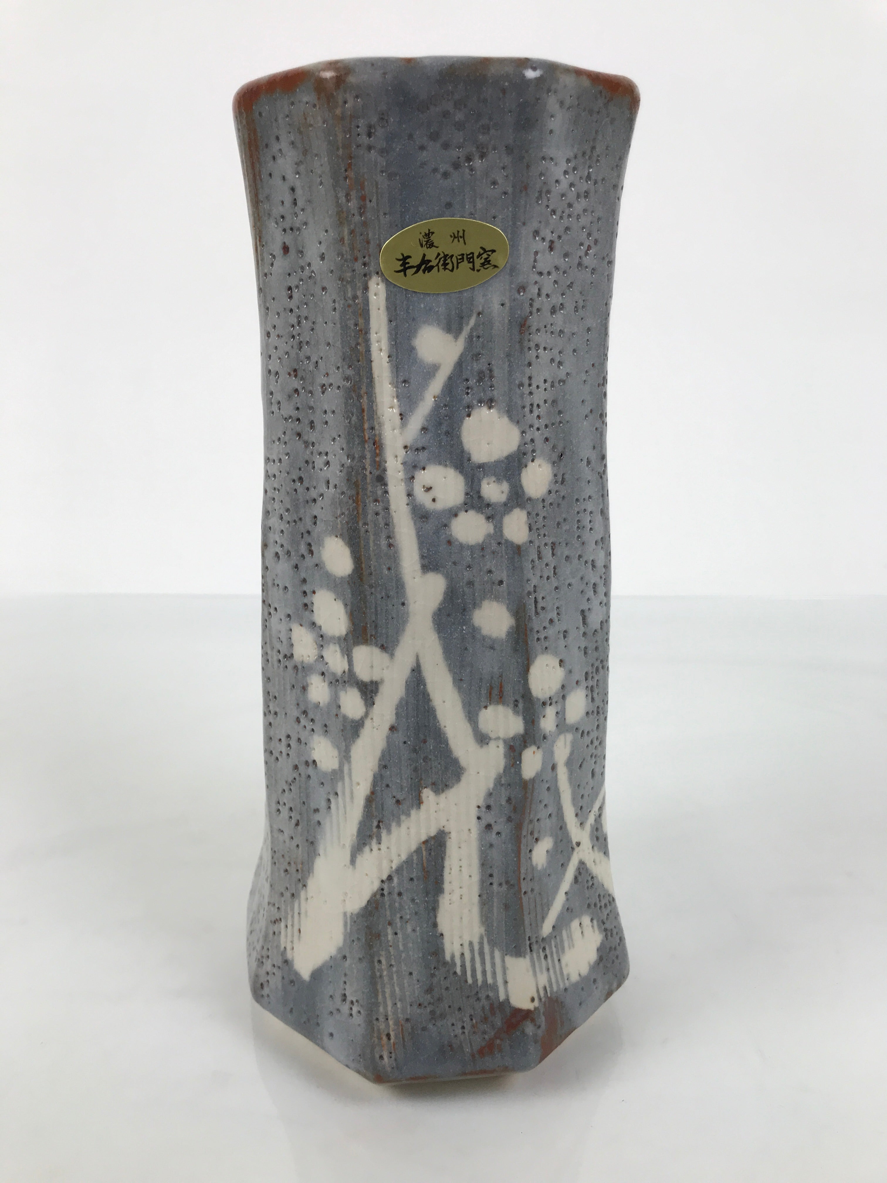 This is a vintage Japanese ceramic flower vase, also called kabin or hanaire in Japanese. This vase is in the Nezumi Shino ware style, a type of Mino ware. It is light gray, brown, and white. This vase is an octagonal cylinder with a wider bottom. The light gray color is made with two glazes: a dark brown underglaze and a white topcoat. A white tree with a blossoms design on the body is created by scraping off the dark brown underglaze before applying the white topcoat. The dark brown underglaze shows through, creating brown accents. There is a signature near the bottom. It is wrapped and cased in a wooden box. This vase can be used for Ikebana or other floral arrangements. It is a beautiful item that can be displayed as decor.