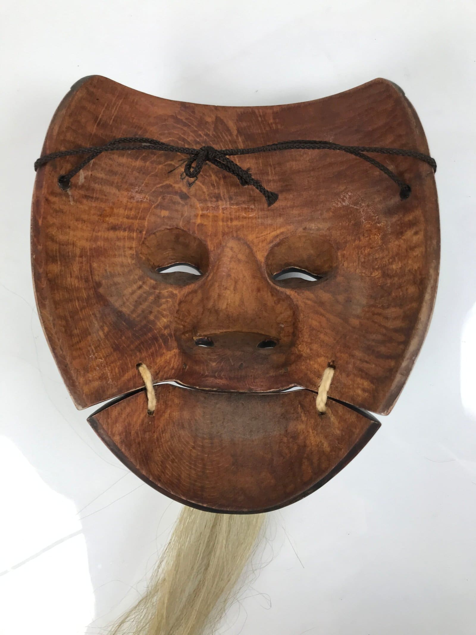 This is a vintage Japanese wood noh mask (noh-men) decoration. This character is the face of an old man (okina). This particular mask is called Kokushiki-jo. It has a black face and a movable jaw, used for a specific Noh play called Sanba-so. This mask comes with a fan-shaped wooden board where the mask can be placed for display. There are inscriptions on the back.