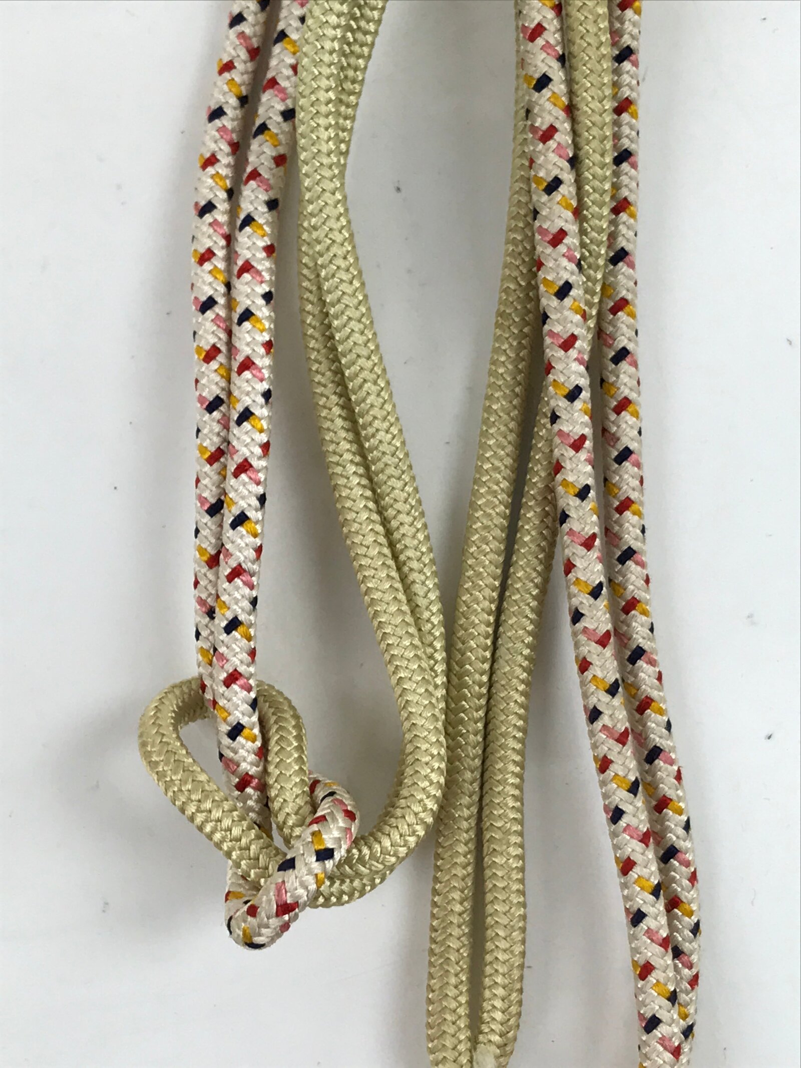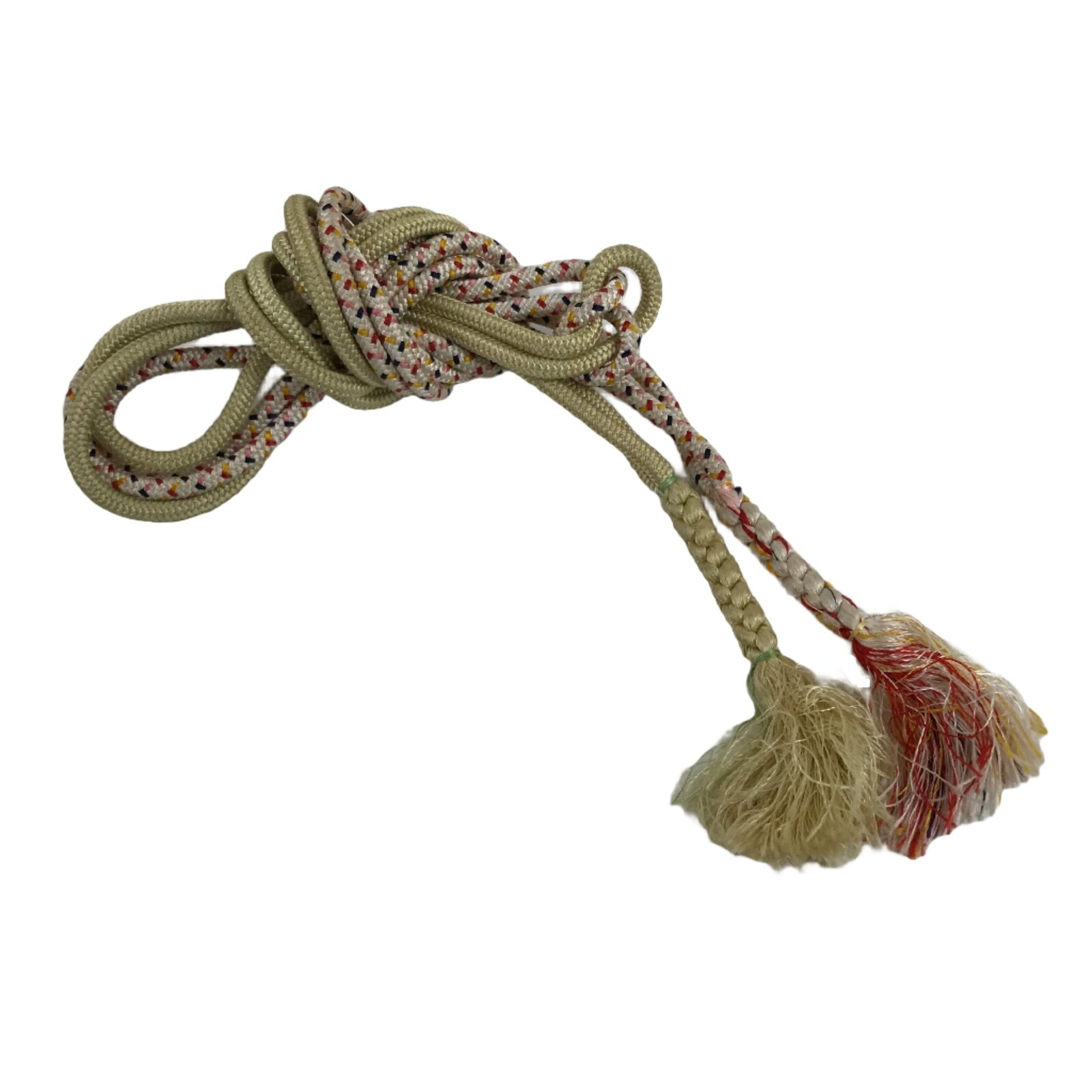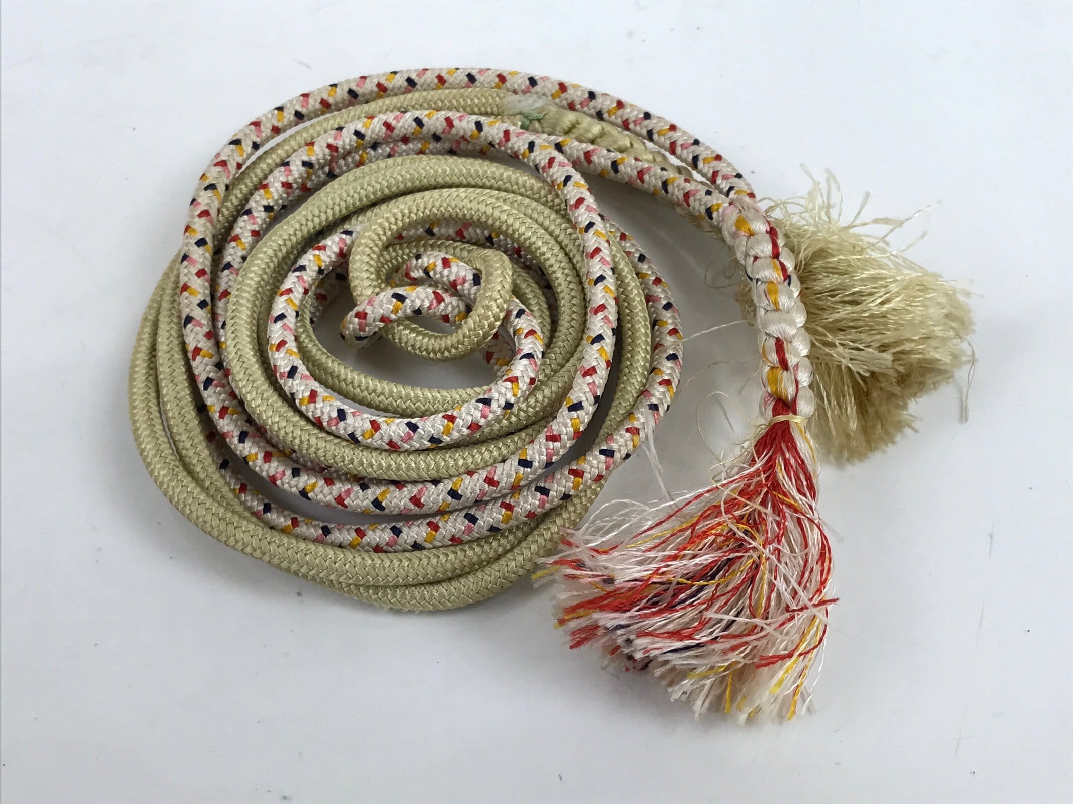 This is a Japanese vintage obijime. A combination of simple beige and a multi-colored pattern, this narrow and round (marugumi) style traditionally braided kumihimo cord is flexible and easy to tie. It is made up on two separate pieces that knot together at the middle. Each piece has a large braid accent on the bottom with a tassel.