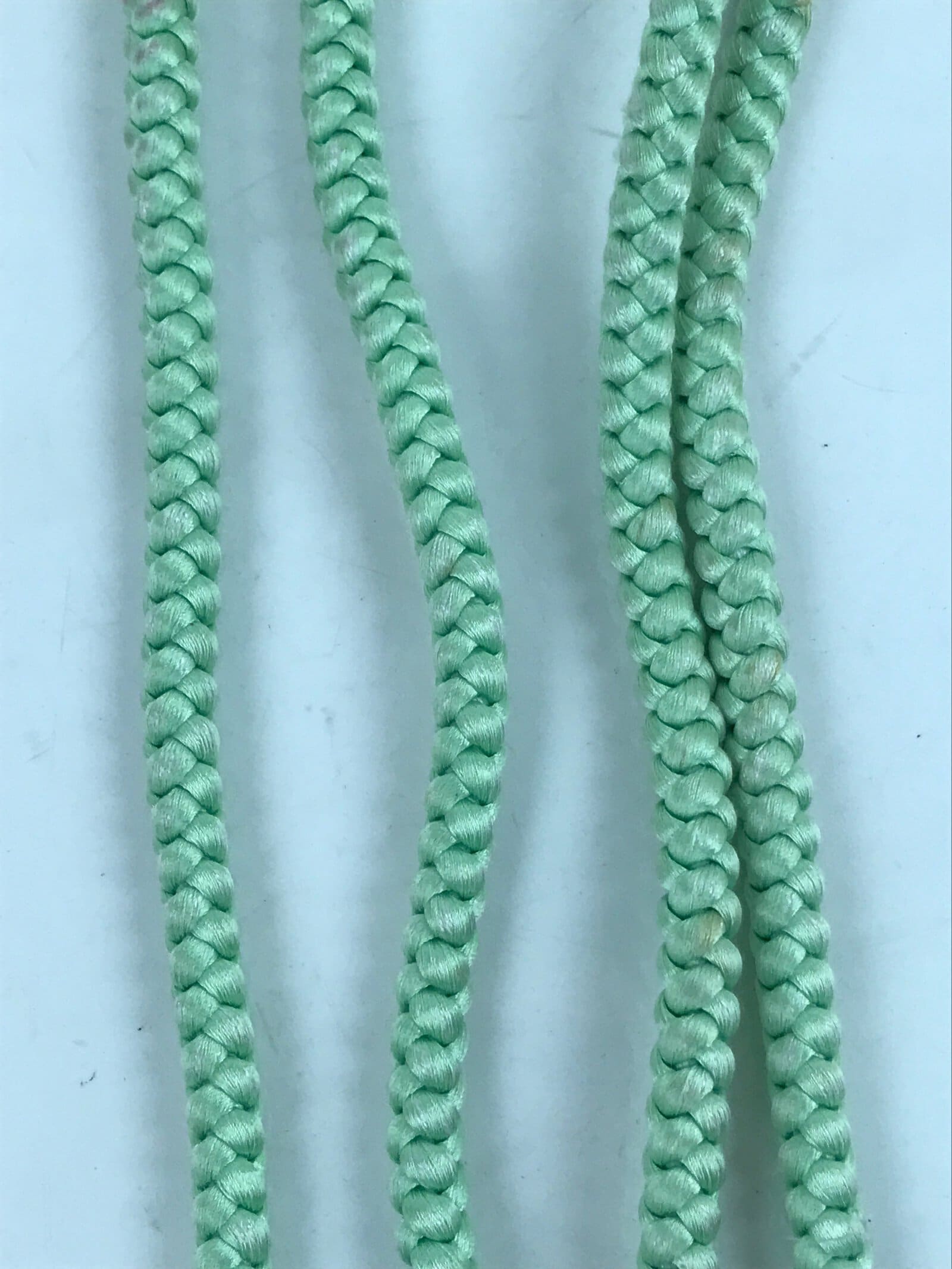 This is a Japanese vintage obijime. A solid mint blue pattern, this narrow and round (marugumi) style traditionally braided kumihimo cord is flexible and easy to tie. It has a smooth weave texture with no added designs.