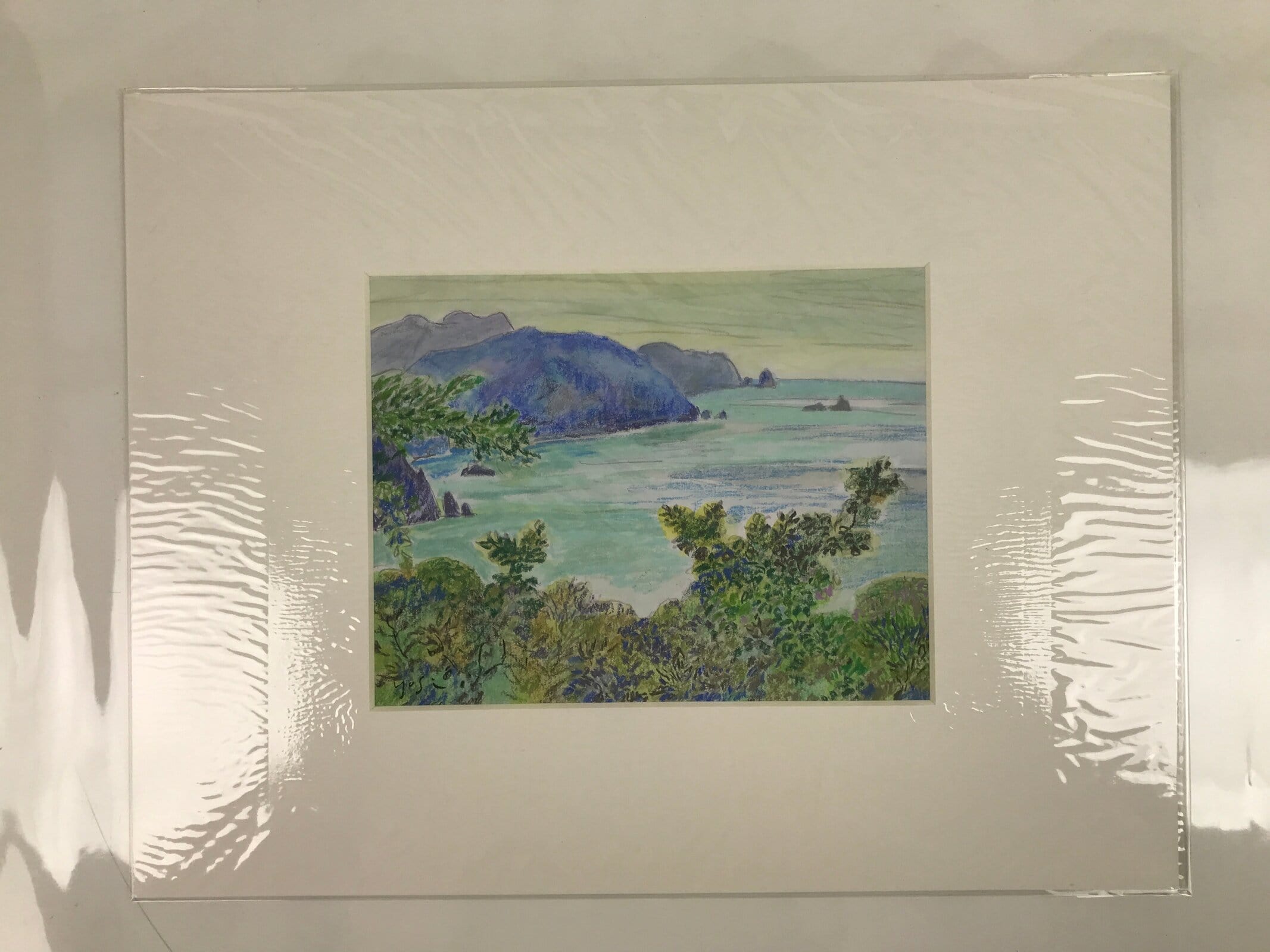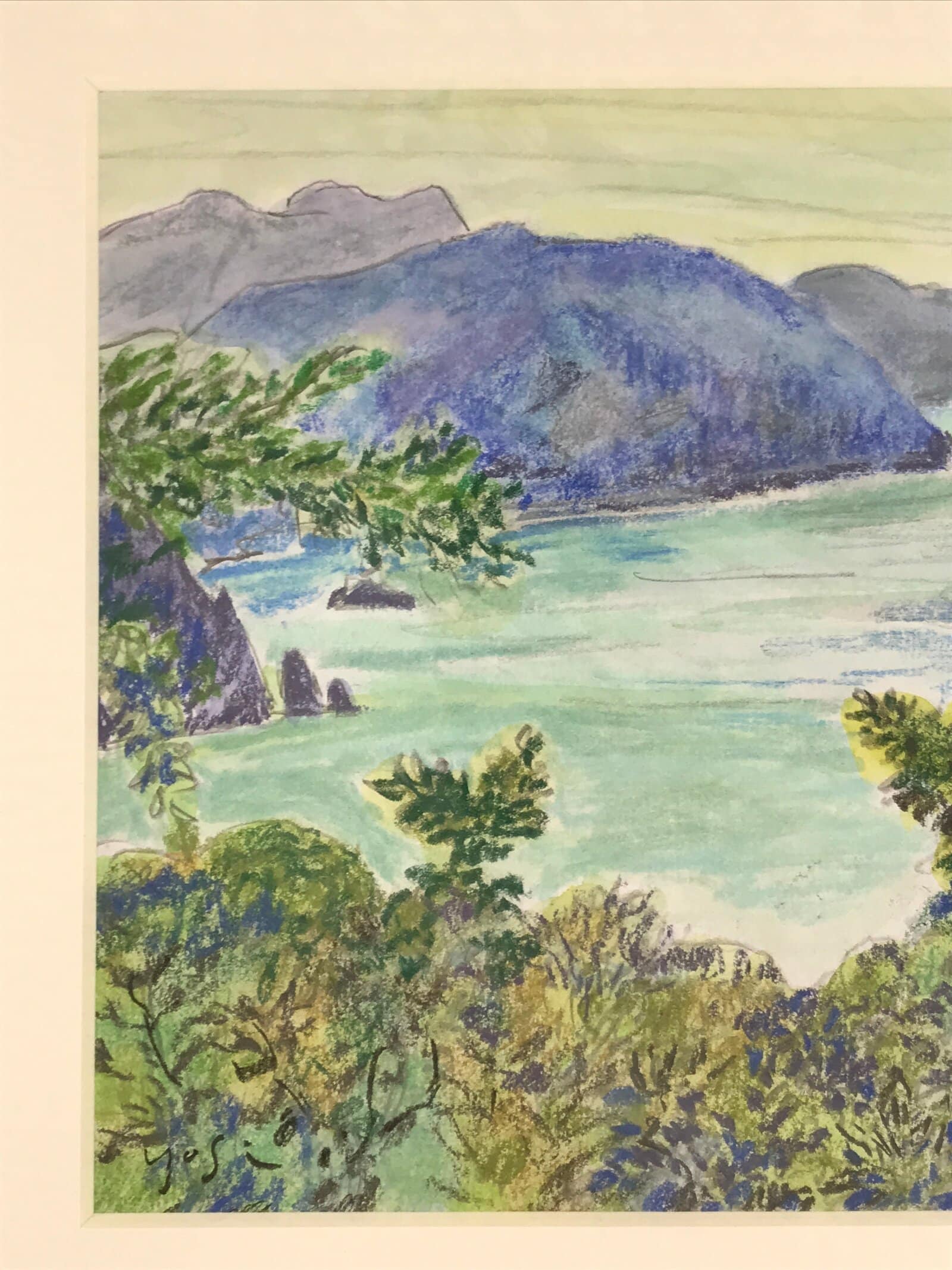 This original pastel drawing on cardstock paper features the mountainous Japanese coastline with lush green trees in the foreground. Pastel is a gorgeous, often overlooked, art medium that blends colors together beautifully and this piece is no exception. It is adhered to a plain white matboard, ready for easy framing and is stored in a plastic sleeve. This work is signed by the Japanese artist Yoshihiro Hagino.