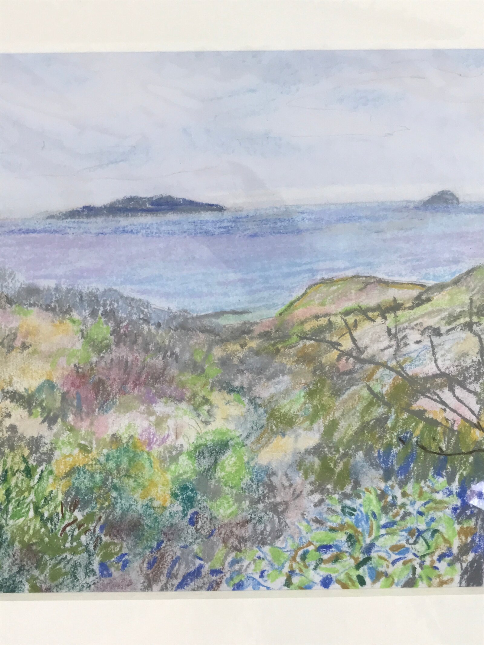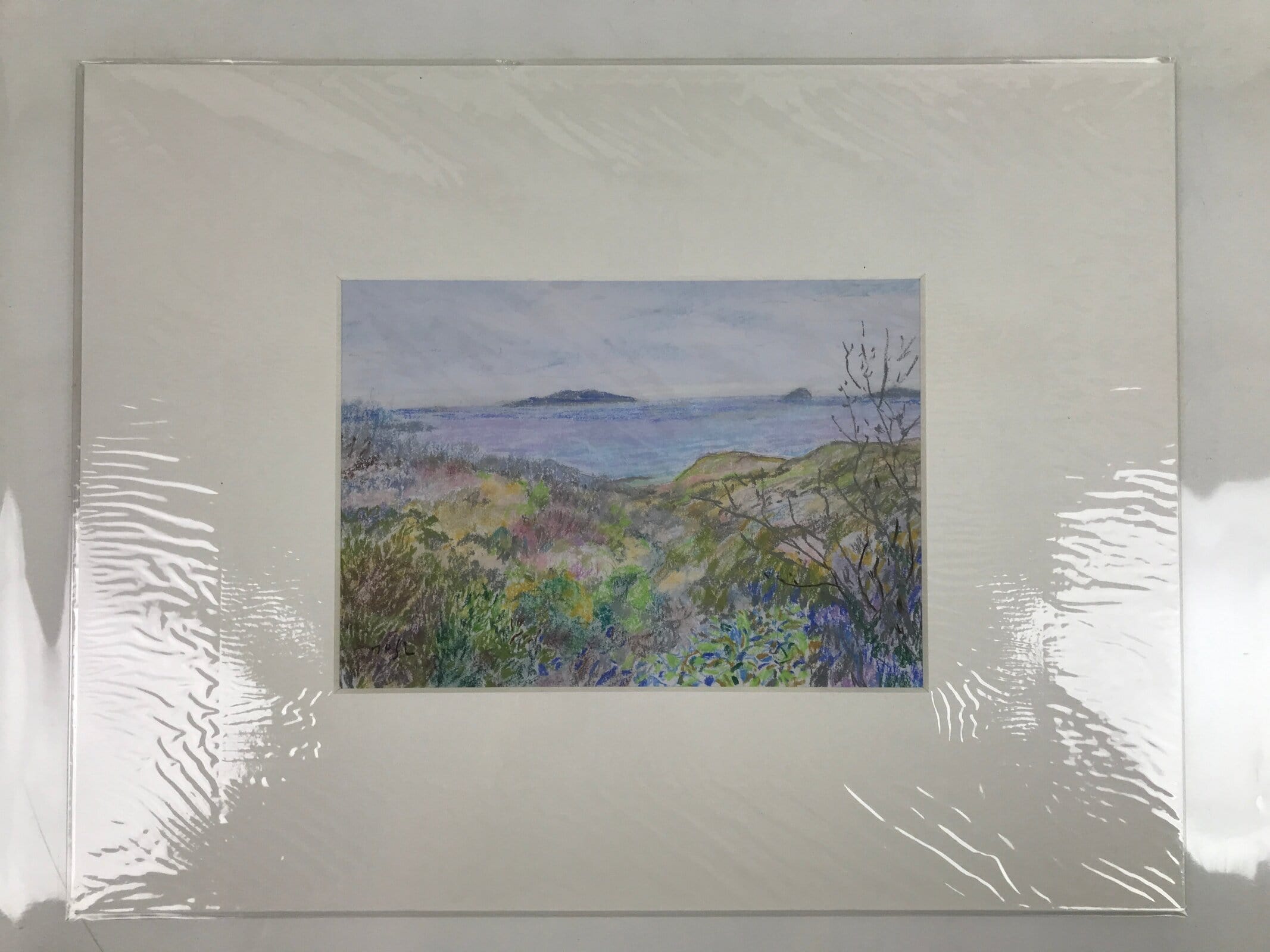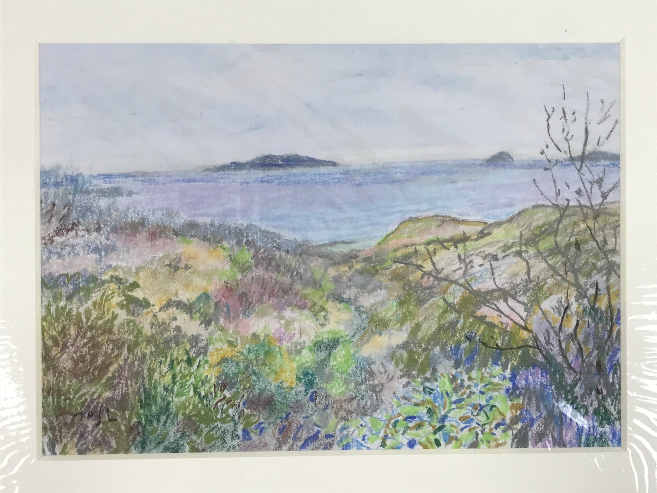 This original pastel drawing on cardstock paper features a colorful view of the sea from a mountain vantage point. This was likely painted in late autumn. Pastel is a gorgeous, often overlooked, art medium that blends colors together beautifully and this piece is no exception. It is adhered to a plain white matboard, ready for easy framing and is stored in a plastic sleeve. This work is signed by the Japanese artist Yoshihiro Hagino.