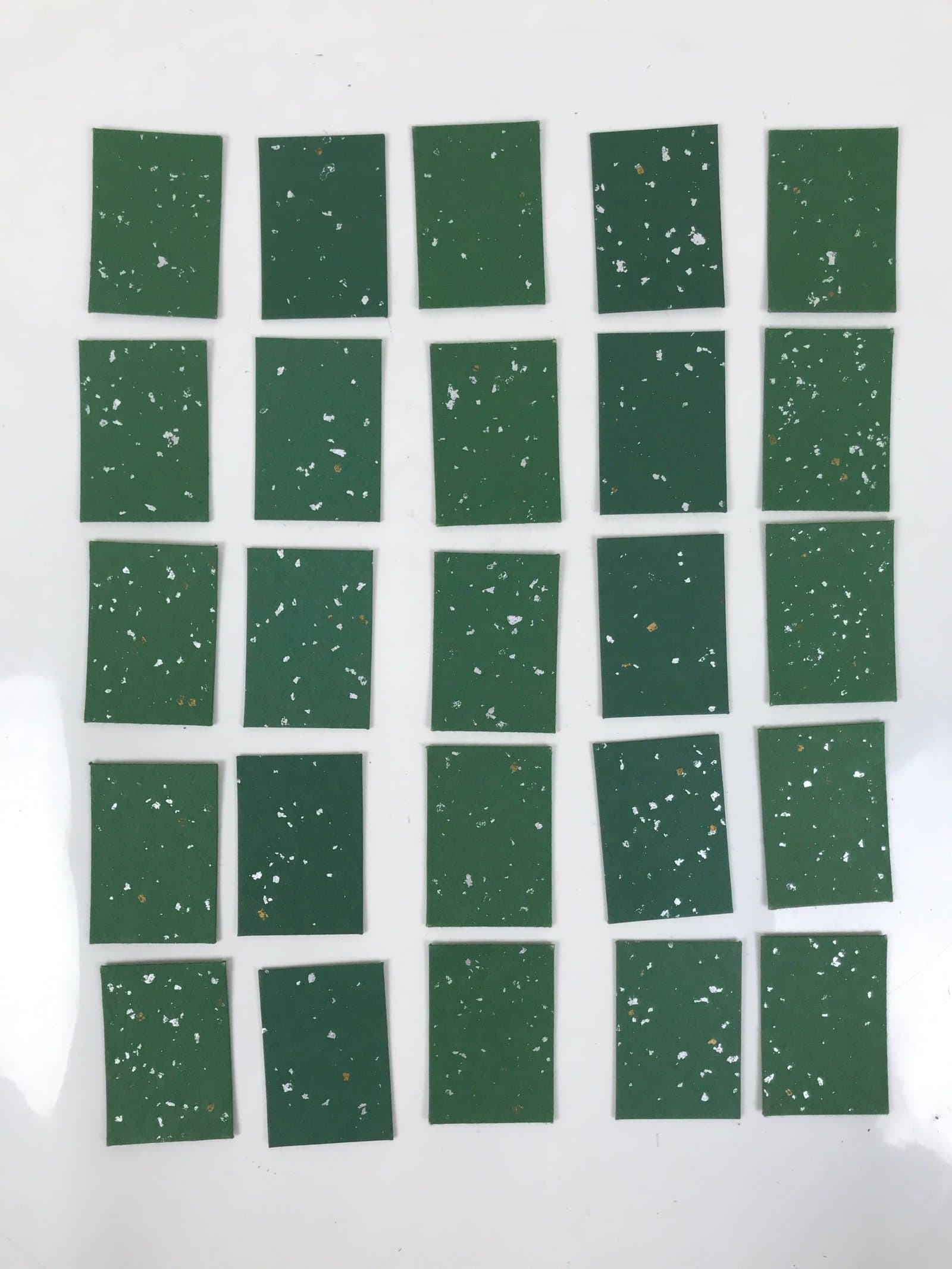 This is a vintage Japanese karuta card game called Hyakunin Isshu. The cards are made out of strong cardstock paper and are green on the backs with silver and gold flecks.