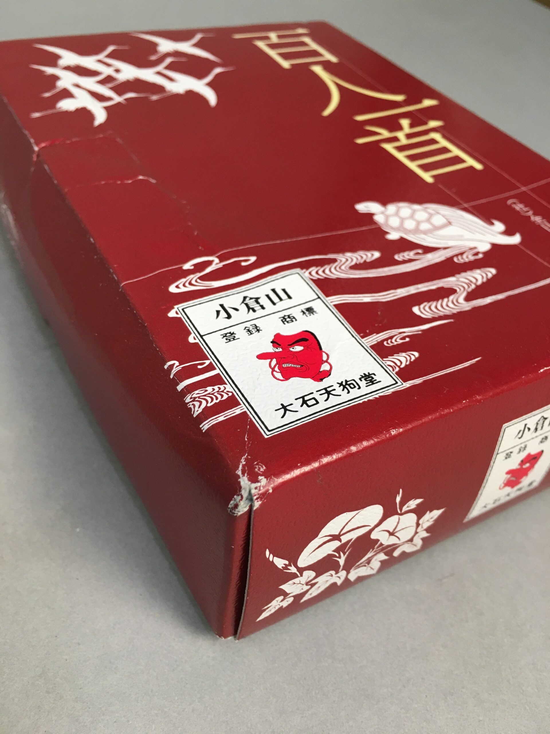 - Kanji on the box: Hyakunin Isshu, Ogura-Yama trademark, Oishi-Tengudo