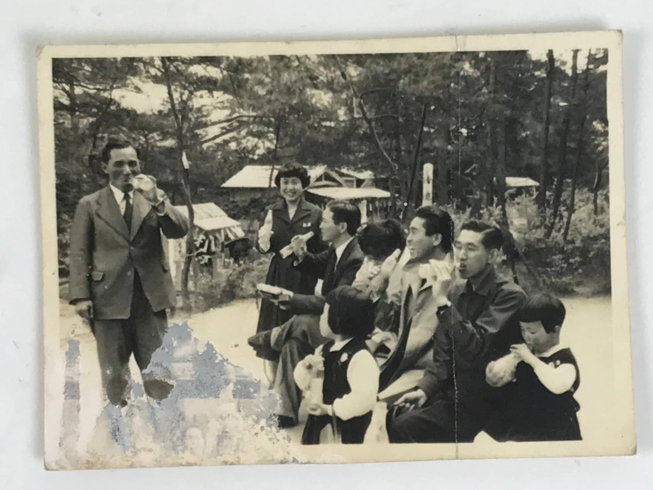 This is a Japanese vintage black and white photograph of a family enjoying cool drinks at a park or on a hiking trail. They all wear suits and casual dress clothes. The two little girls wear matching outfits.