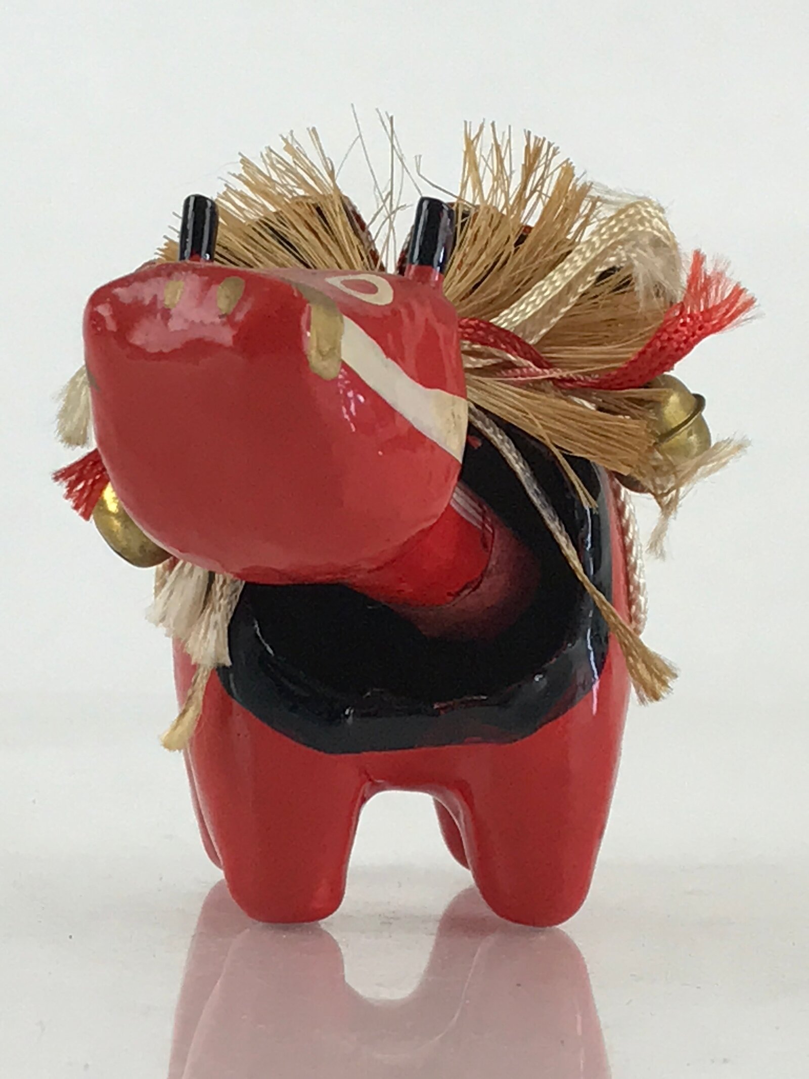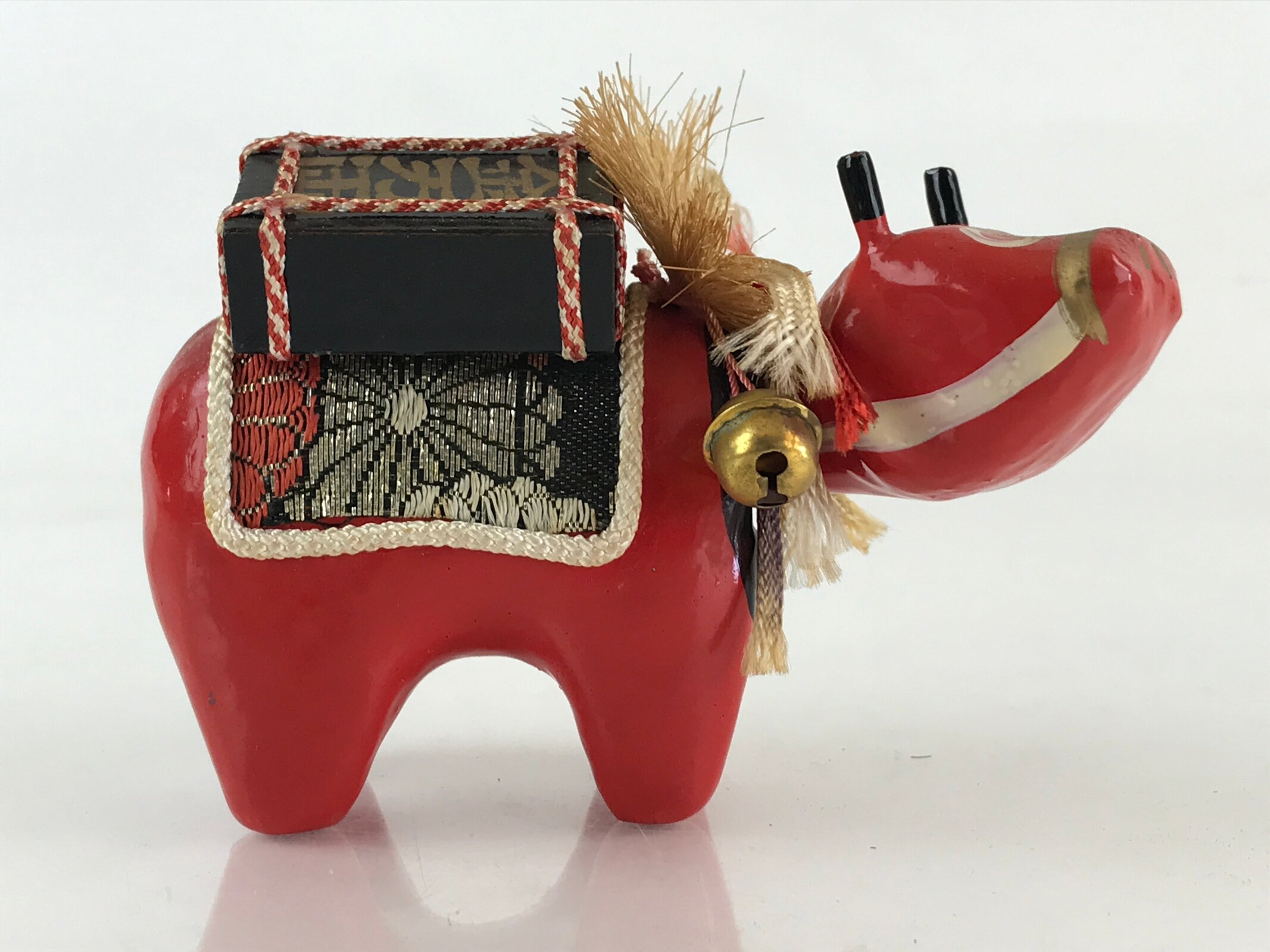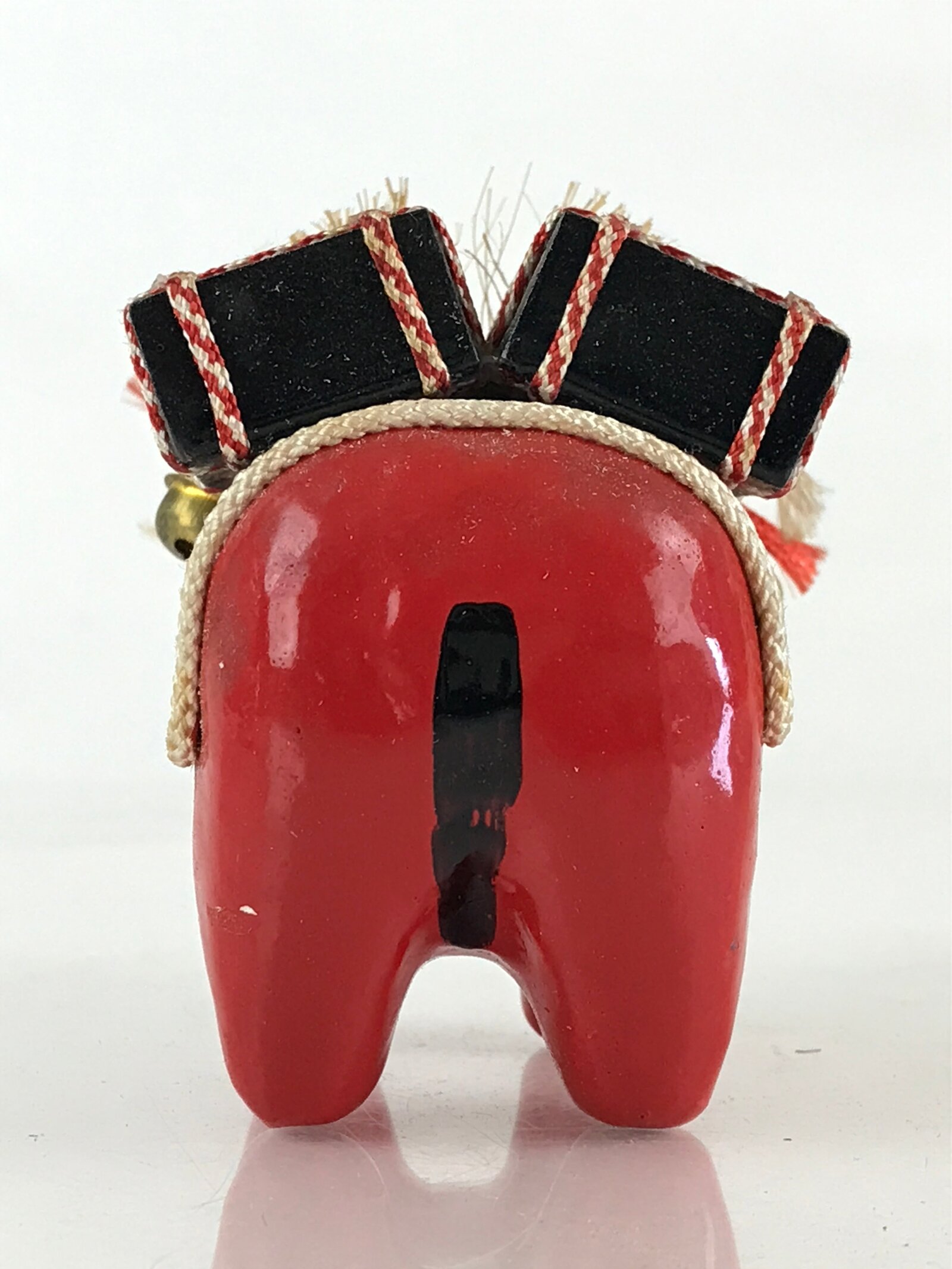 This is a vintage Japanese traditional craft Akabeko. Akabeko is a papier-mâché that resembles a red cow. It is a local toy of the Aizu region (Fukushima Prefecture) and has been used by children to ward off evil and illness. The red color of the body is an amulet, and the black spots represent smallpox.