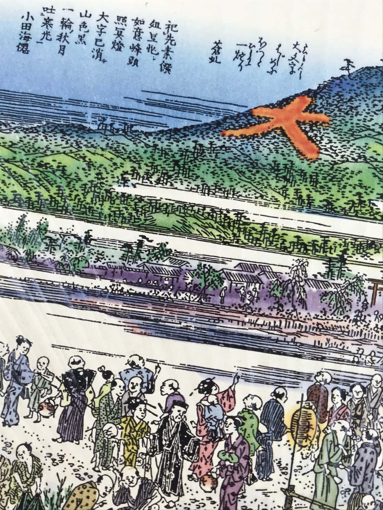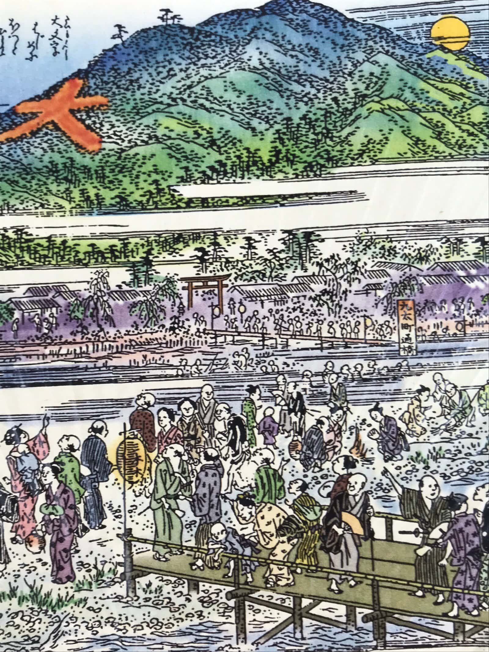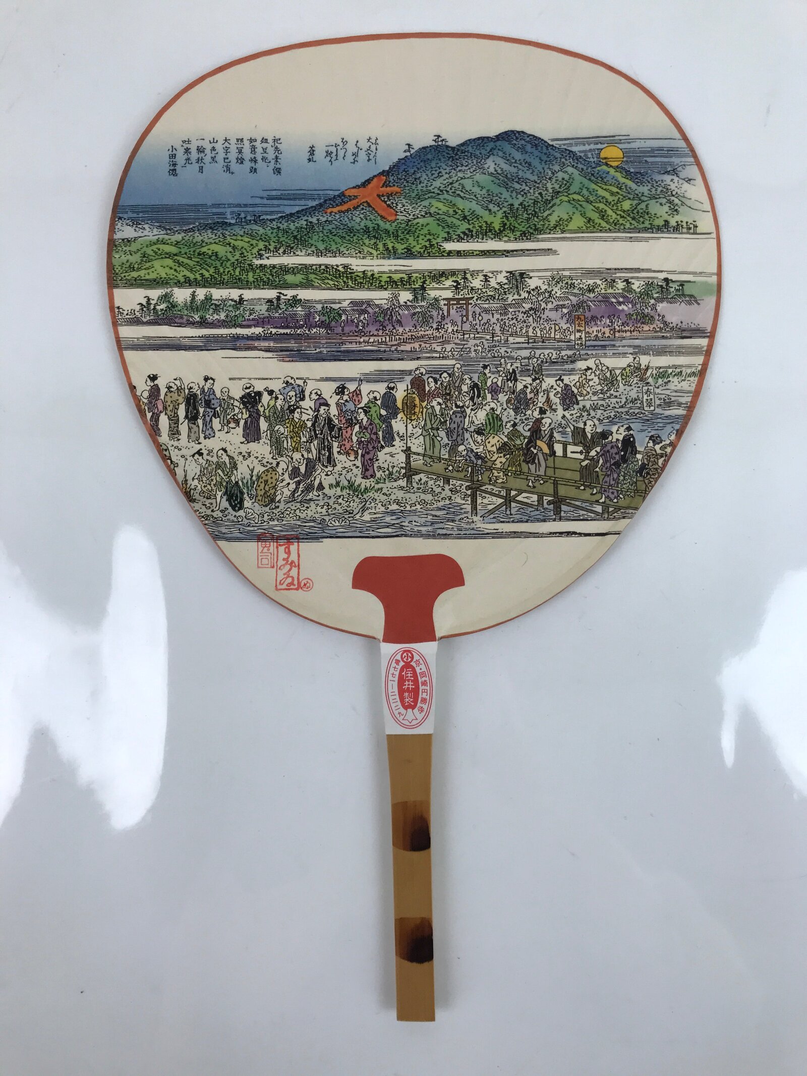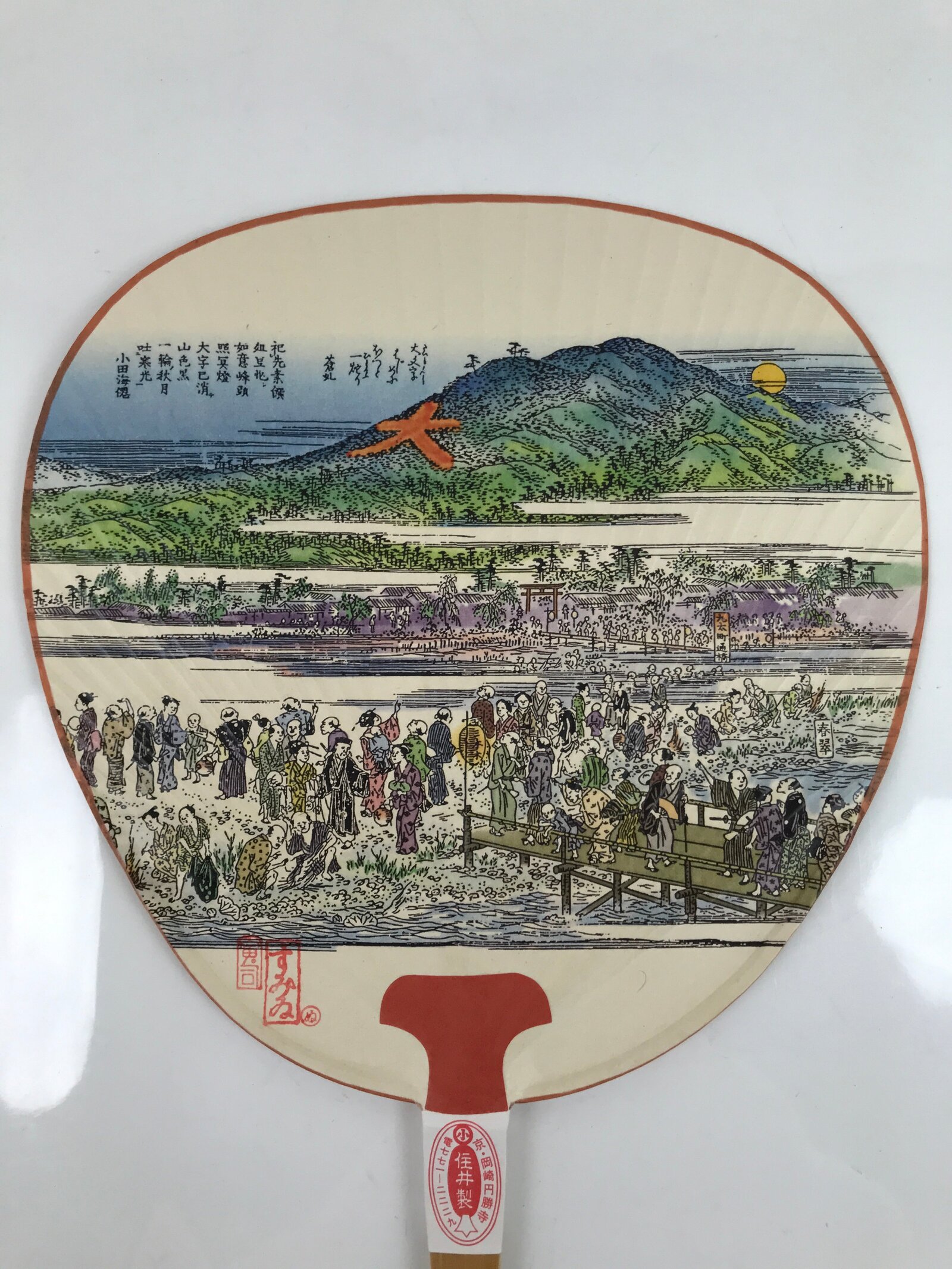 This is a Japanese paper fan or Uchiwa. Uchiwa is a traditional fan tool typically made of wood or bamboo and paper in a flat paddle-like shape. This particular fan is called “fukakusa”, a unique style of fan characterized by its tall and narrow shape. It features a scene from Kyoto’s famous mountain burning festival called Gozan no Okuribi which takes place at the end of the obon holiday on August 16th. The large “dai” kanji is the most viewed part of the festival and burns for 30-40 minutes. The image on the fan is ukiyoe-style. It comes with a short pamphlet detailing the events of this ceremony.