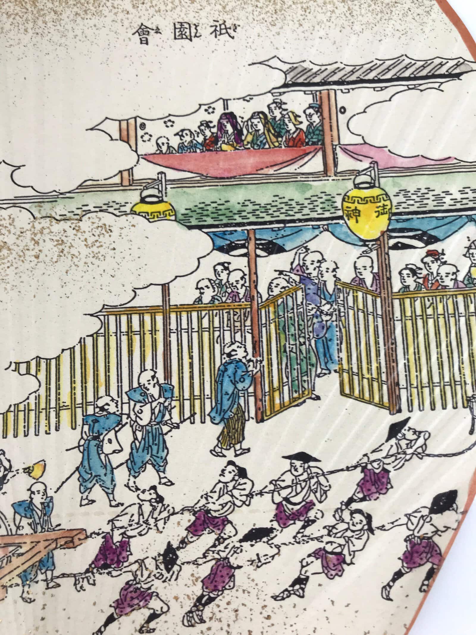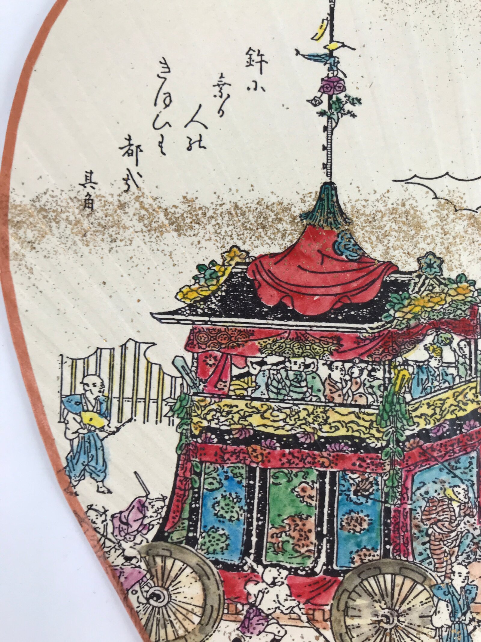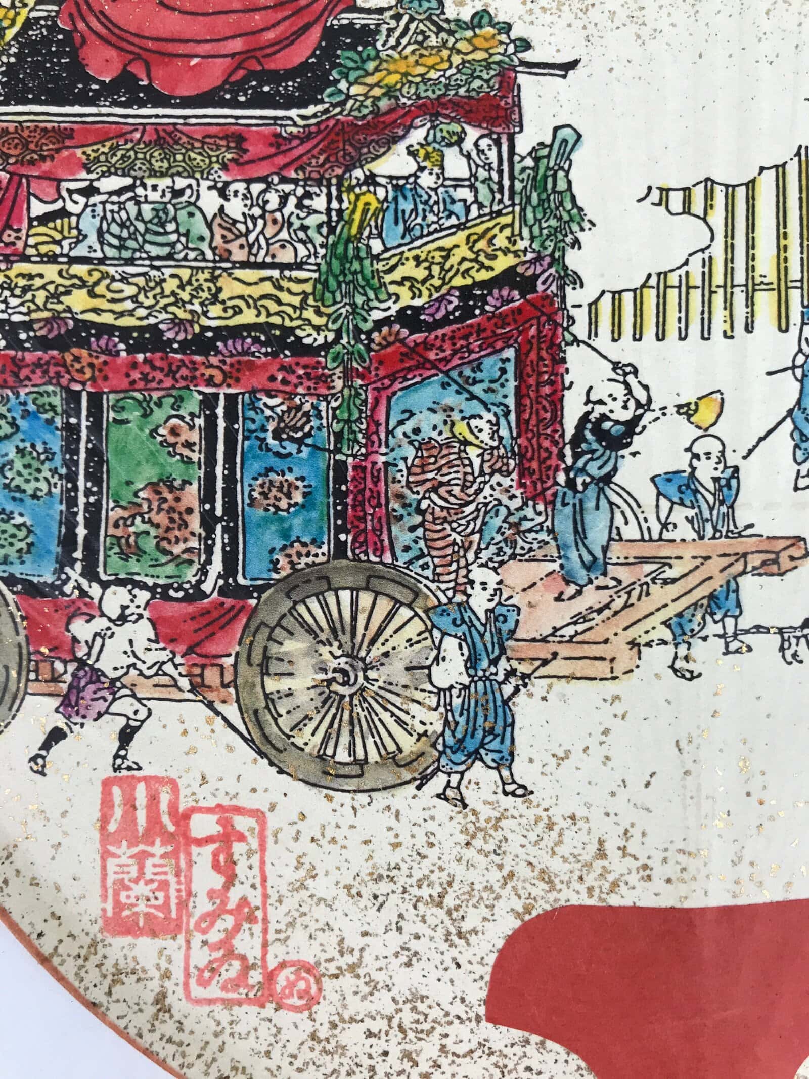 This is a Japanese paper fan or Uchiwa. Uchiwa is a traditional fan tool typically made of wood or bamboo and paper in a flat paddle-like shape. This particular fan is called “fukakusa”, a unique style of fan characterized by its tall and narrow shape. It features a scene from Kyoto’s famous Gion Festival (matsuri) of participants pulling along a grandly-decorated cart called “dashi”. There are gold specks throughout for texture and shine. It comes with the original box and pamphlets detailing the Gion Festival as well as information about the makers of the fan (Komaruya) who have been crafting these beautiful fans since the Edo period.
