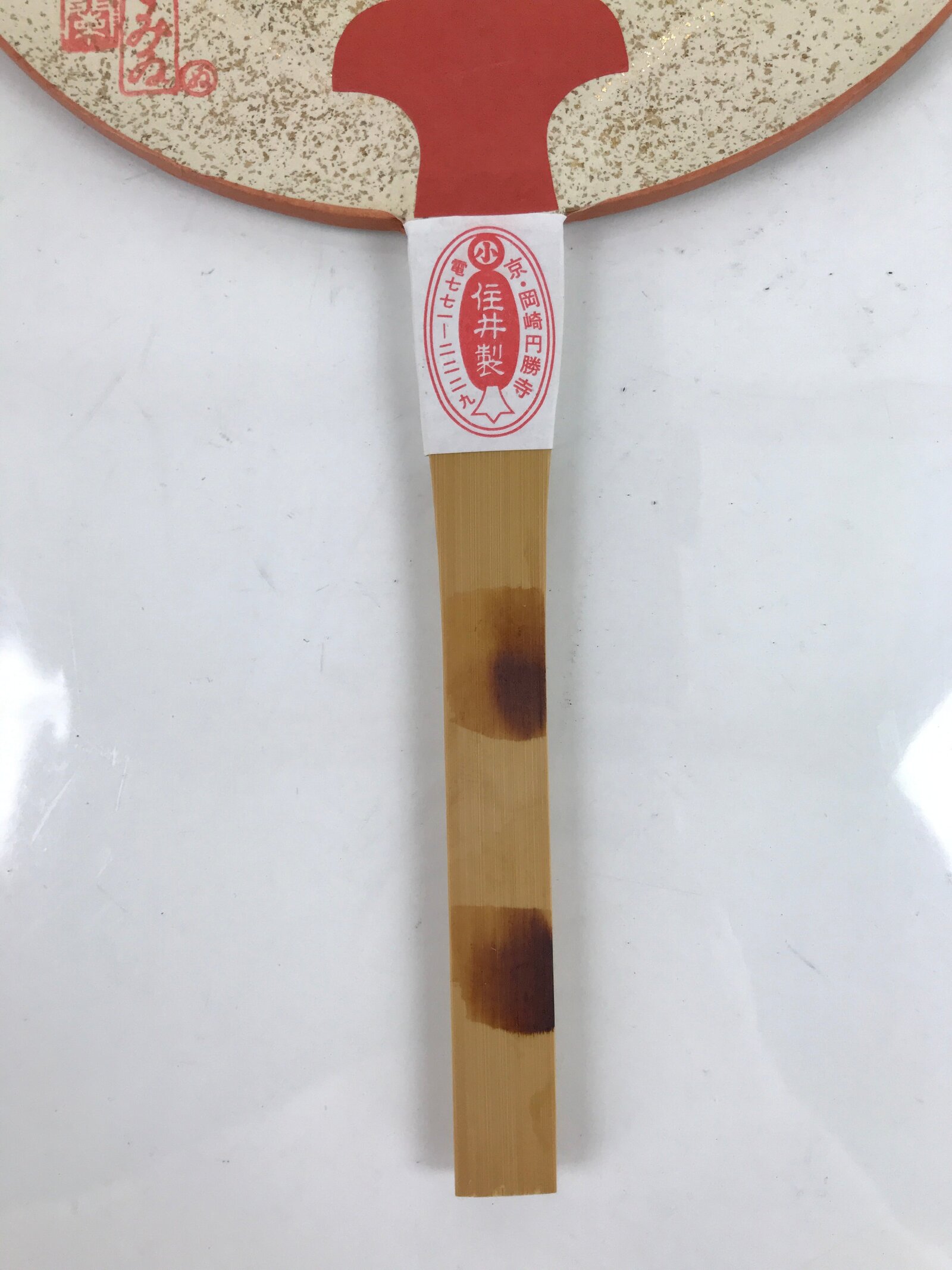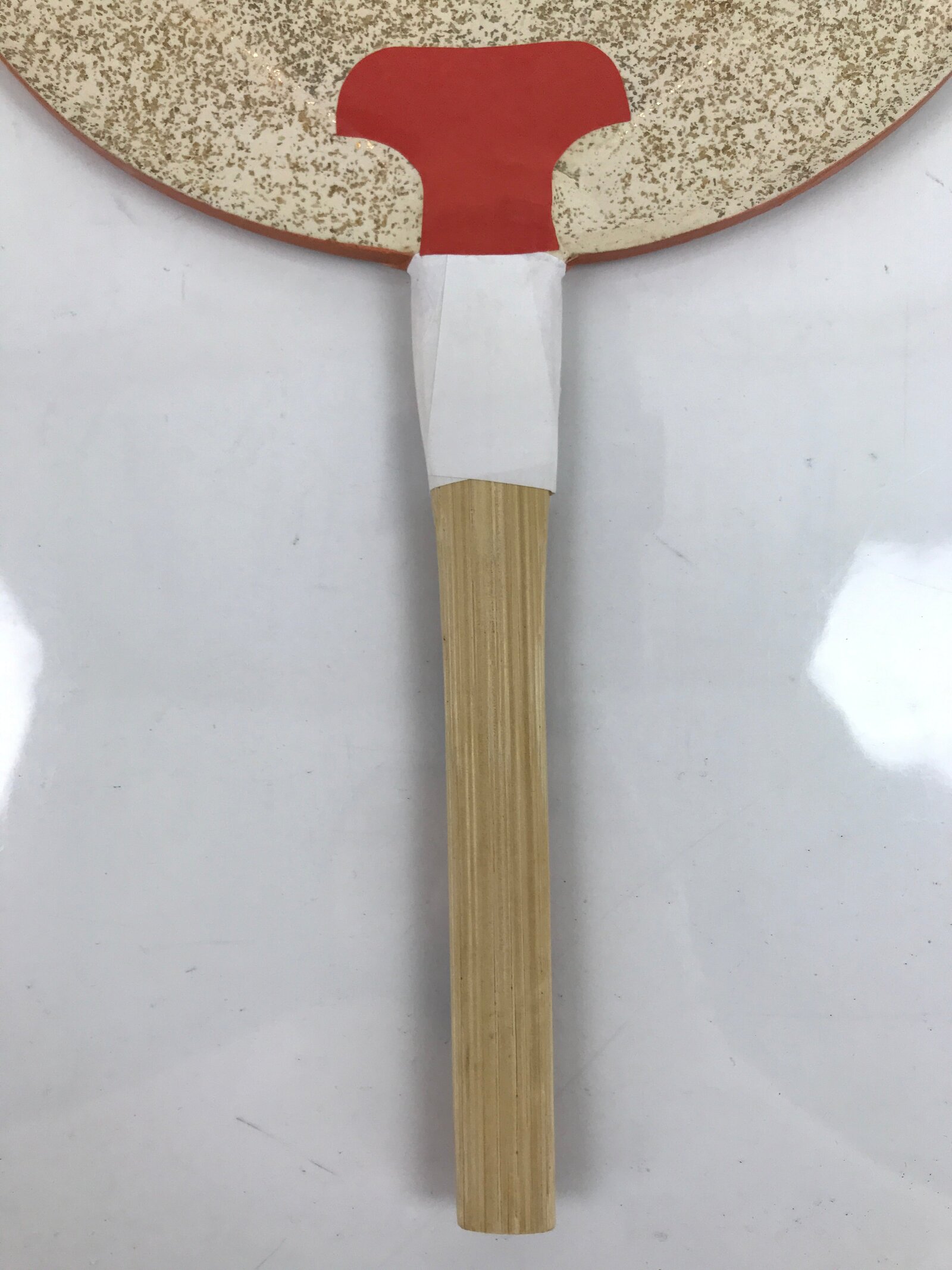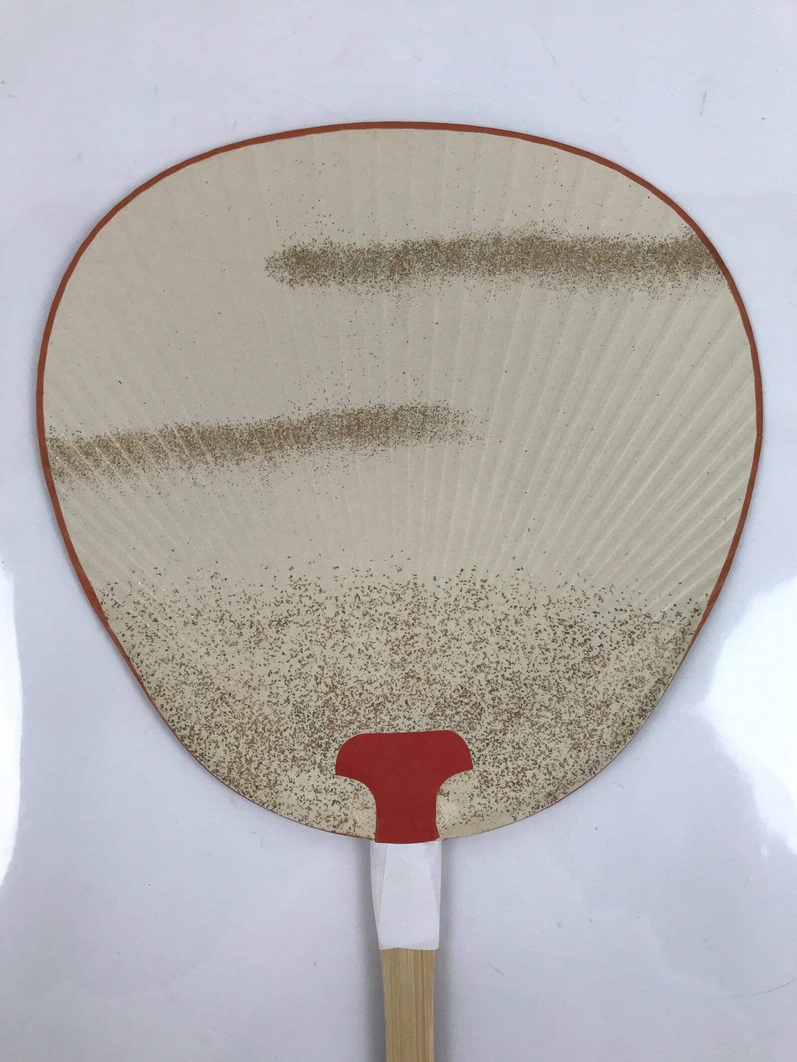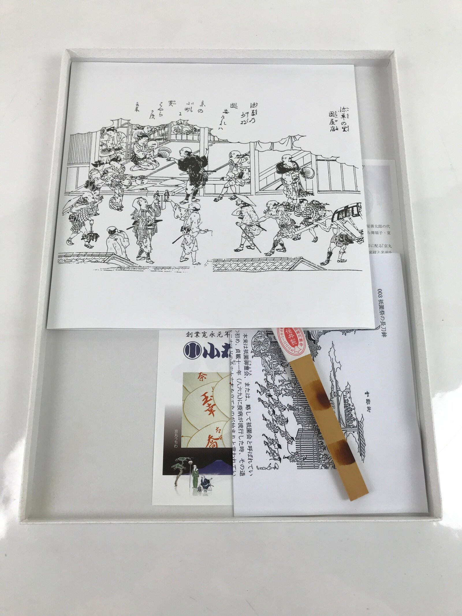 This is a Japanese paper fan or Uchiwa. Uchiwa is a traditional fan tool typically made of wood or bamboo and paper in a flat paddle-like shape. This particular fan is called “fukakusa”, a unique style of fan characterized by its tall and narrow shape. It features a scene from Kyoto’s famous Gion Festival (matsuri) of participants pulling along a grandly-decorated cart called “dashi”. There are gold specks throughout for texture and shine. It comes with the original box and pamphlets detailing the Gion Festival as well as information about the makers of the fan (Komaruya) who have been crafting these beautiful fans since the Edo period.