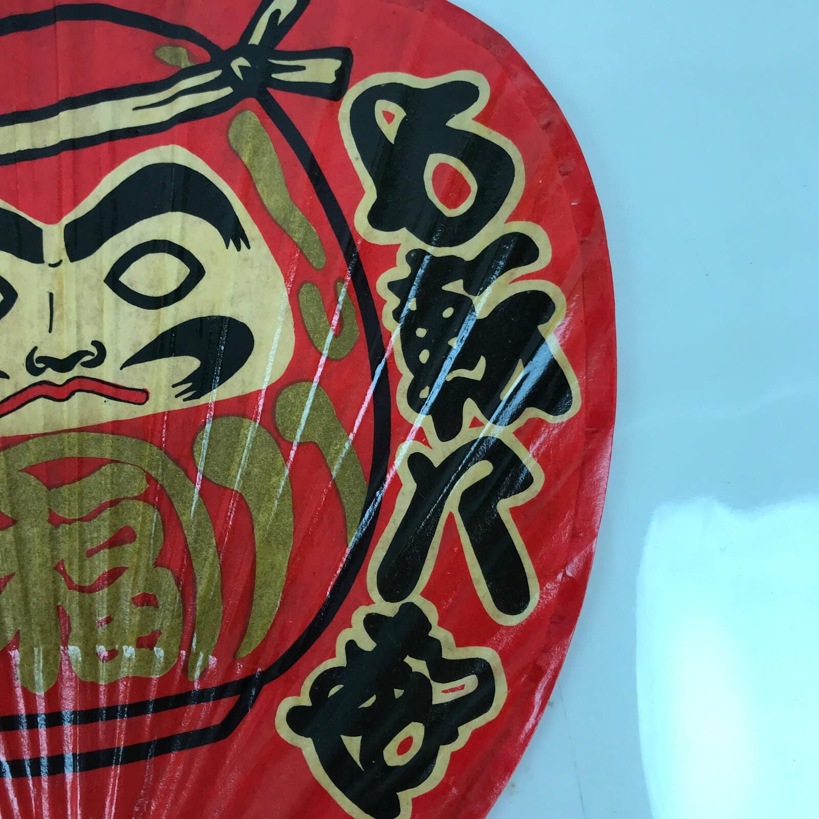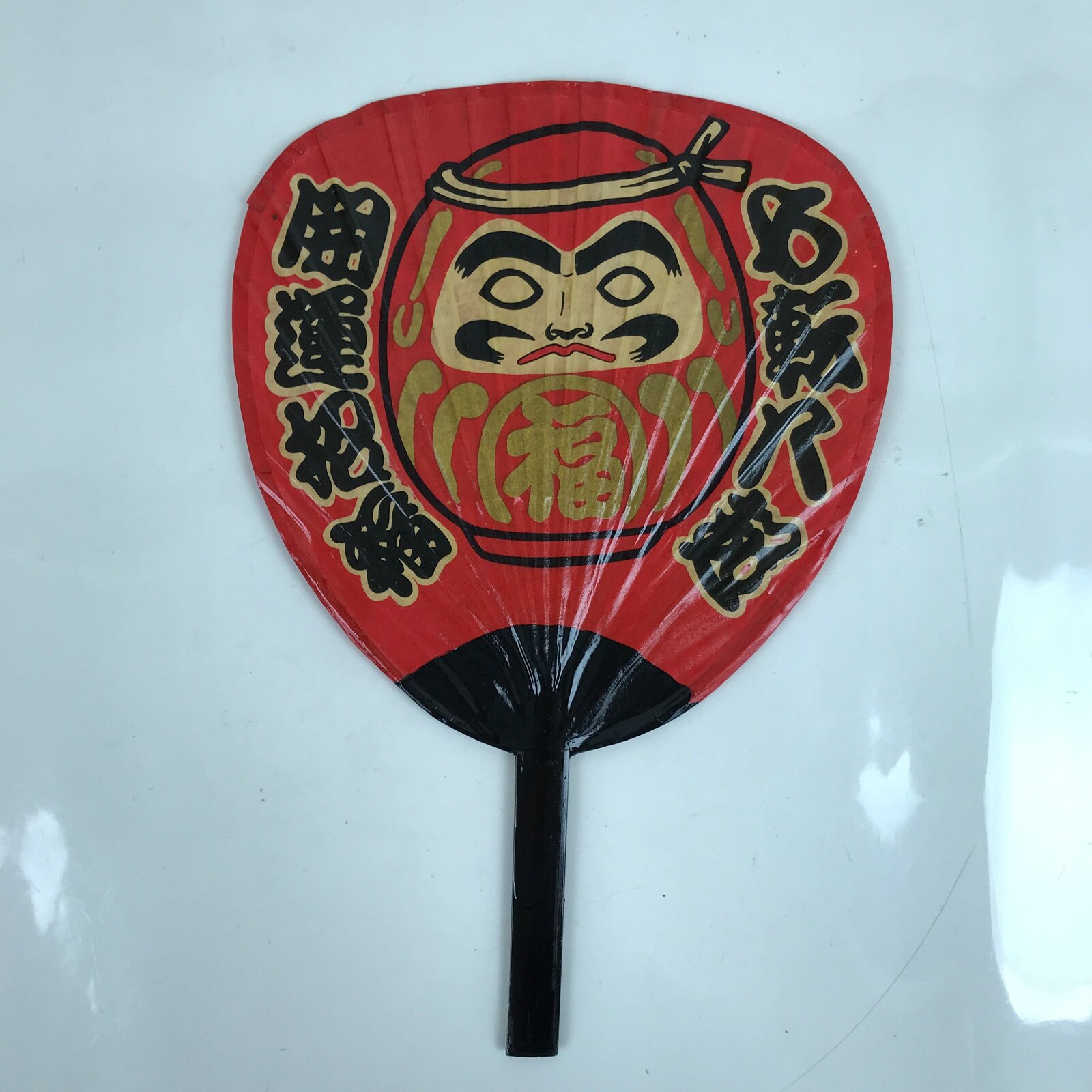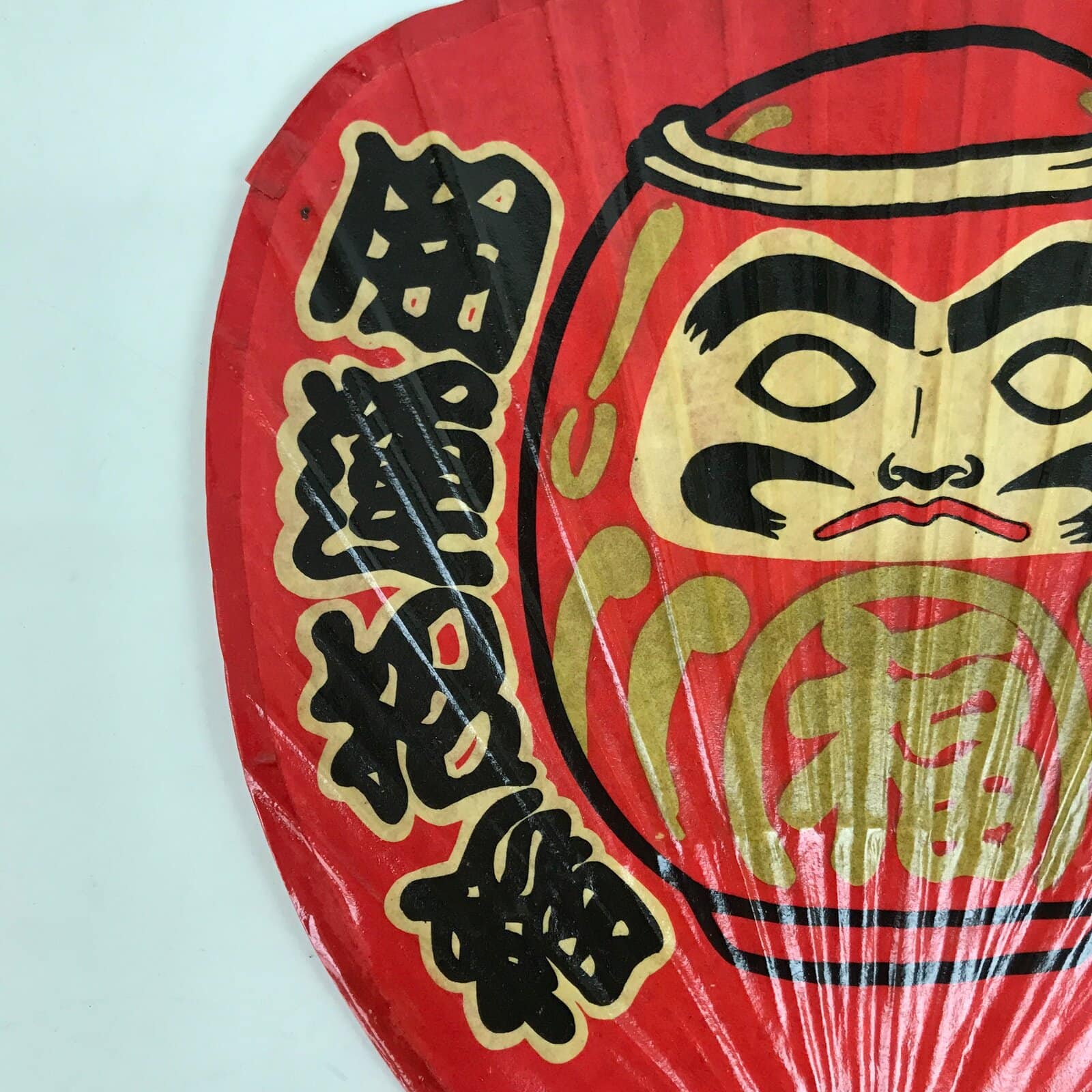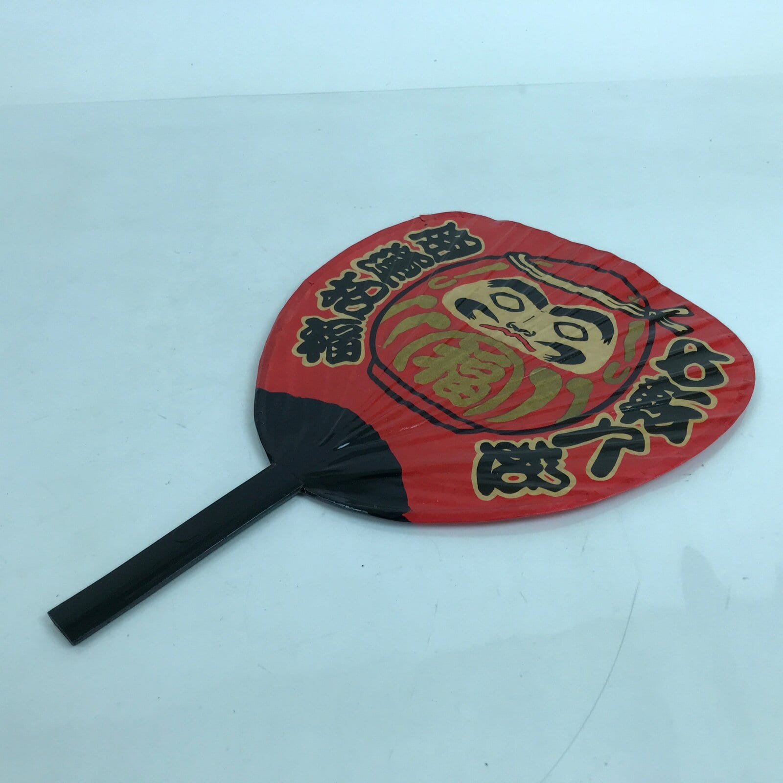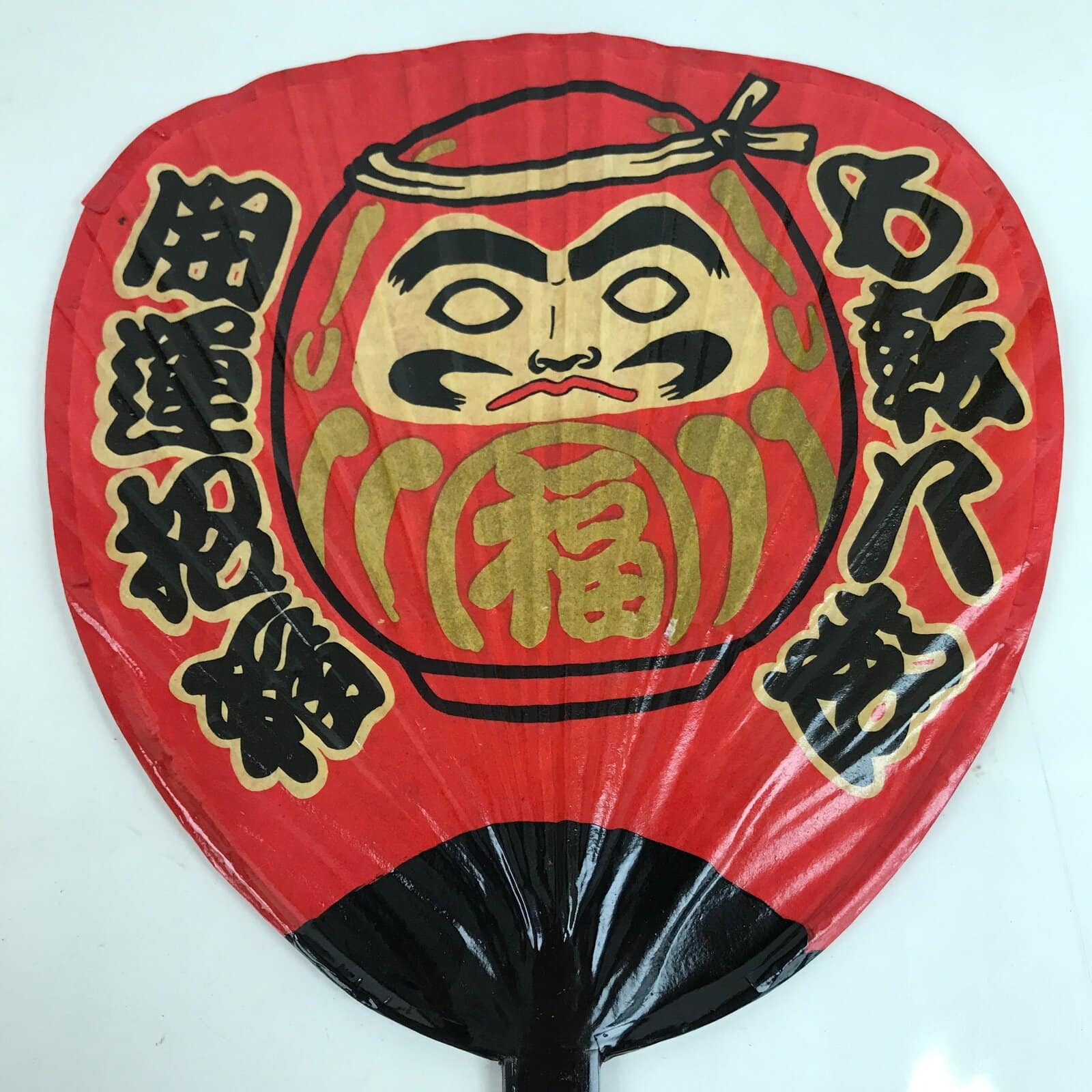 This is a Japanese vintage paper fan or Uchiwa. An uchiwa is a traditional fan tool typically made of wood or bamboo and paper in a flat paddle-like shape. This particular fan features a daruma doll with kanji on its sides. This lacquered paper uchiwa is red and black with gold and beige accents.