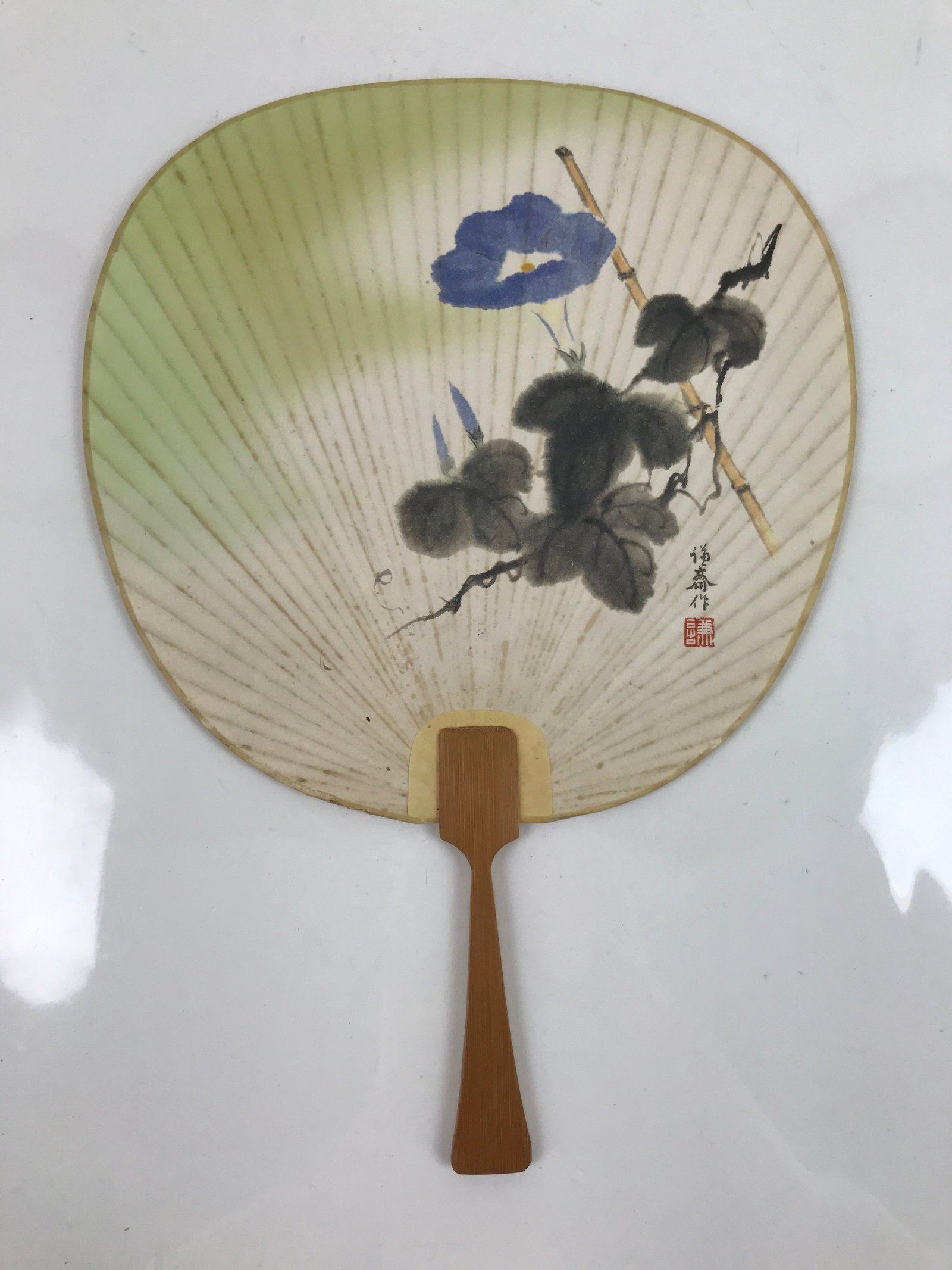 This is a Japanese vintage paper fan, or Uchiwa. An uchiwa is a traditional fan typically made of wood or bamboo and paper in a flat paddle-like shape. This particular fan features a vine of bright blue morning glories, with one in full bloom and two more buds. It has a light green accent and a carved wooden handle.