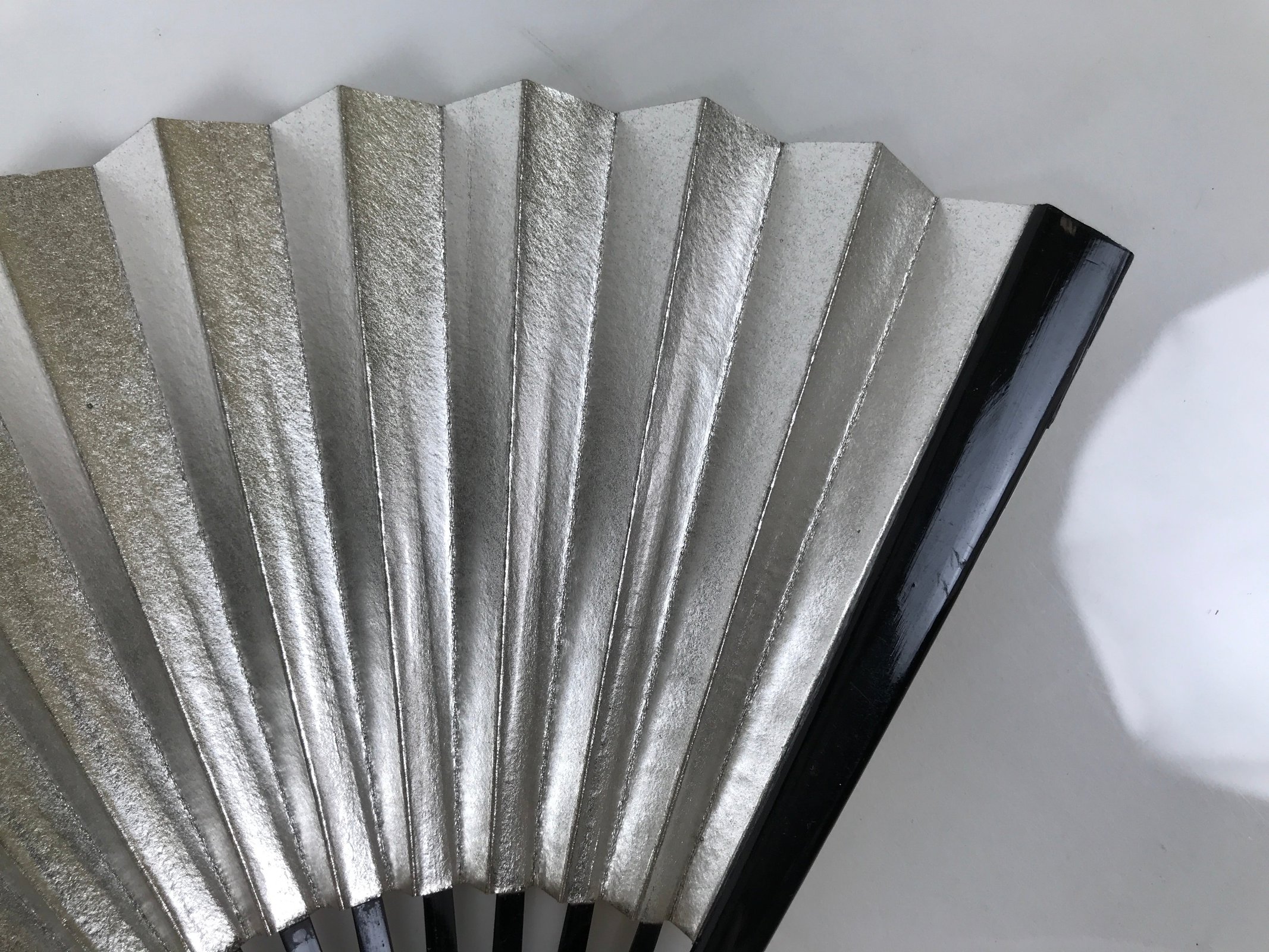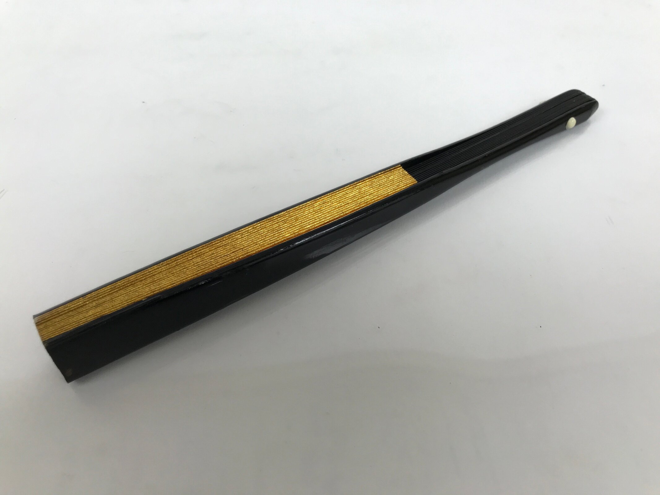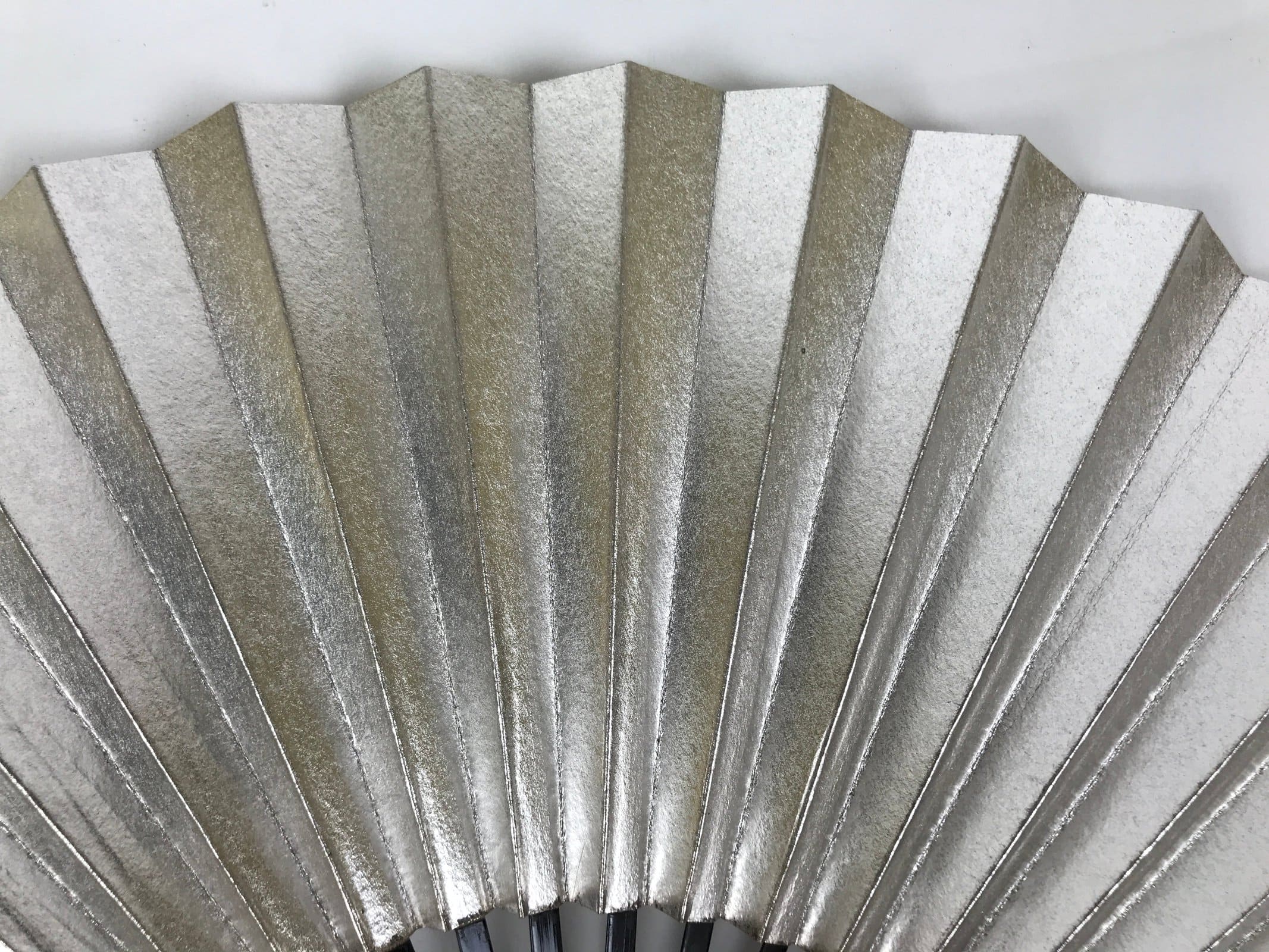 This is a traditional Japanese folding fan called sensu. You can use this when it’s hot or as decoration. This small decorative fan is a simple metallic gold foil paper on one side with no designs. The back is silver. The frame is natural bamboo and coated with shiny black lacquer. This is made for formal or ceremonial occasions, such as weddings, and is carried by women. The fan is small and also an excellent addition to tea ceremony sets or for small displays.