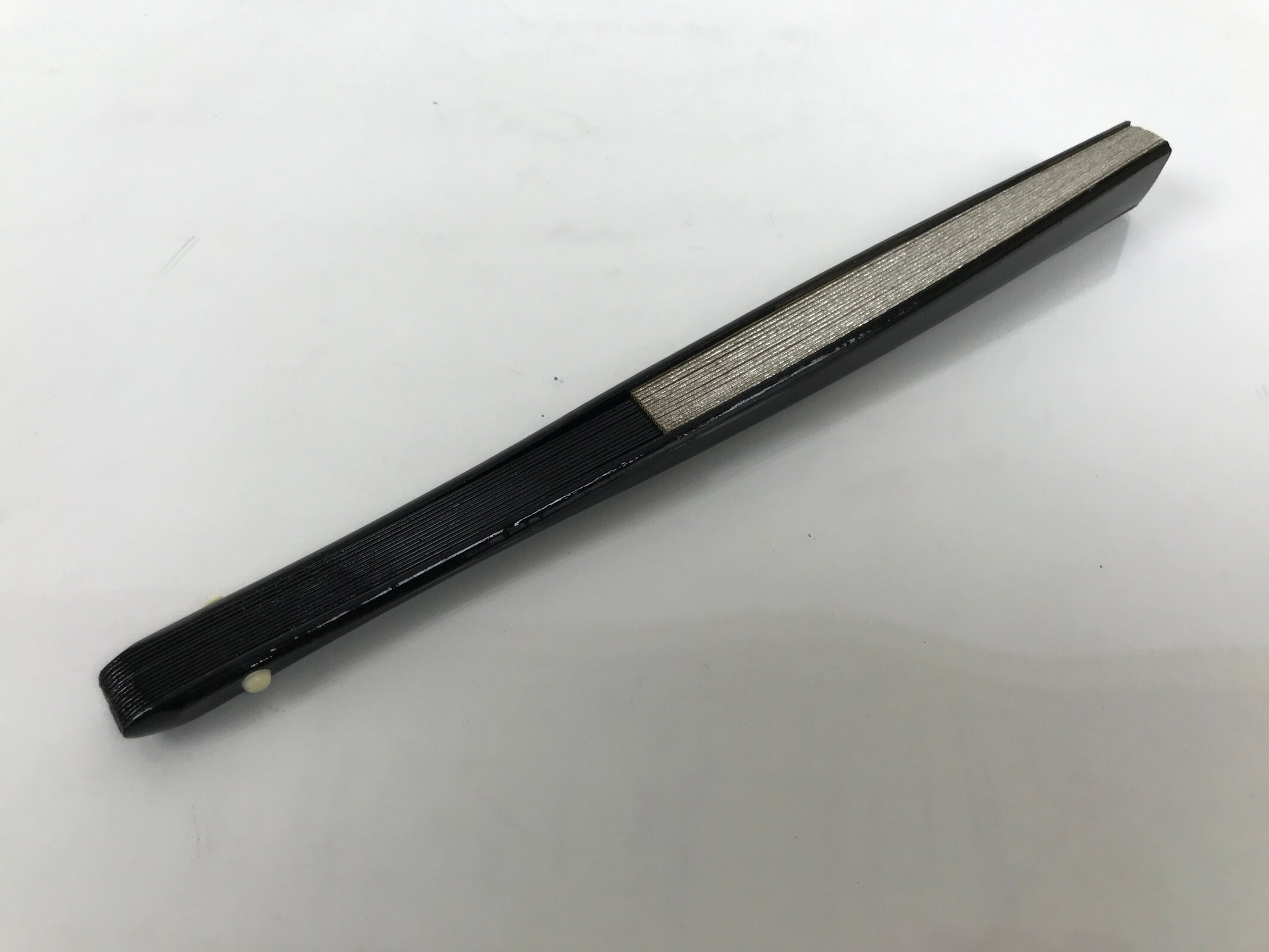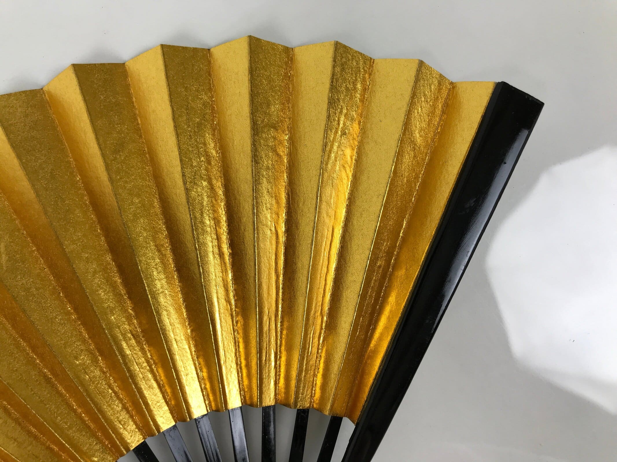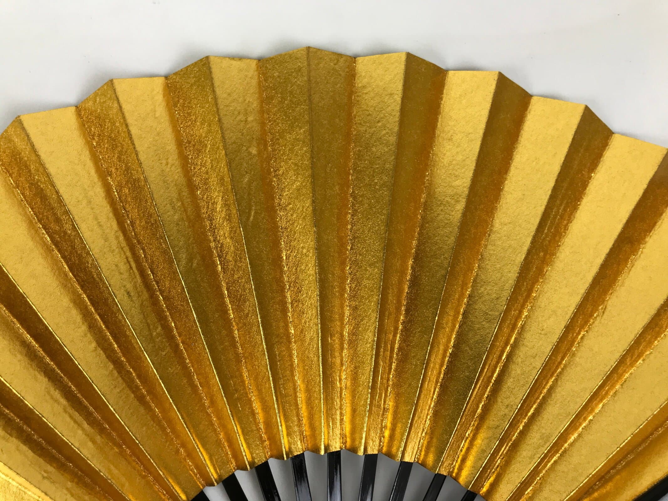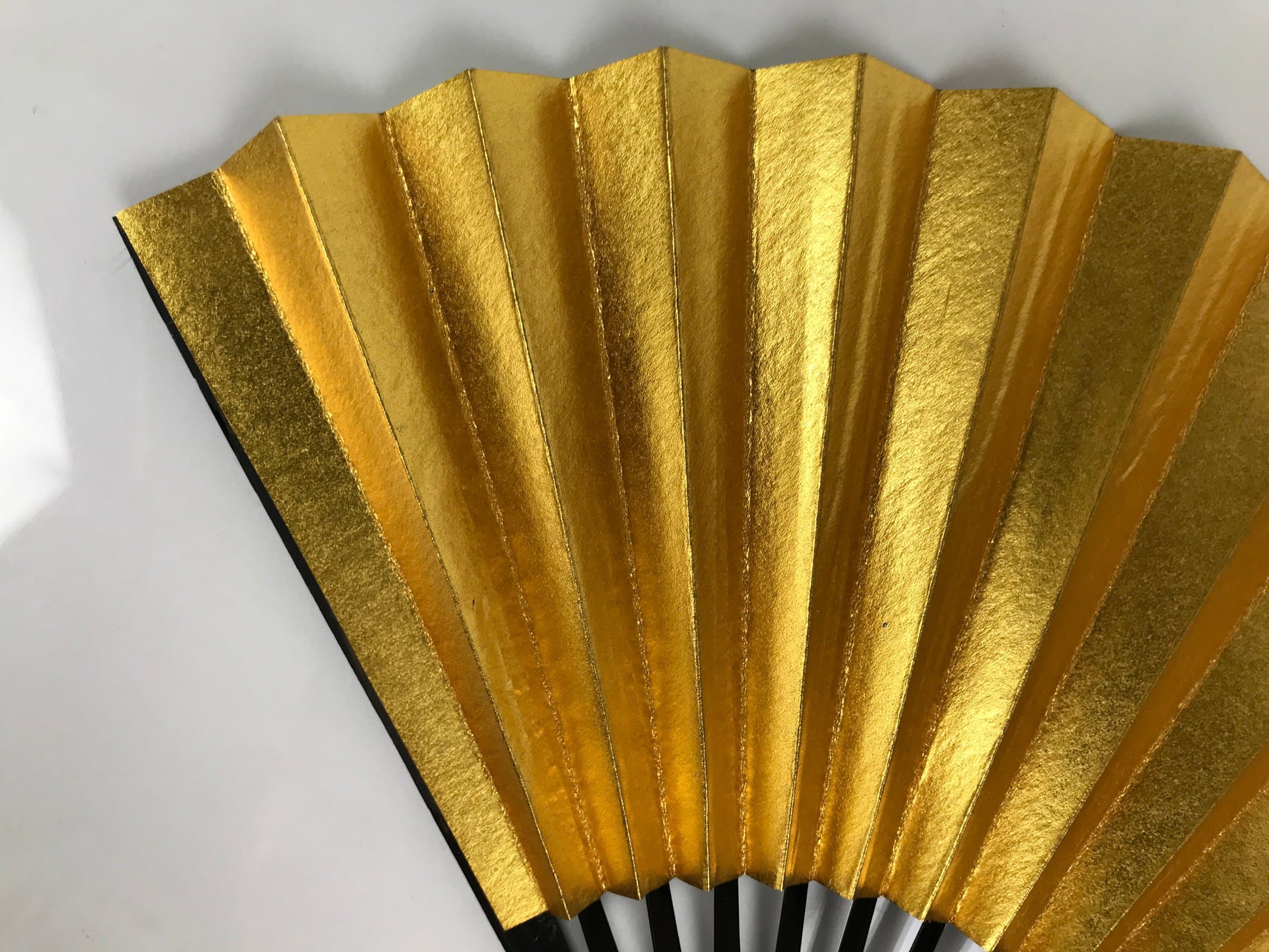 This is a traditional Japanese folding fan called sensu. You can use this when it’s hot or as decoration. This small decorative fan is a simple metallic gold foil paper on one side with no designs. The back is silver. The frame is natural bamboo and coated with shiny black lacquer. This is made for formal or ceremonial occasions, such as weddings, and is carried by women. The fan is small and also an excellent addition to tea ceremony sets or for small displays.