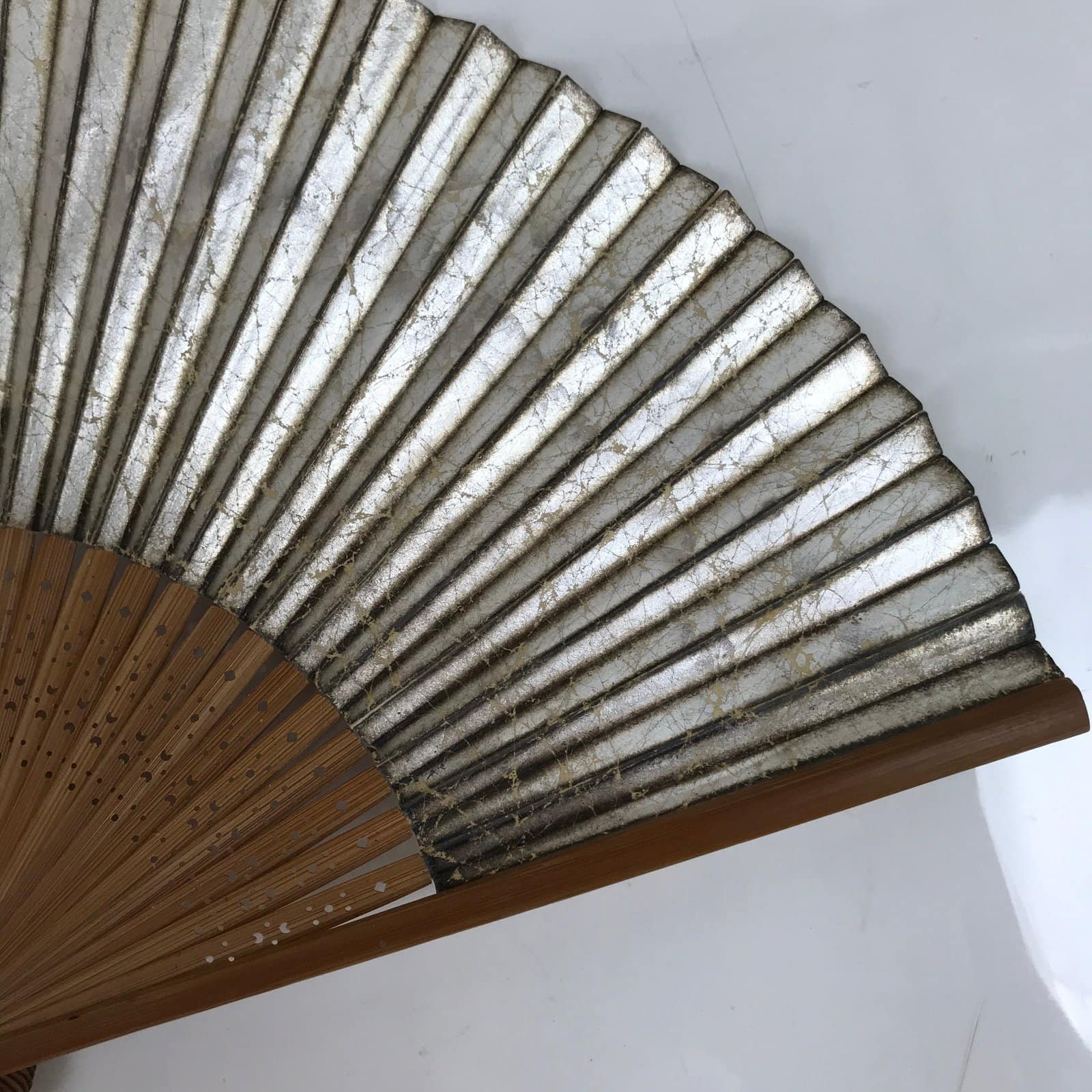 This is a traditional Japanese folding fan called sensu. You can use this when it’s hot or as decoration. This fan is made of a natural bamboo frame. One side is beige with gold and silver flowers while the back side is all silver with a tiny Japanese flag in the bottom left.