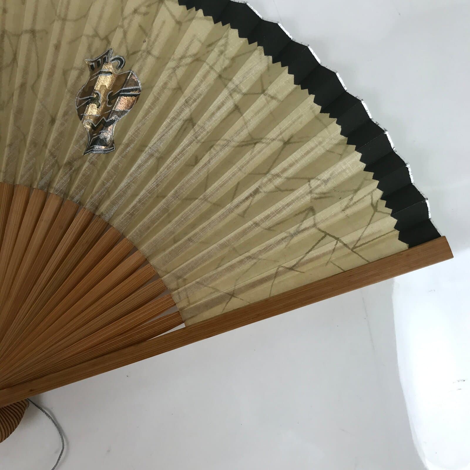 This is a traditional Japanese folding fan called sensu. You can use this when it’s hot or as decoration. This fan is made of a natural bamboo frame. The front side is a matte beige with a crackle pattern and a dark gray top border with silver. The feature of this design are two pottery vases in gold and silver. There is a gray string attached to the bottom with a green bead.